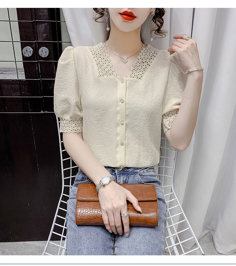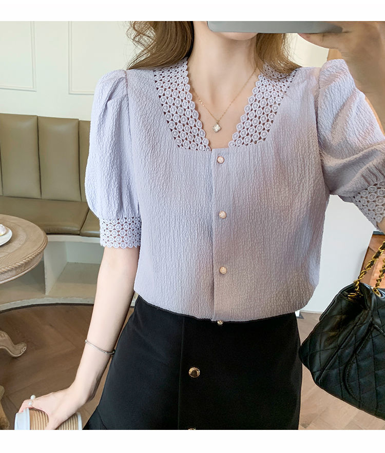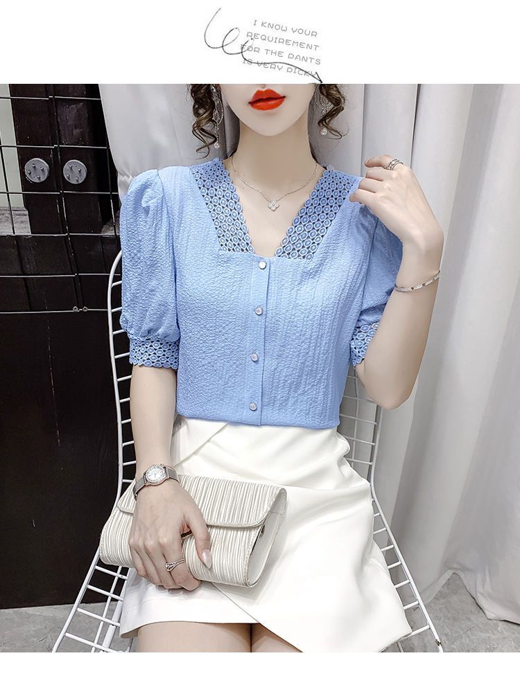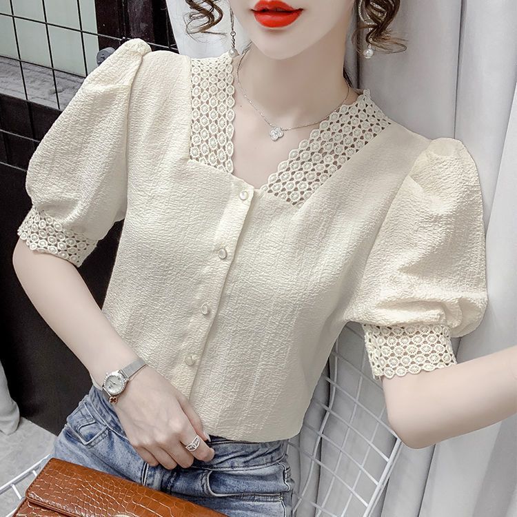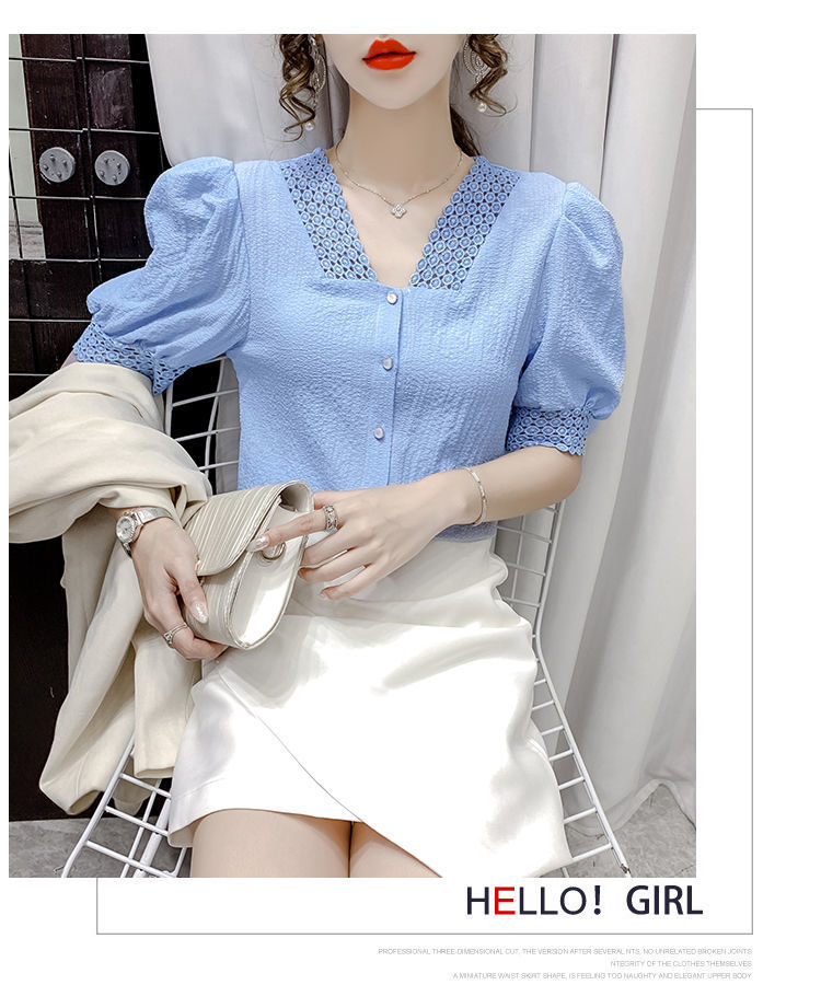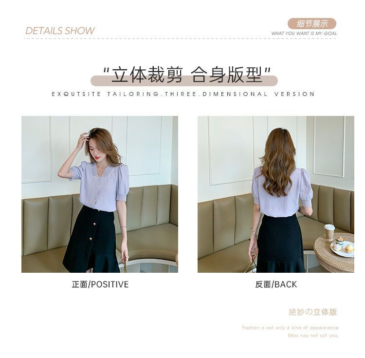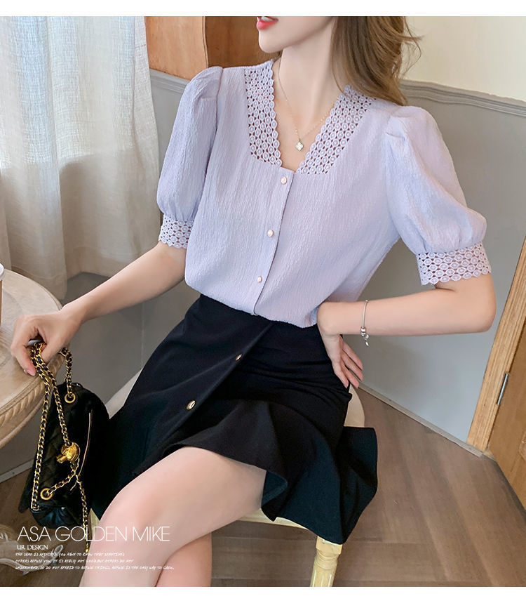 2023 중공 레이스 V-넥 디자인 틈새 셔츠 여성용 여름 얇은 반팔 프렌치 스위트 쉬폰 탑