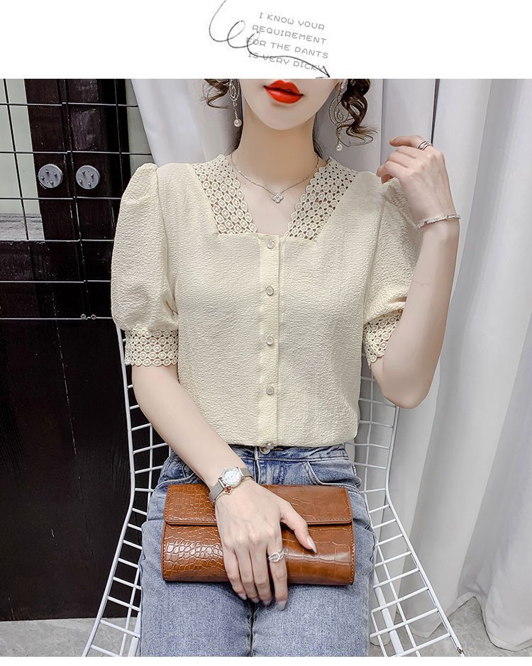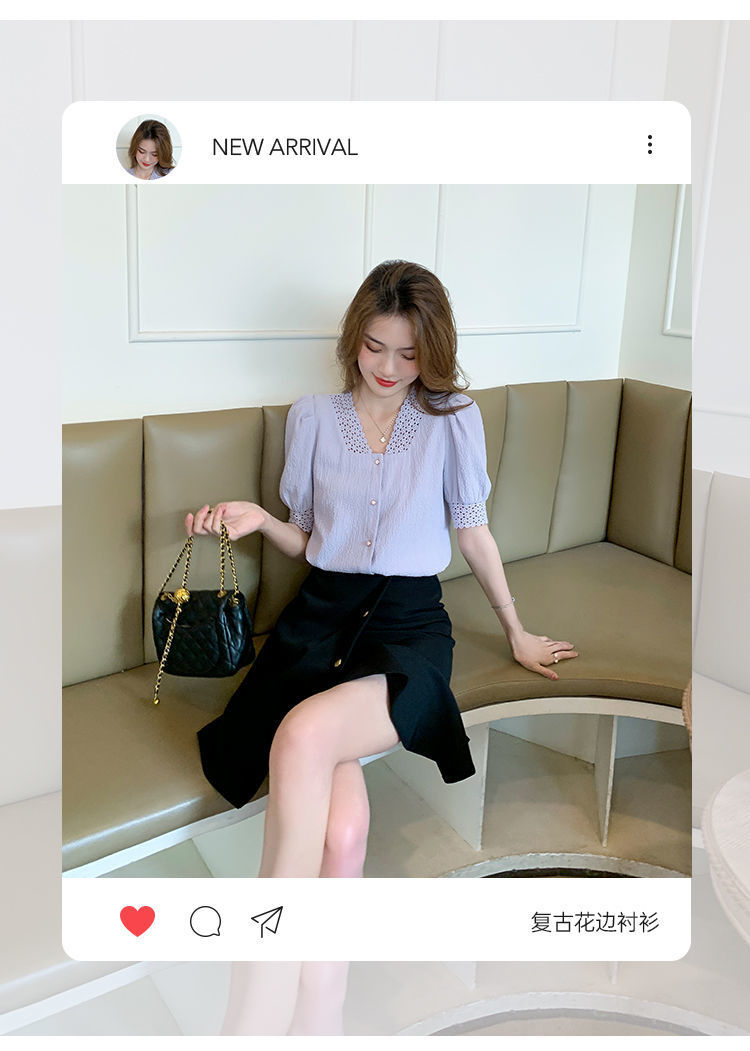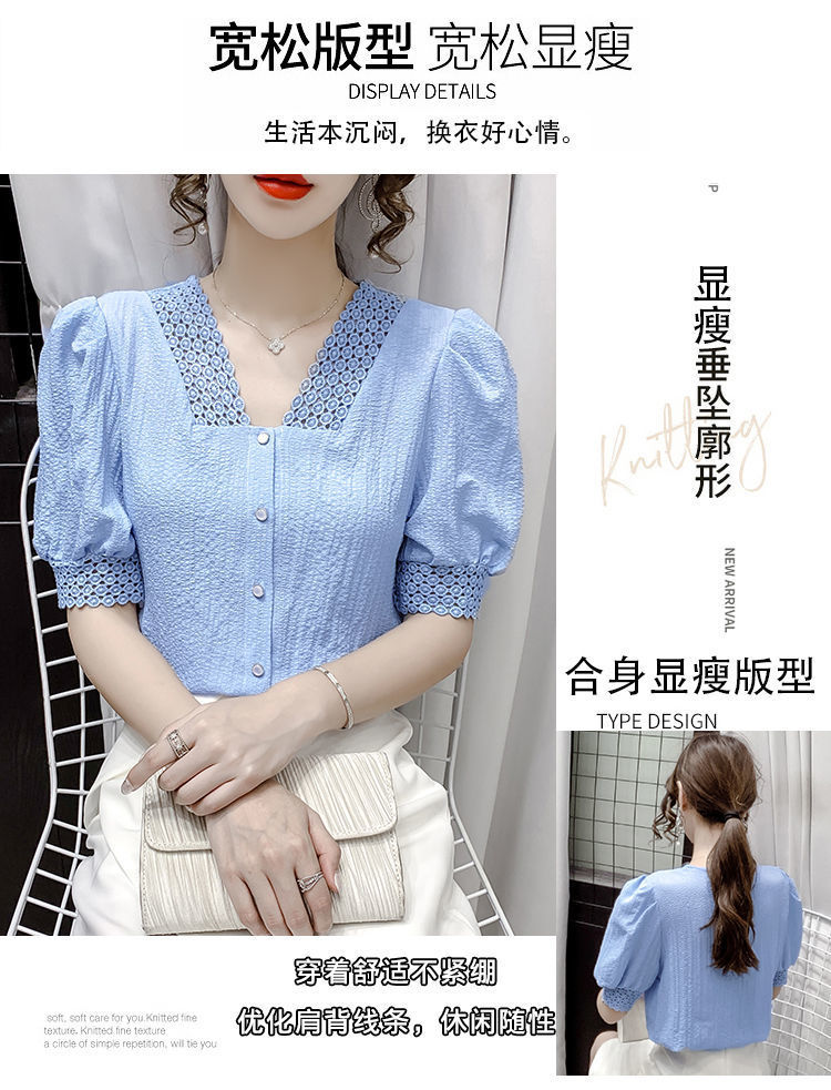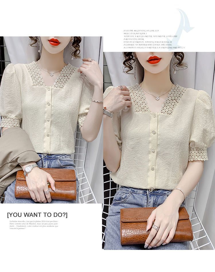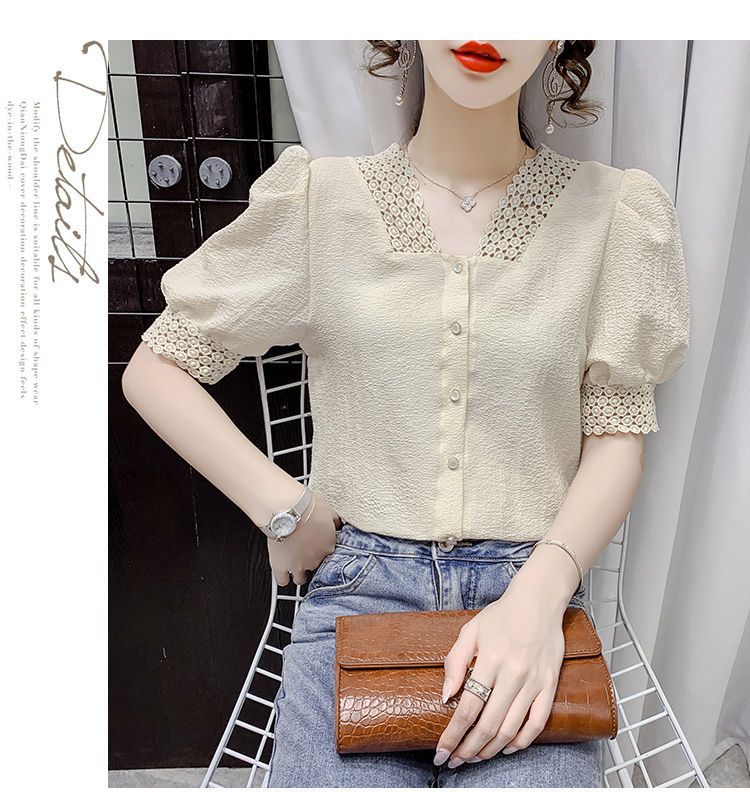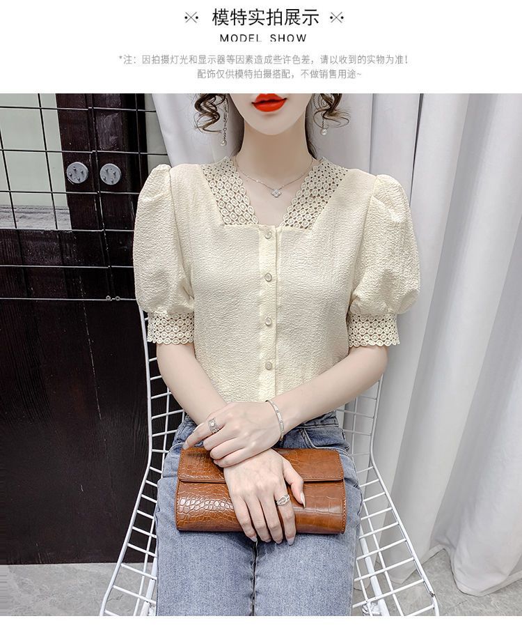 2023 중공 레이스 V-넥 디자인 틈새 셔츠 여성용 여름 얇은 반팔 프렌치 스위트 쉬폰 탑
