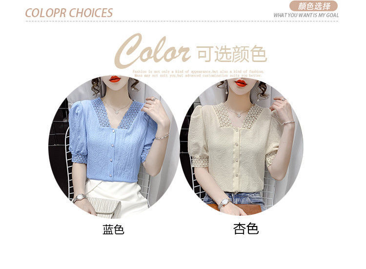 2023 중공 레이스 V-넥 디자인 틈새 셔츠 여성용 여름 얇은 반팔 프렌치 스위트 쉬폰 탑스토어 가기
