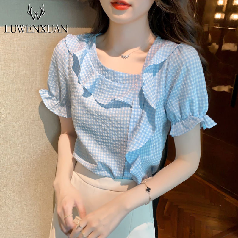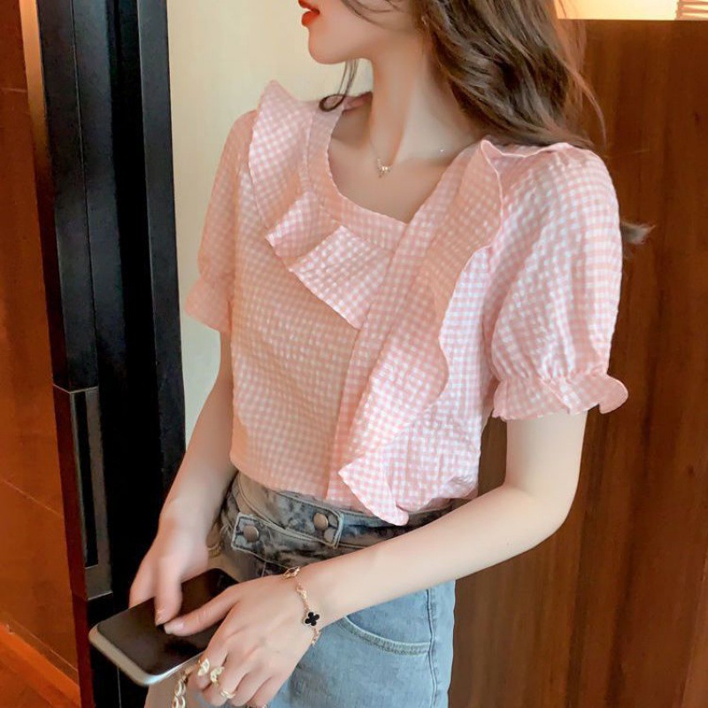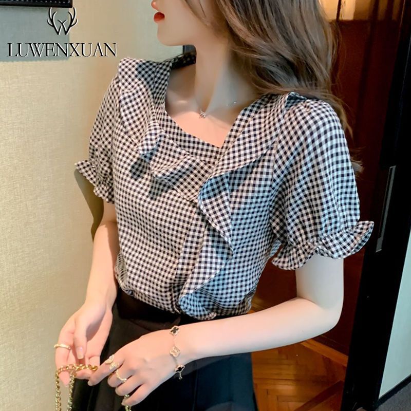 수출 대외 무역 격자 무늬 쉬폰 셔츠 여자의 여름 새로운 반팔 나이 감소 달콤한 넥타이 옷 여자의 여름이 아닙니다스토어 가기