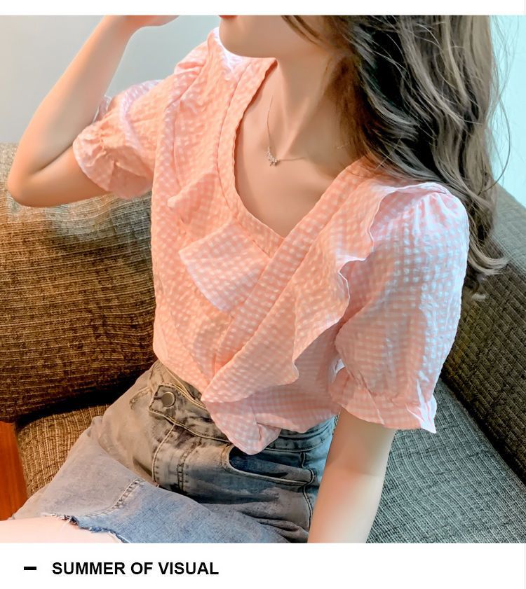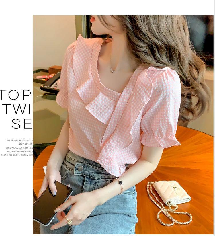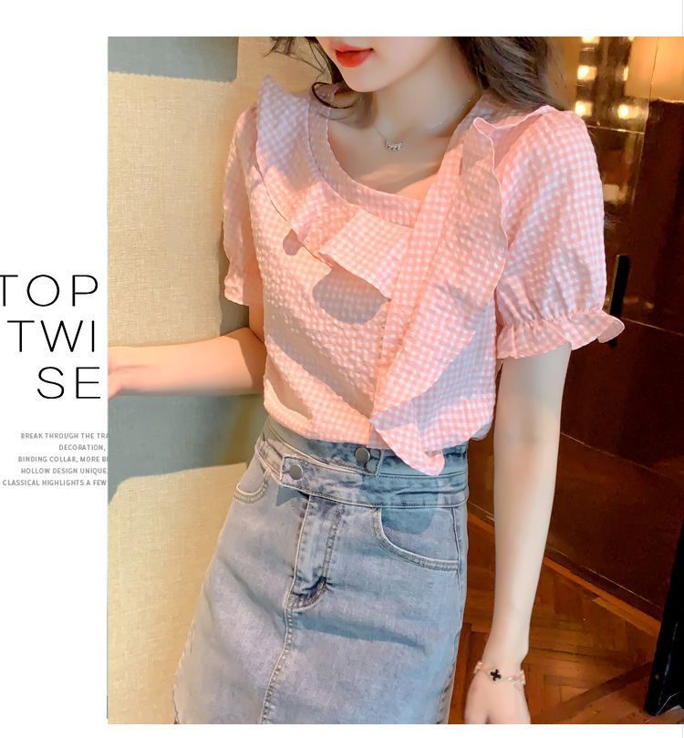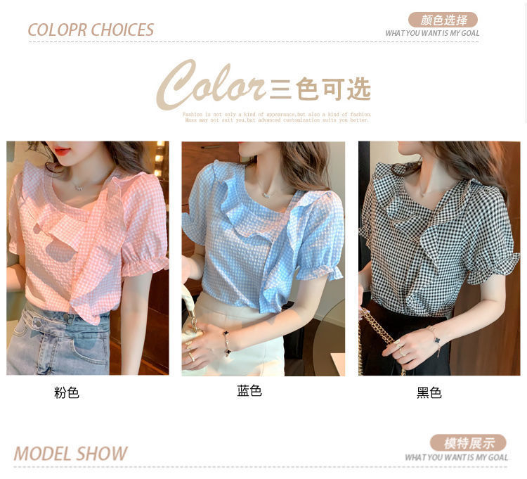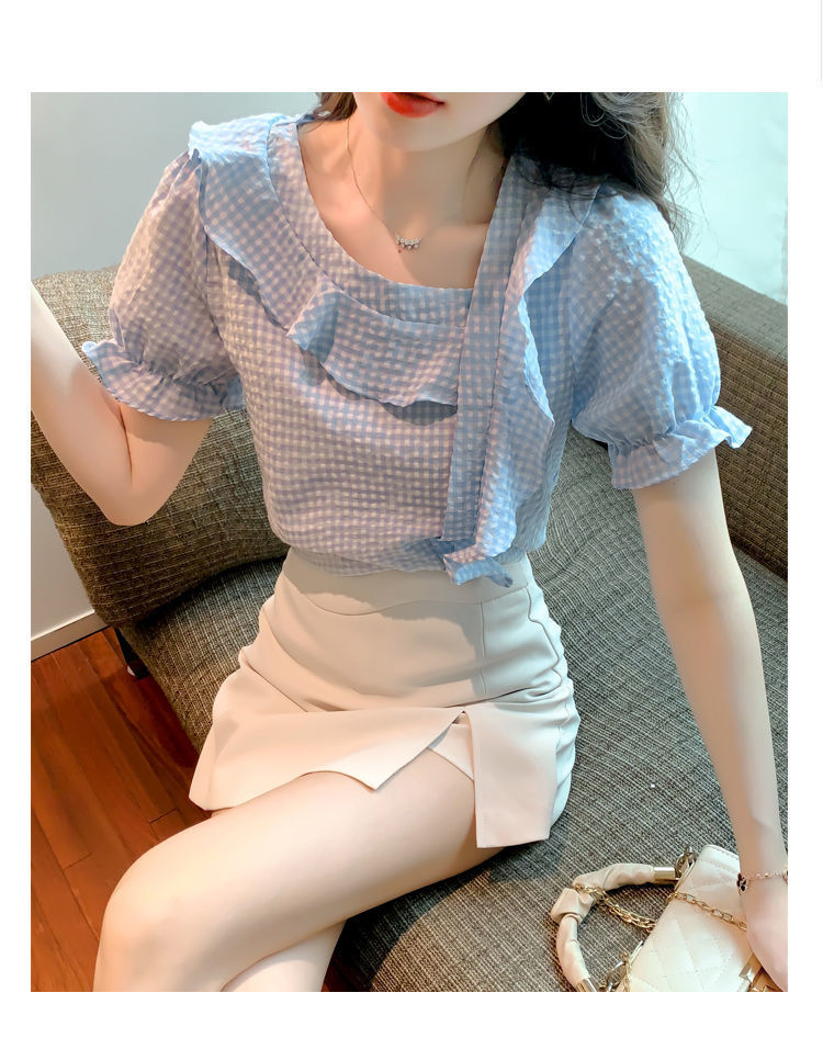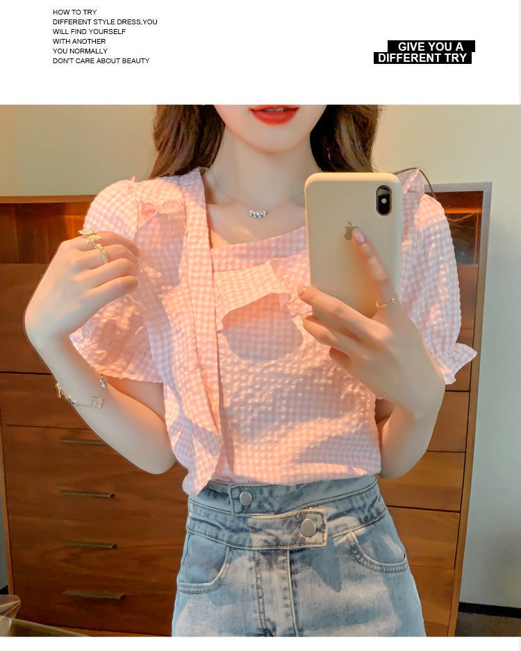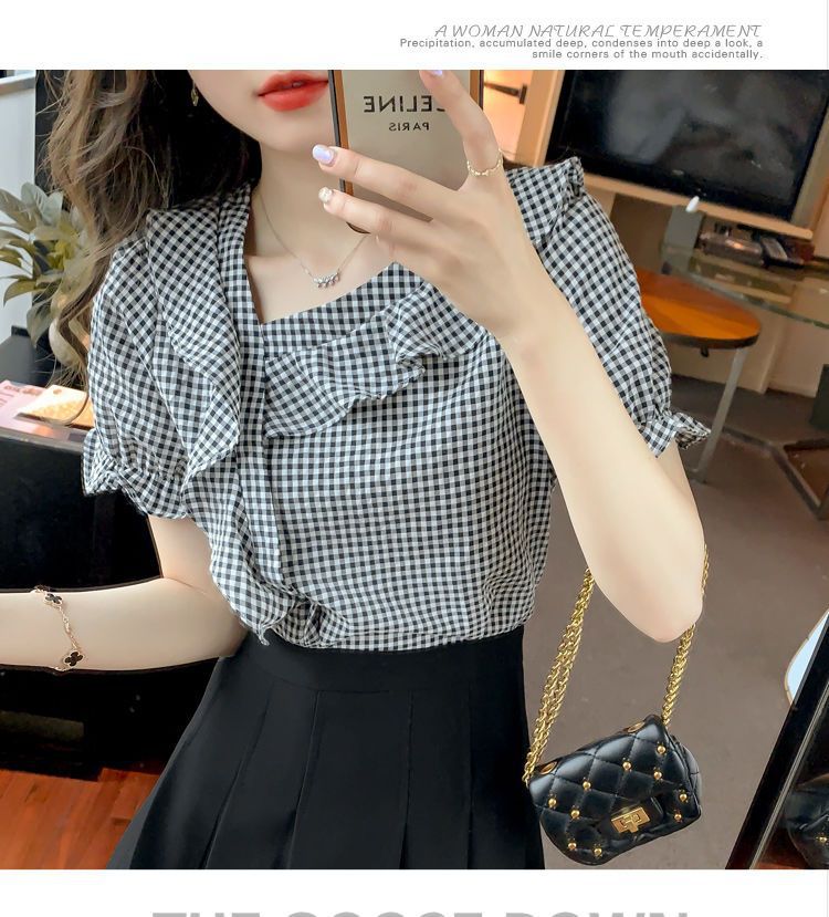 수출 대외 무역 격자 무늬 쉬폰 셔츠 여자의 여름 새로운 반팔 나이 감소 달콤한 넥타이 옷 여자의 여름이 아닙니다