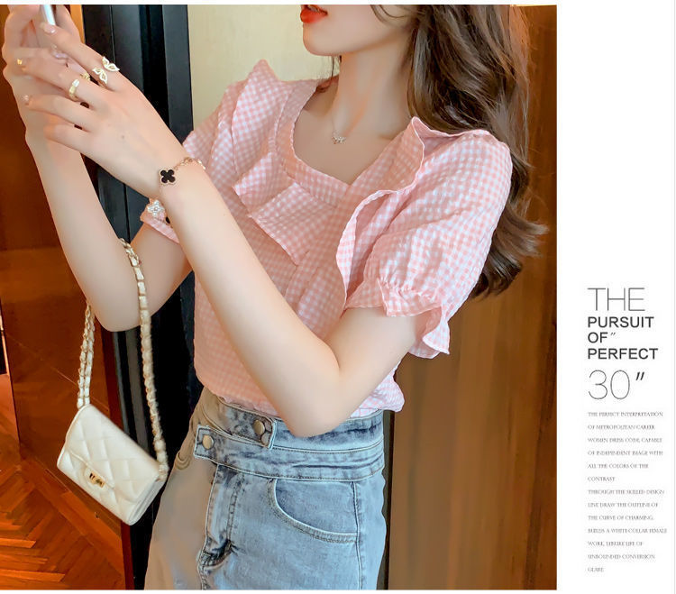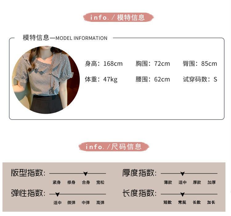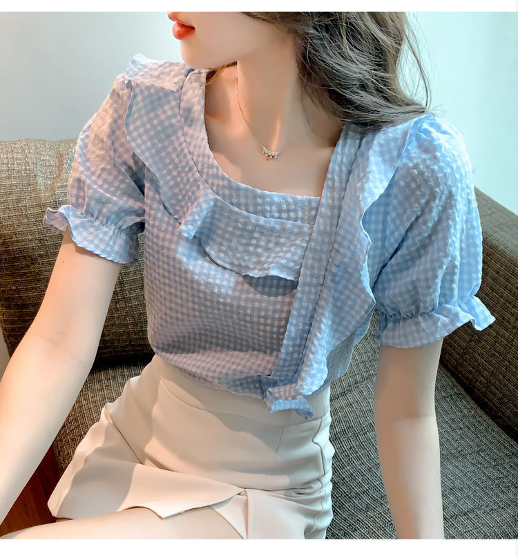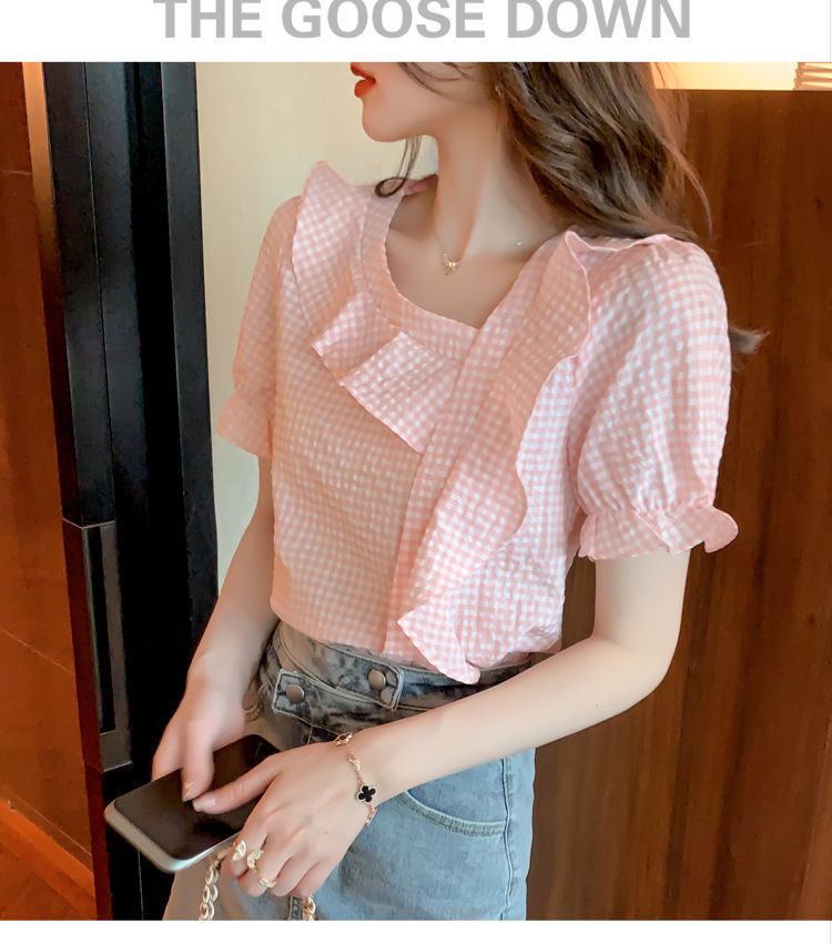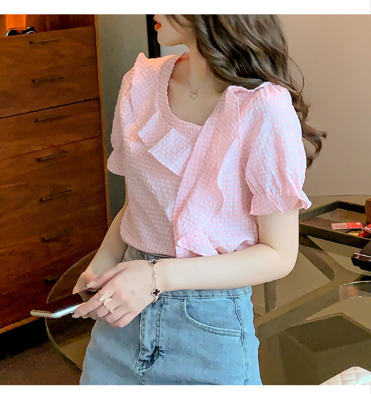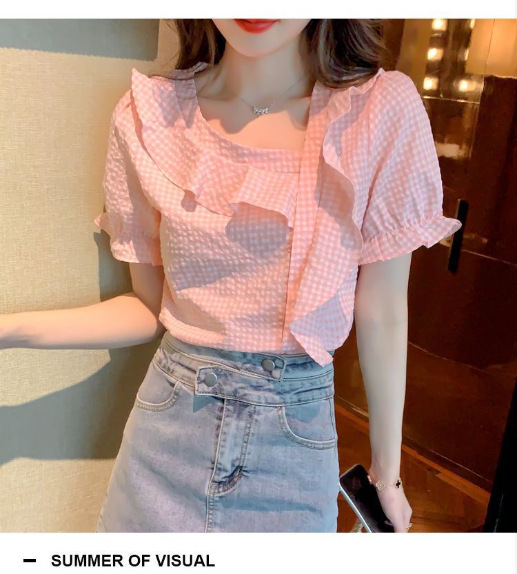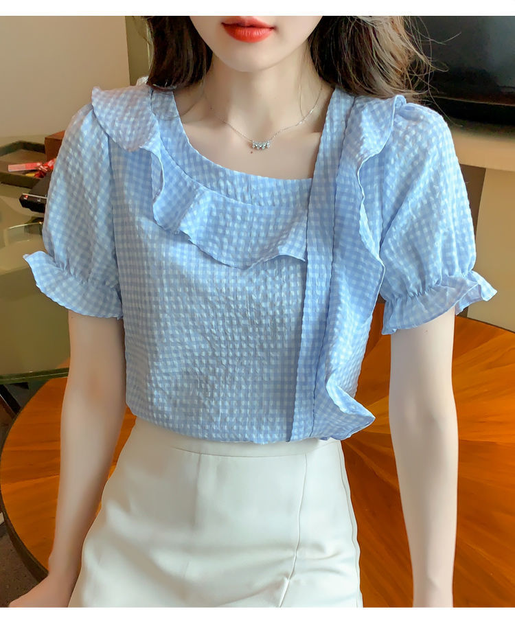 수출 대외 무역 격자 무늬 쉬폰 셔츠 여자의 여름 새로운 반팔 나이 감소 달콤한 넥타이 옷 여자의 여름이 아닙니다