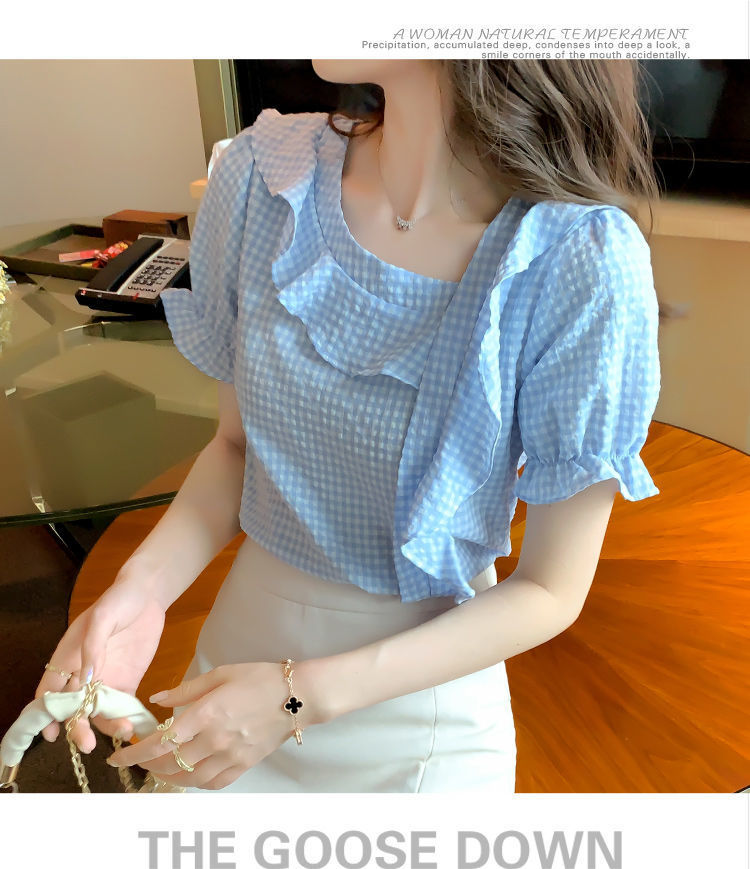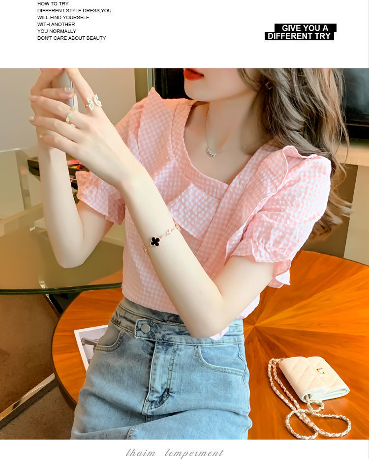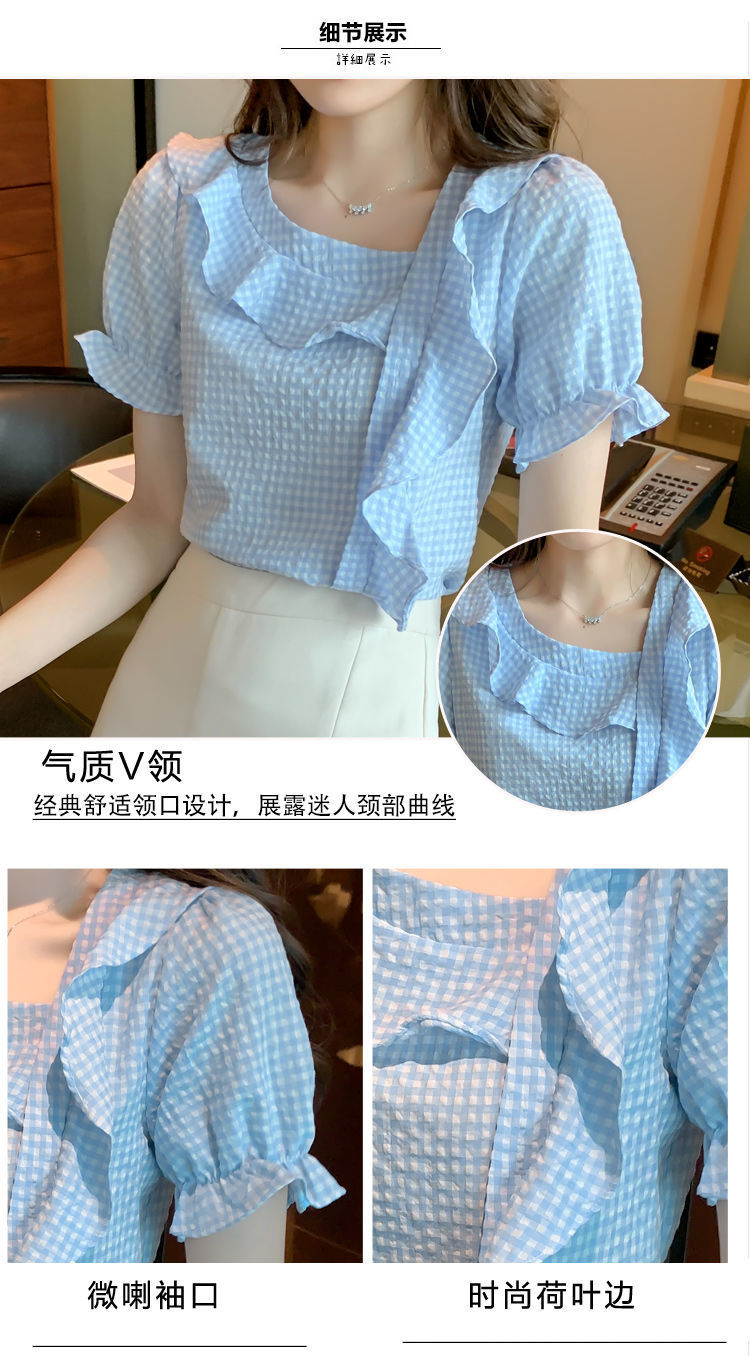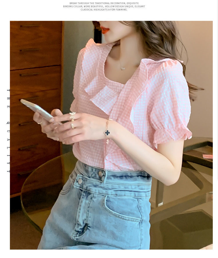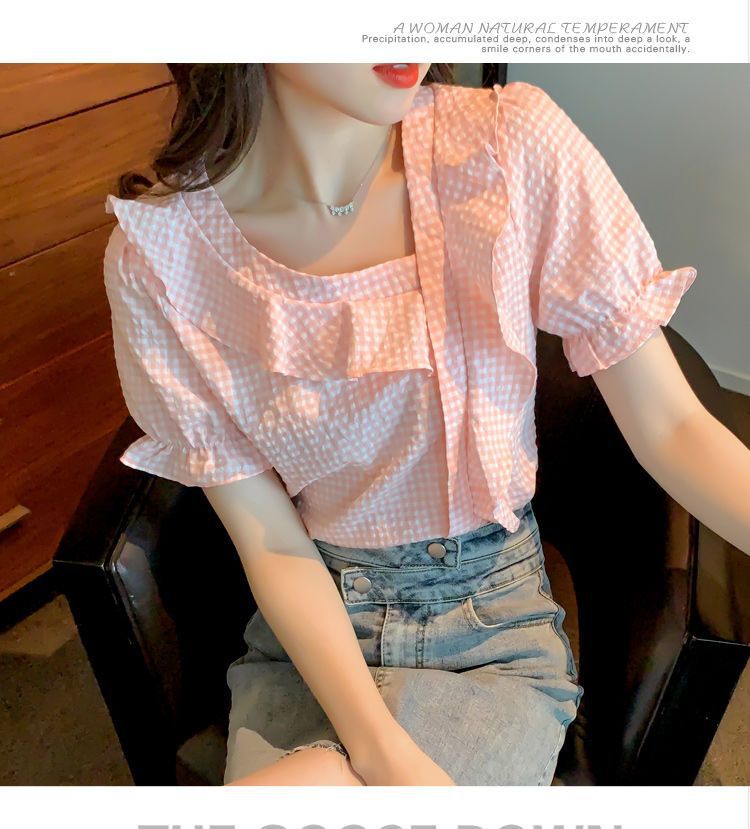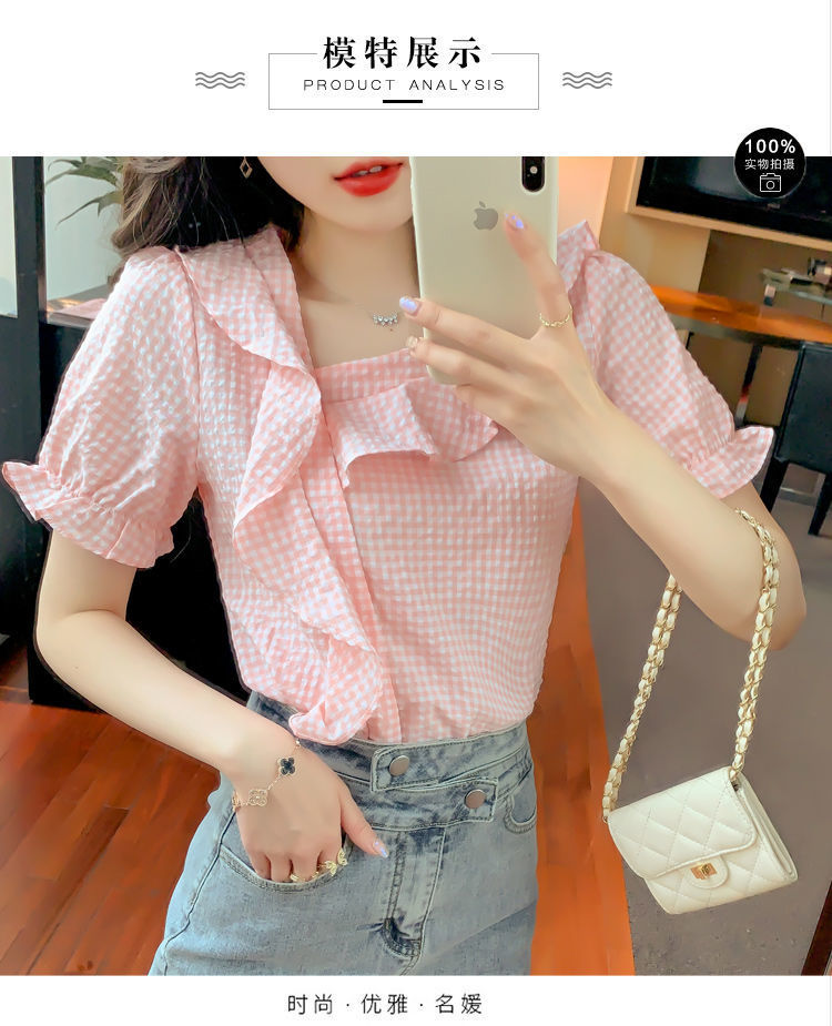 수출 대외 무역 격자 무늬 쉬폰 셔츠 여자의 여름 새로운 반팔 나이 감소 달콤한 넥타이 옷 여자의 여름이 아닙니다