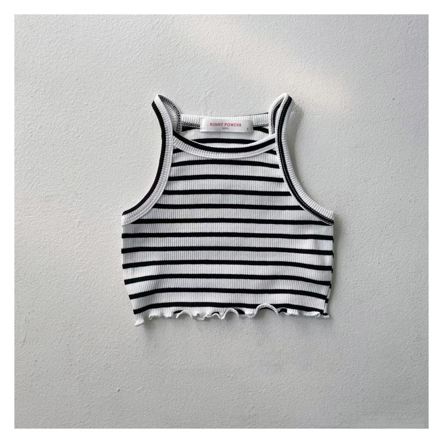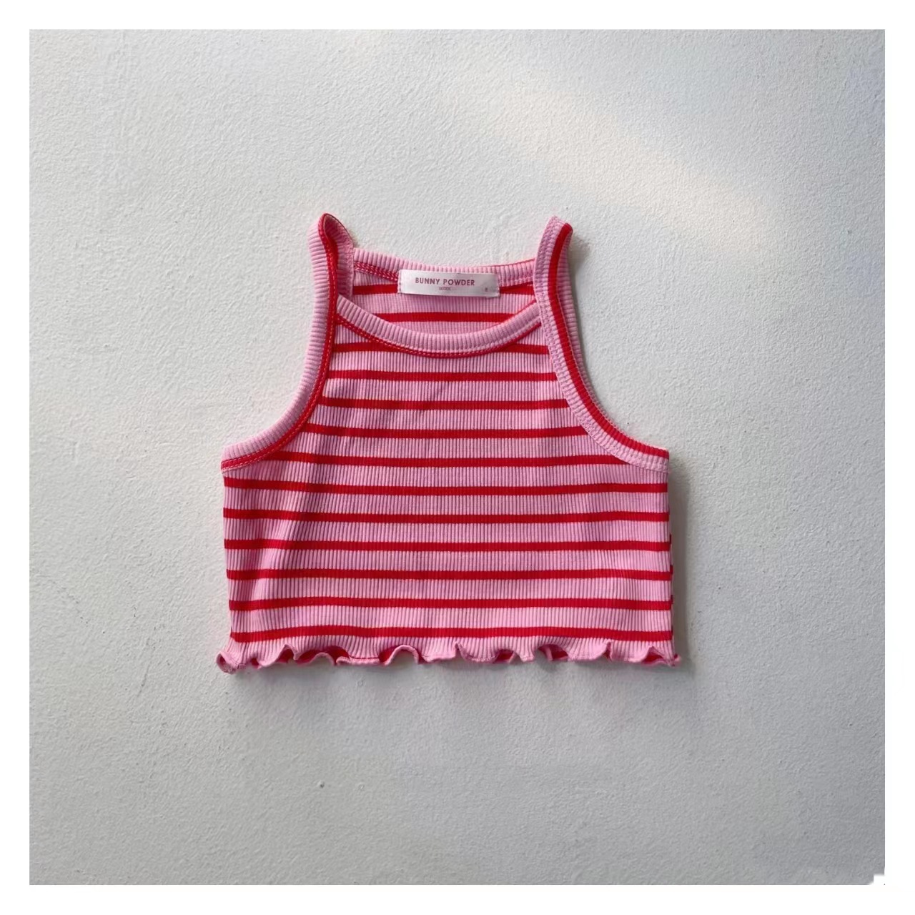 여름 여아, 중대형 아동용 대비색 줄무늬 조끼, 소매 없는 멜빵, 여아용 컬러풀한 스레드 반바지의 새로운 한국어 버전스토어 가기