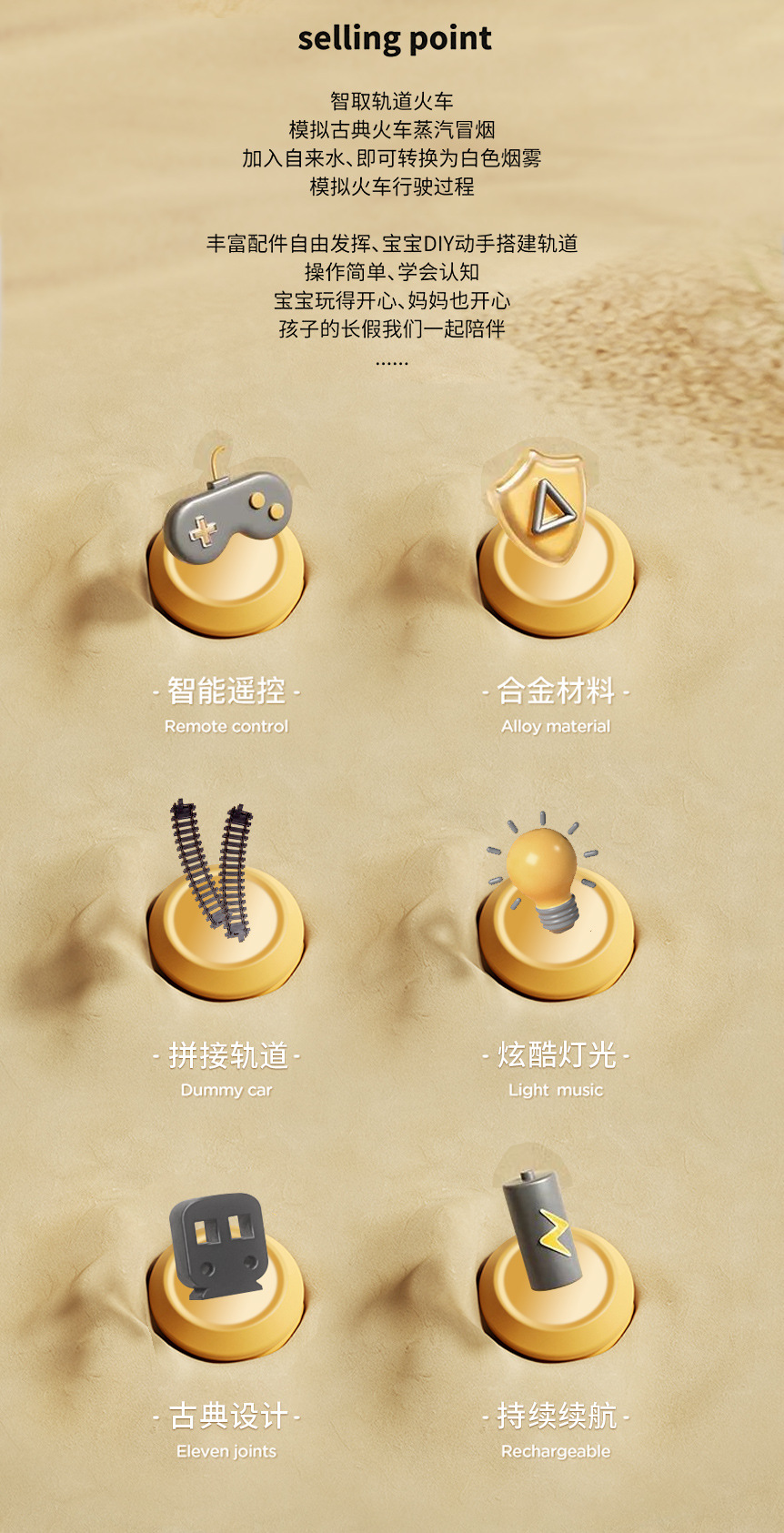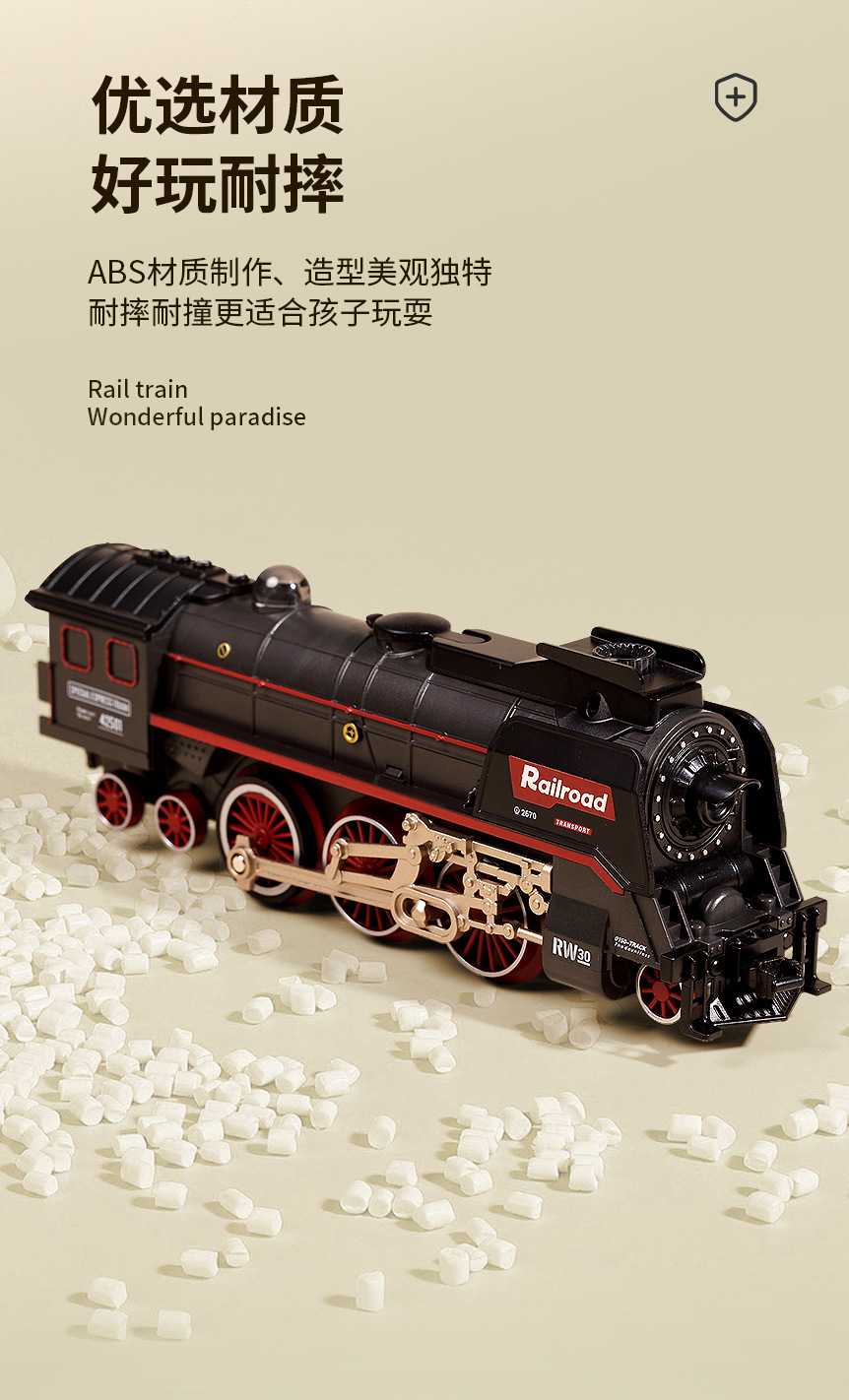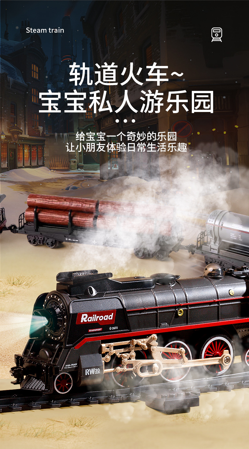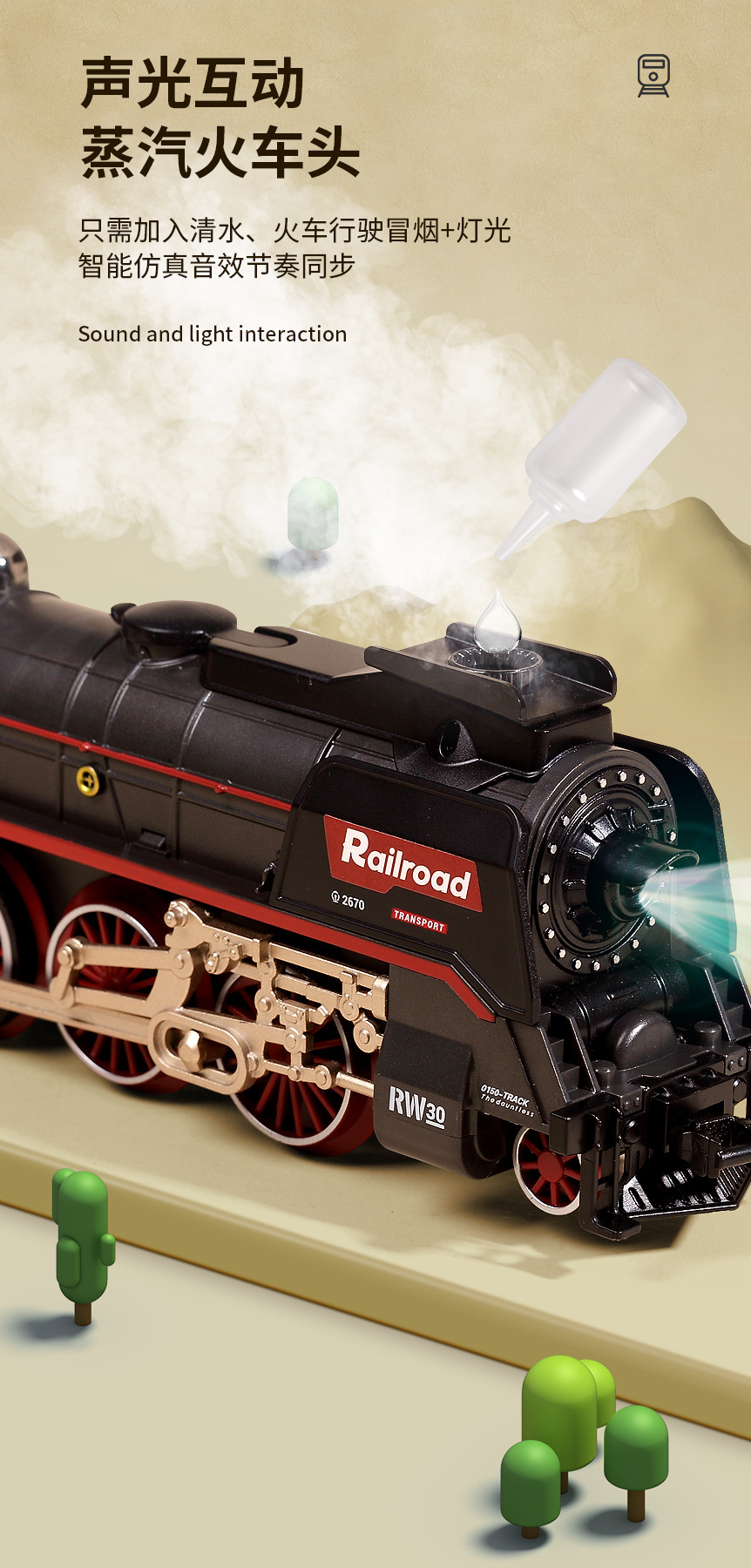 3处喷雾冒烟功能,智能仿真喷雾,前进/后退,静音,喷雾开关功能,2处灯光,仿真音效,鸣笛。配置:1车头+4节车厢