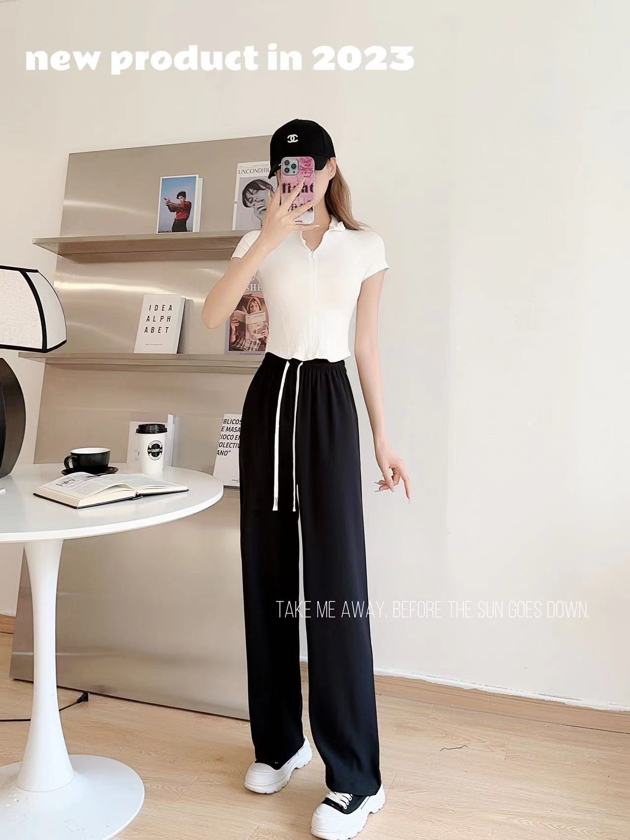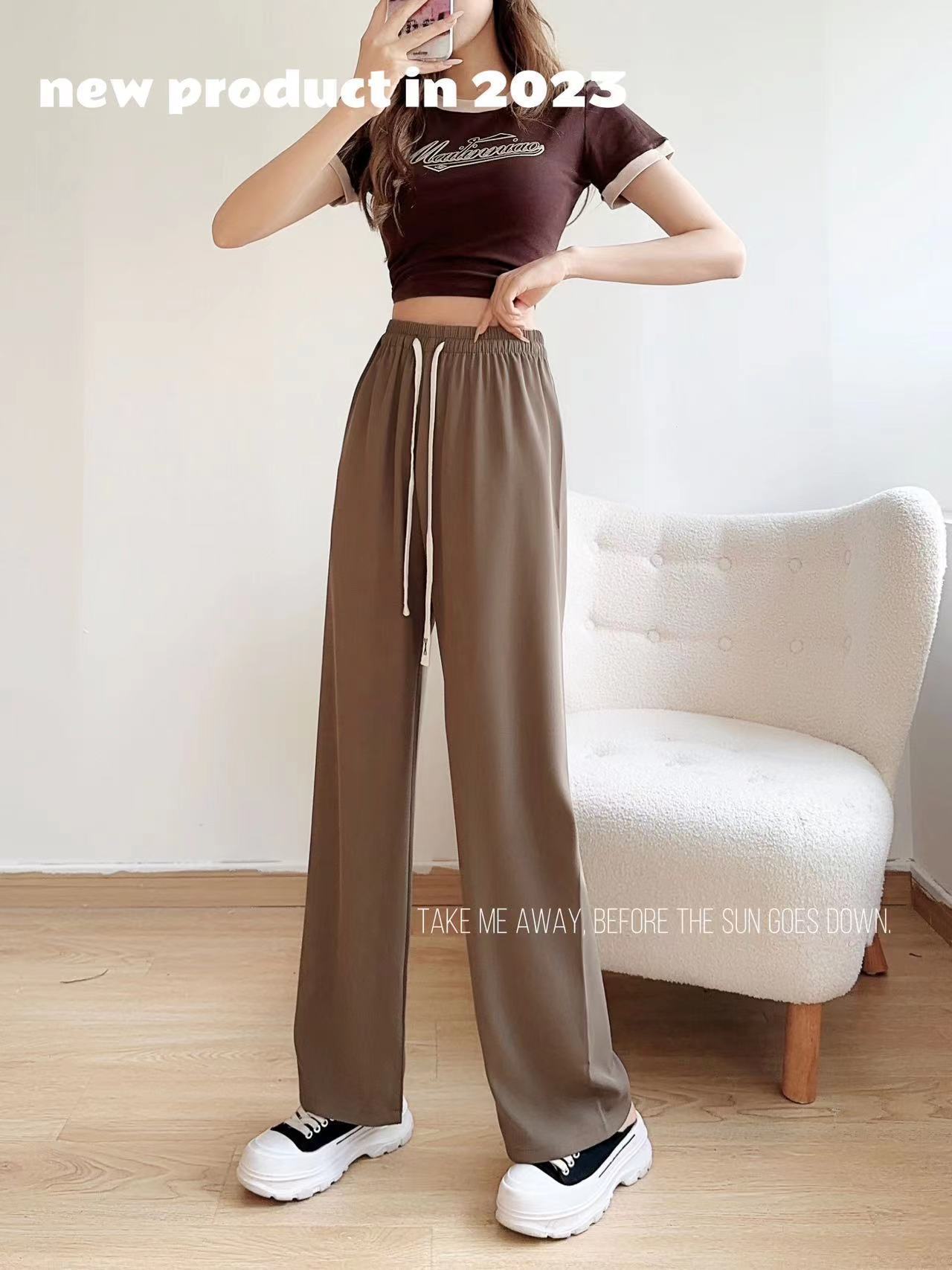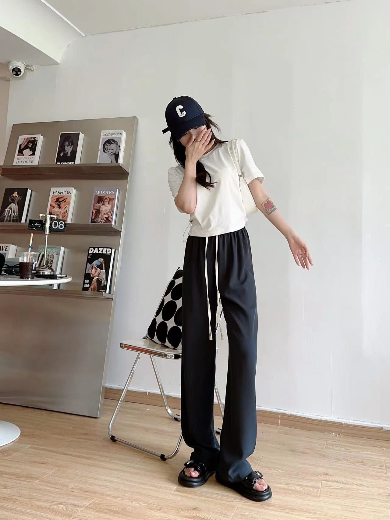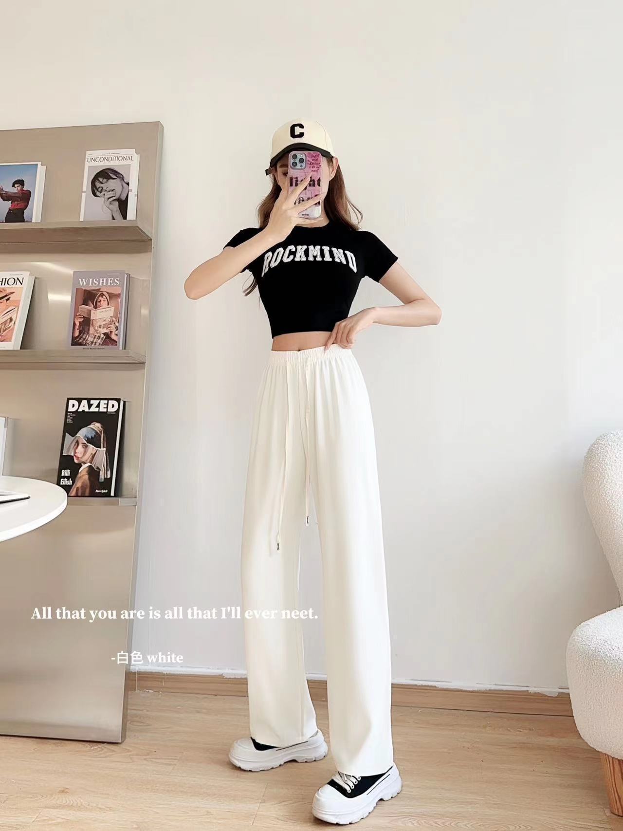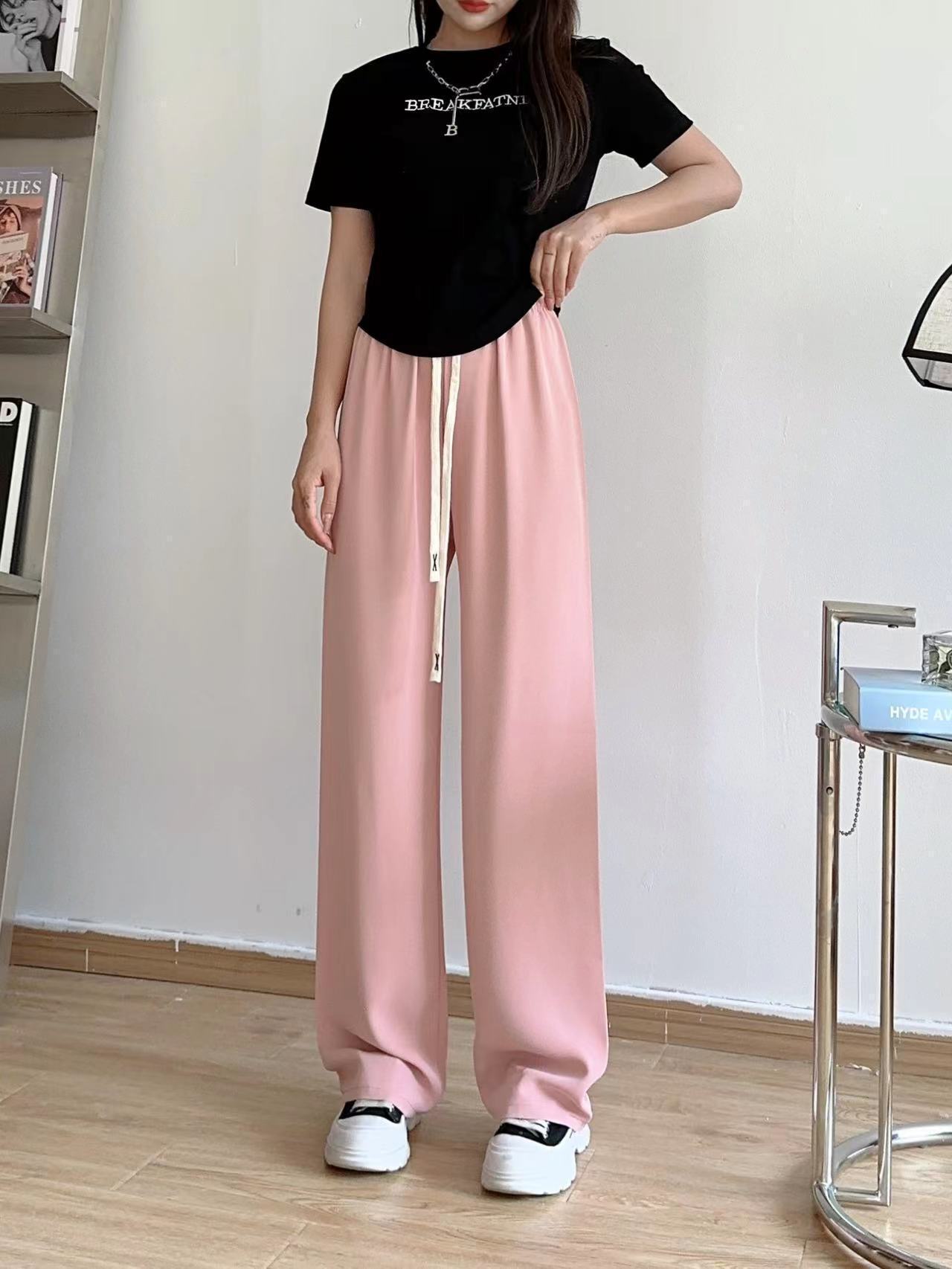 봄과 여름 단백질 실크 마카롱 스트레이트 팬츠 하이 웨이스트 슬리밍 룩 여성용 키 큰 캐주얼 와이드 레그 팬츠스토어 가기