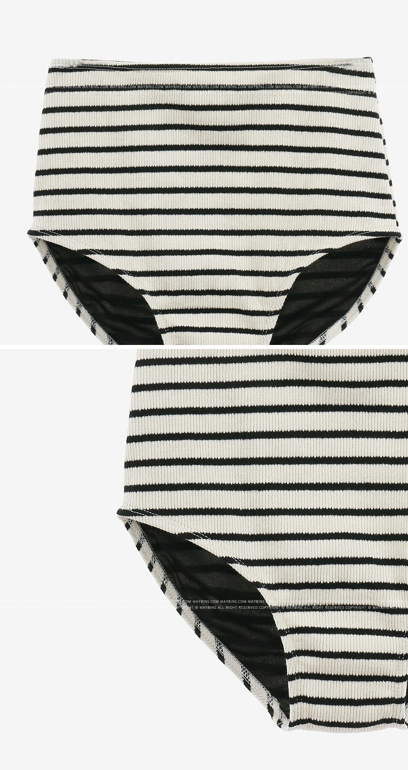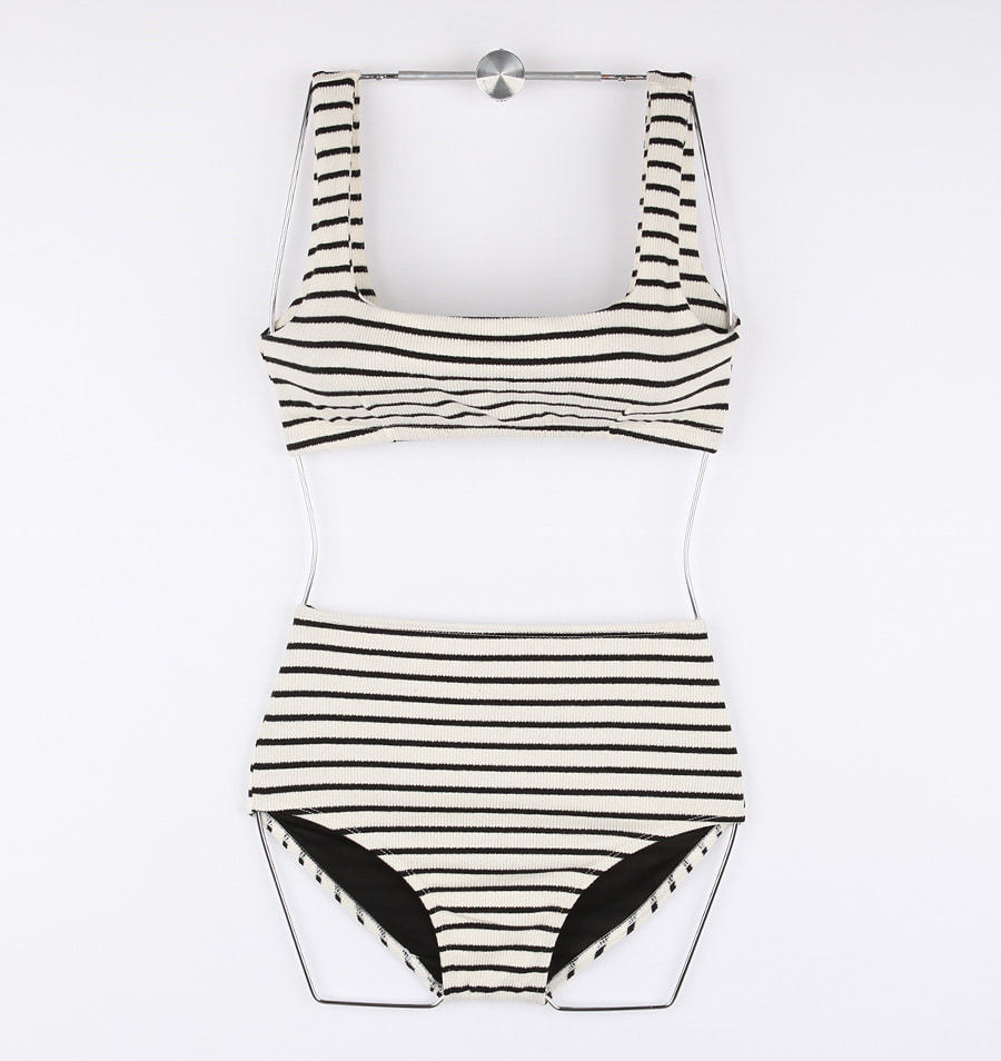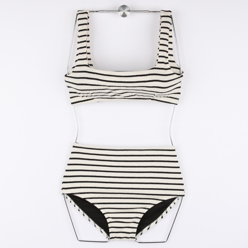 2023 한국 새로운 스타일 비키니 섹시한 등이없는 하이 웨이스트 배꼽 슬리밍 유행 흑백 스트라이프 분할 수영복 여성용스토어 가기