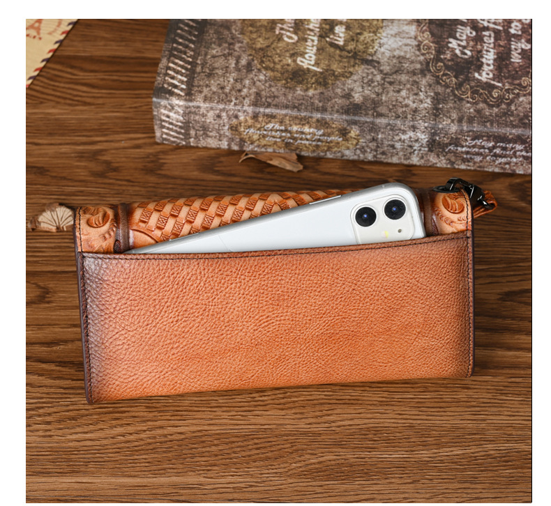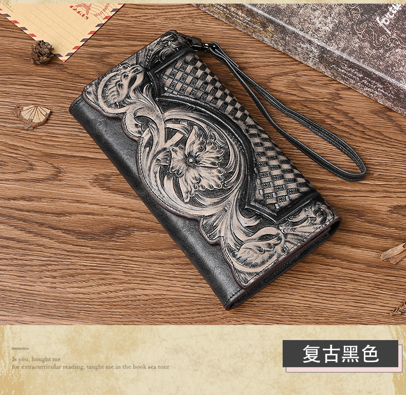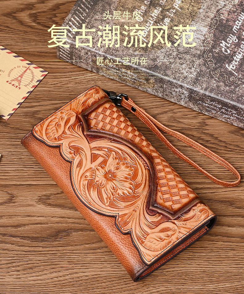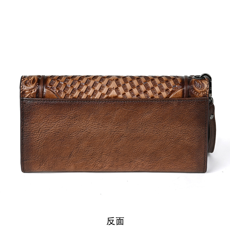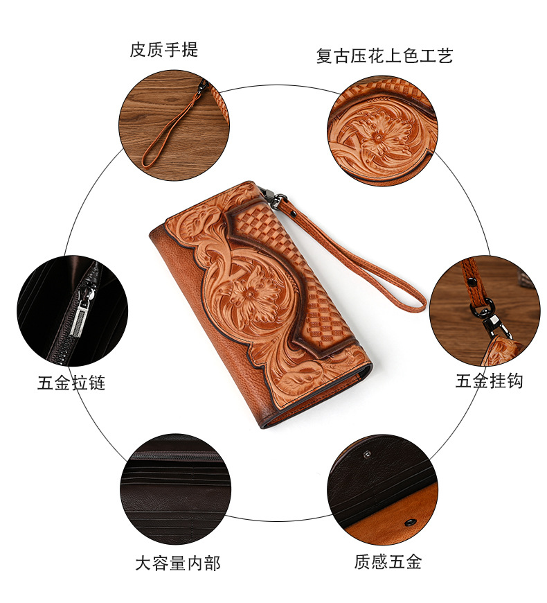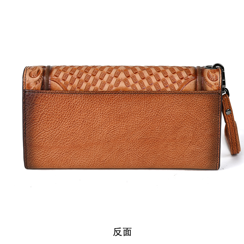 중국 스타일 양각 지갑 여성용 탑 레이어 소가죽 롱 패션 지갑 대용량 3 중 가방 빈티지 소형 핸드백
