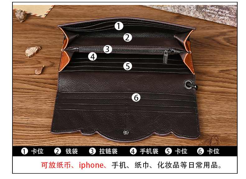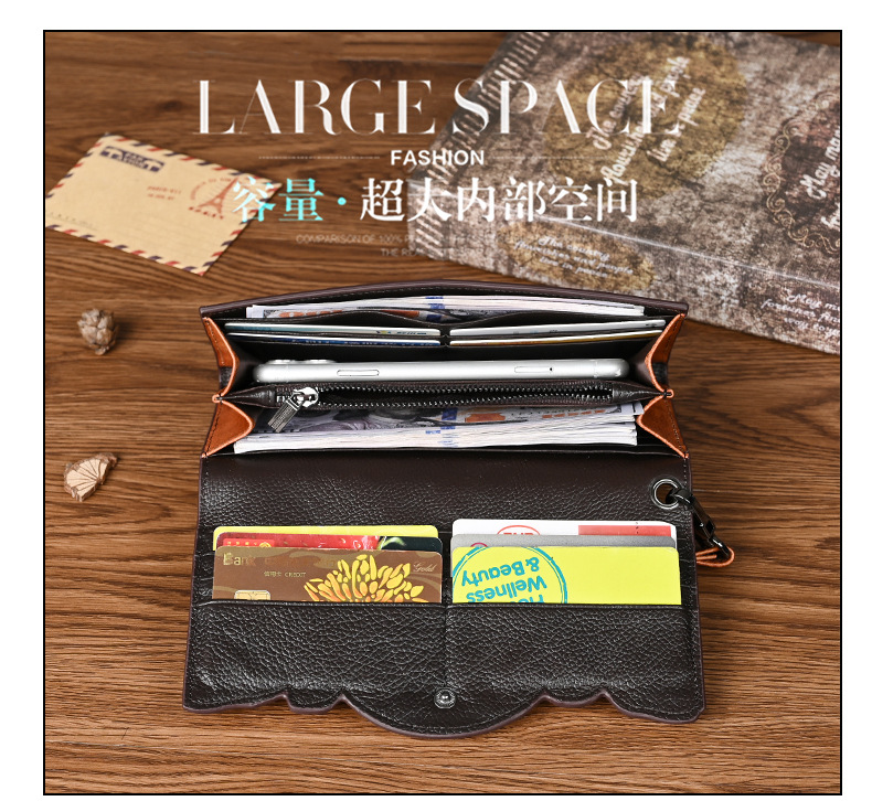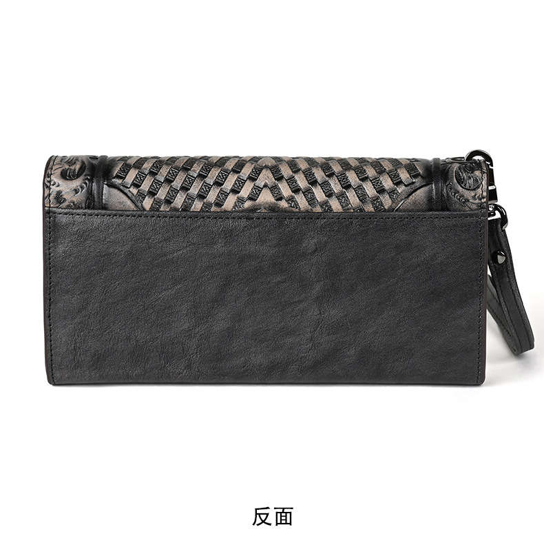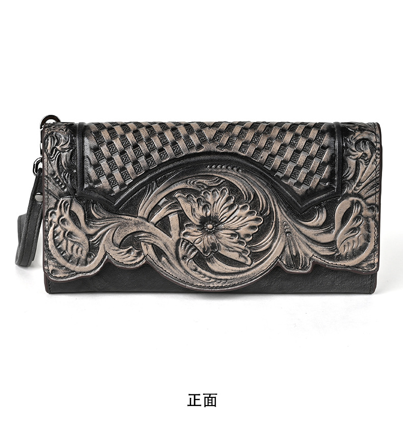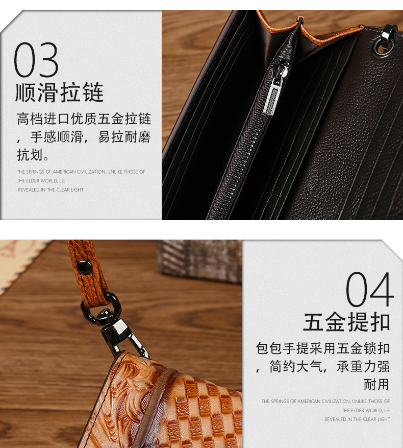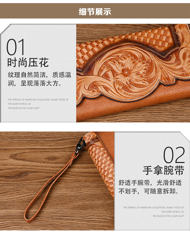 중국 스타일 양각 지갑 여성용 탑 레이어 소가죽 롱 패션 지갑 대용량 3 중 가방 빈티지 소형 핸드백