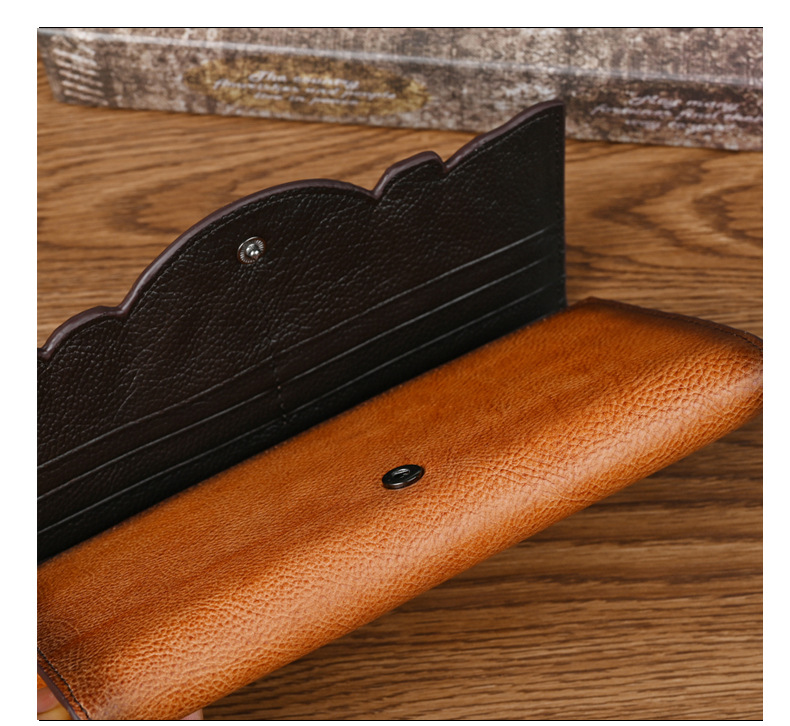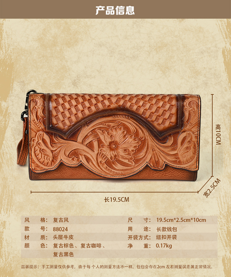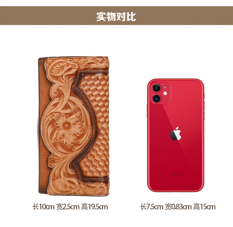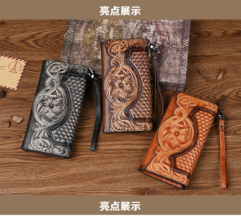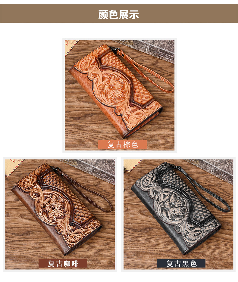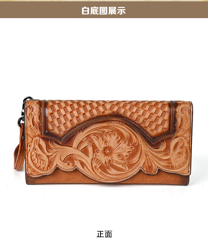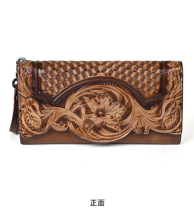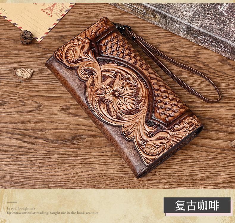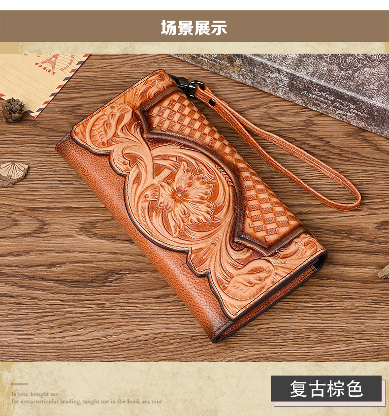 중국 스타일 양각 지갑 여성용 탑 레이어 소가죽 롱 패션 지갑 대용량 3 중 가방 빈티지 소형 핸드백스토어 가기