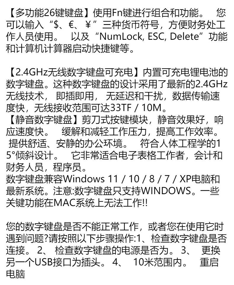 무선 디지털 키보드 26 키 휴대용 2.4 GHz 재무 회계 Windows 용 디지털 키보드