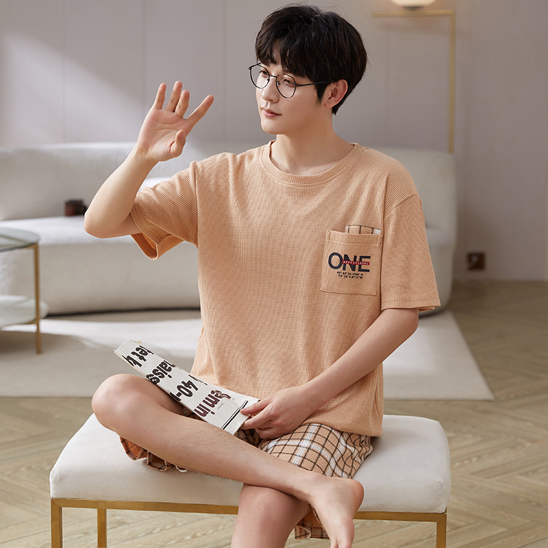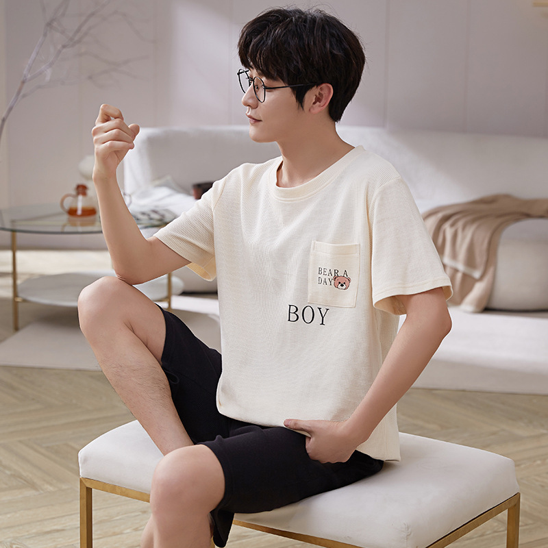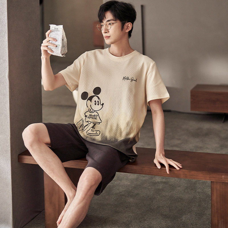 잠옷 남자의 순면 와플 여름 새로운 반팔 반바지 캐주얼 느슨한 만화 아웃웨어 가정 옷 세트