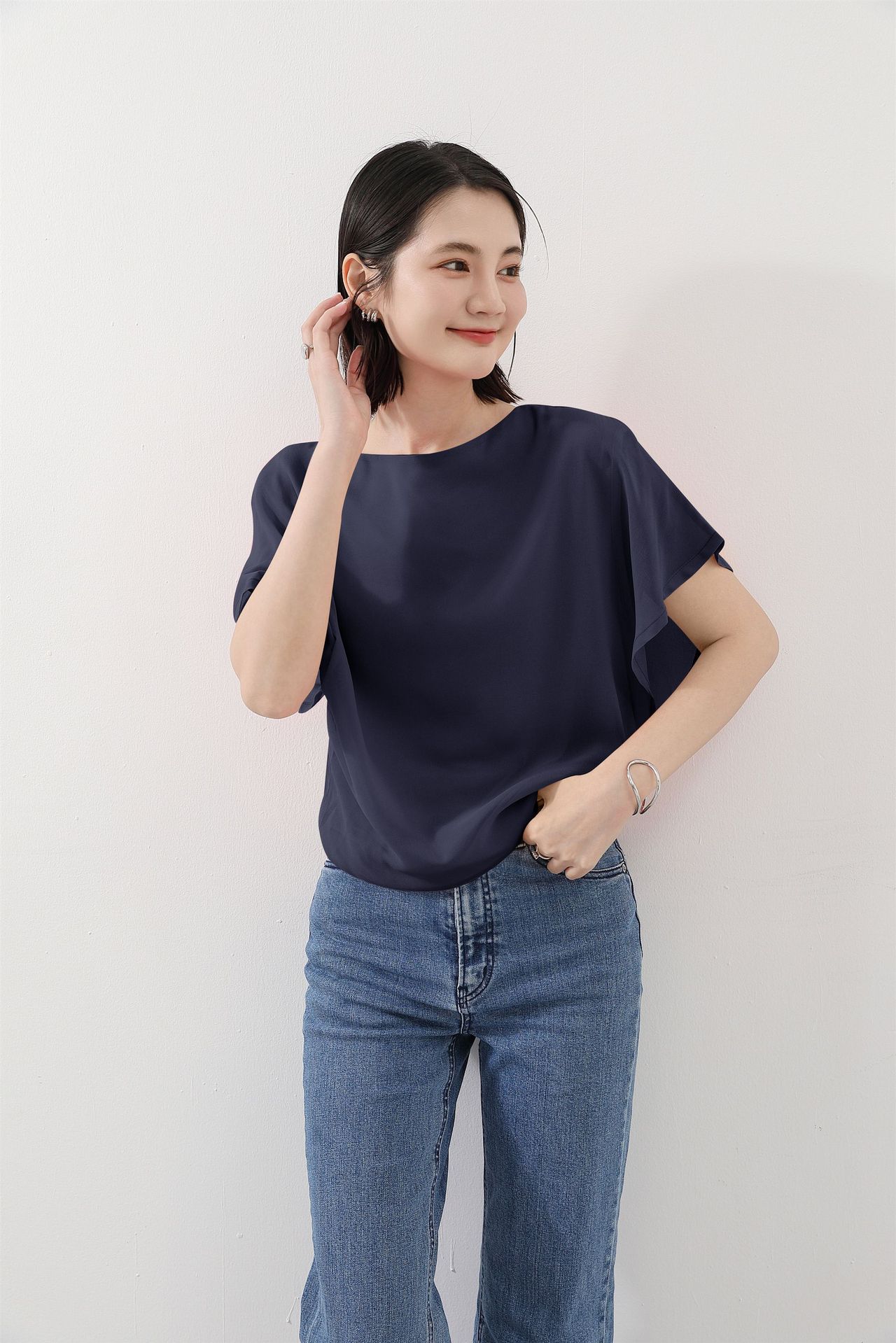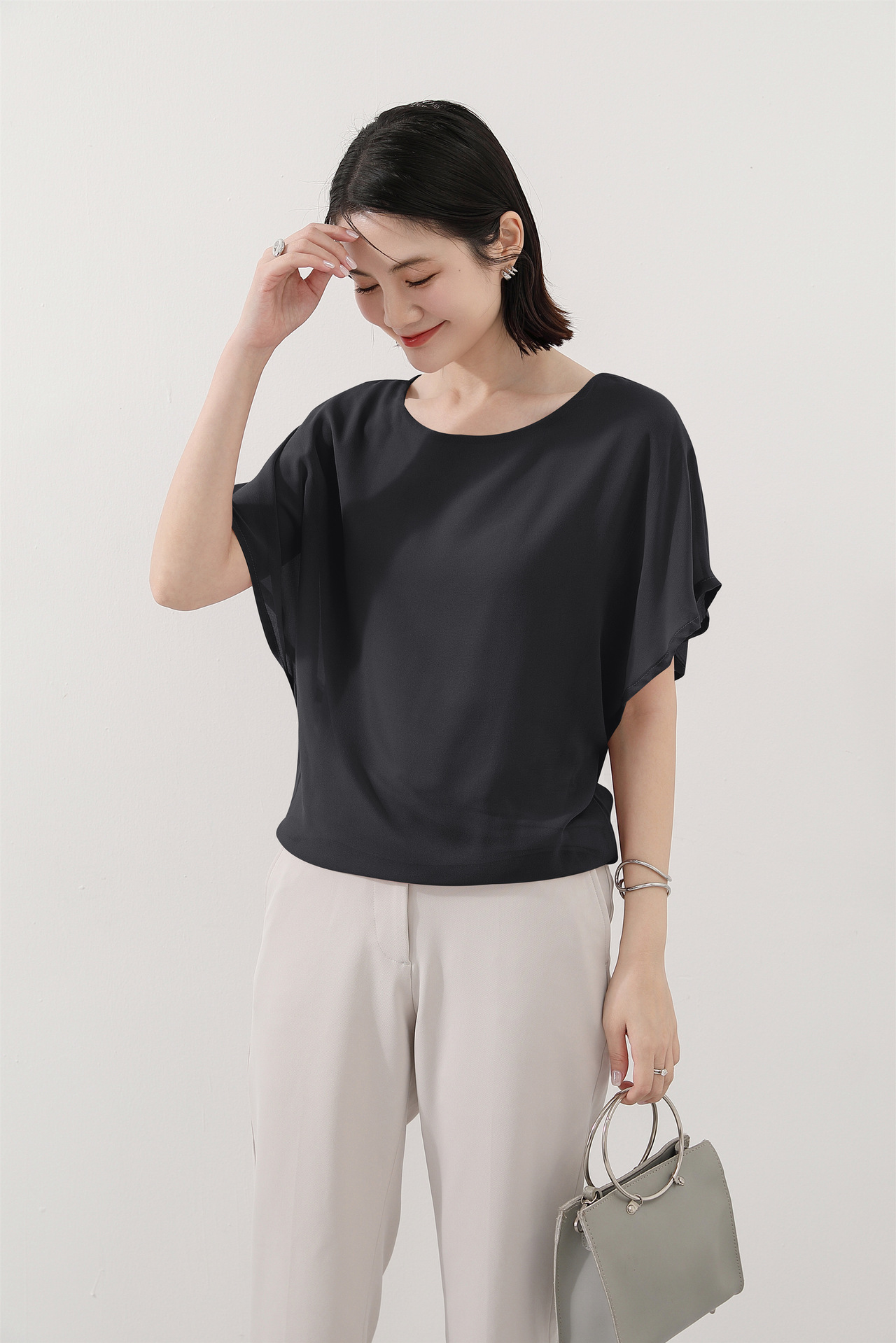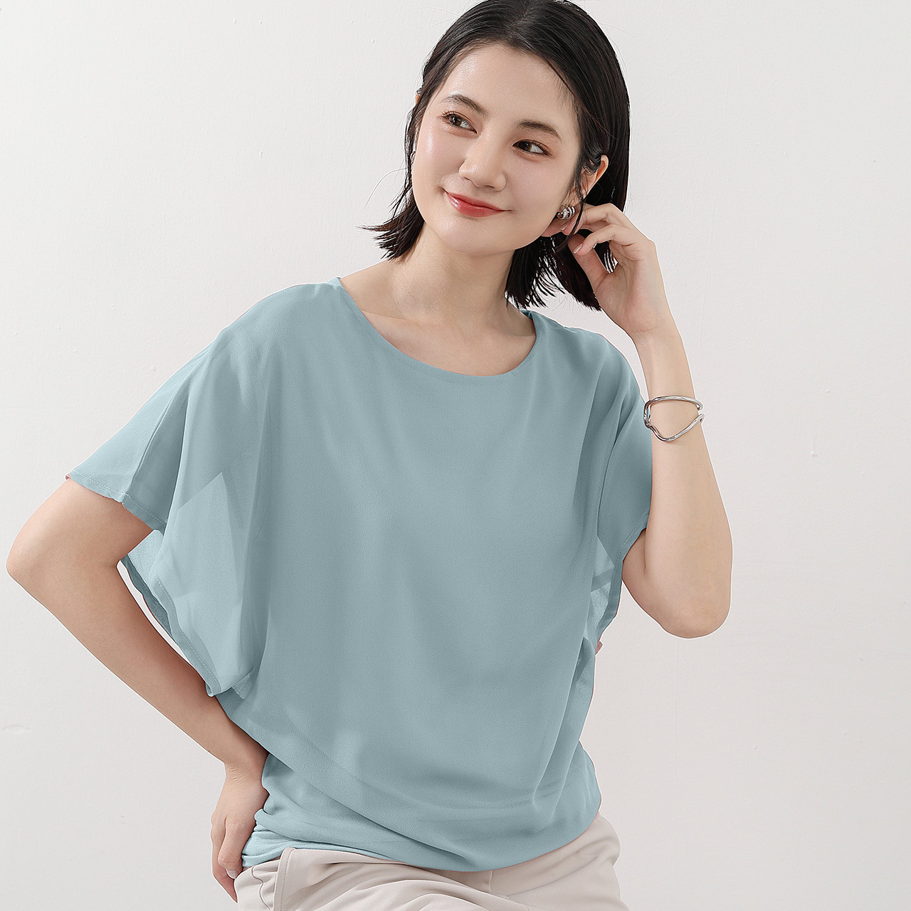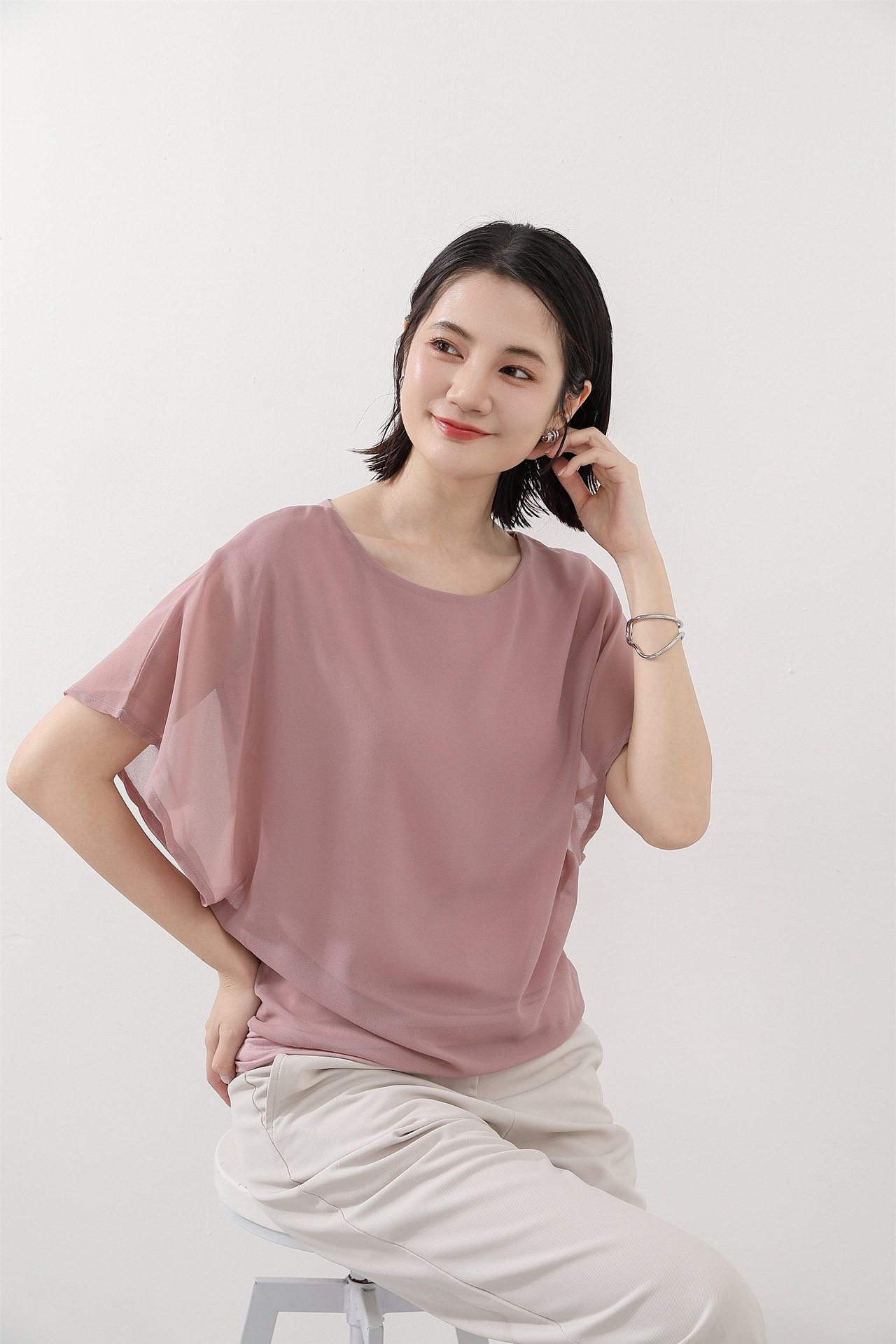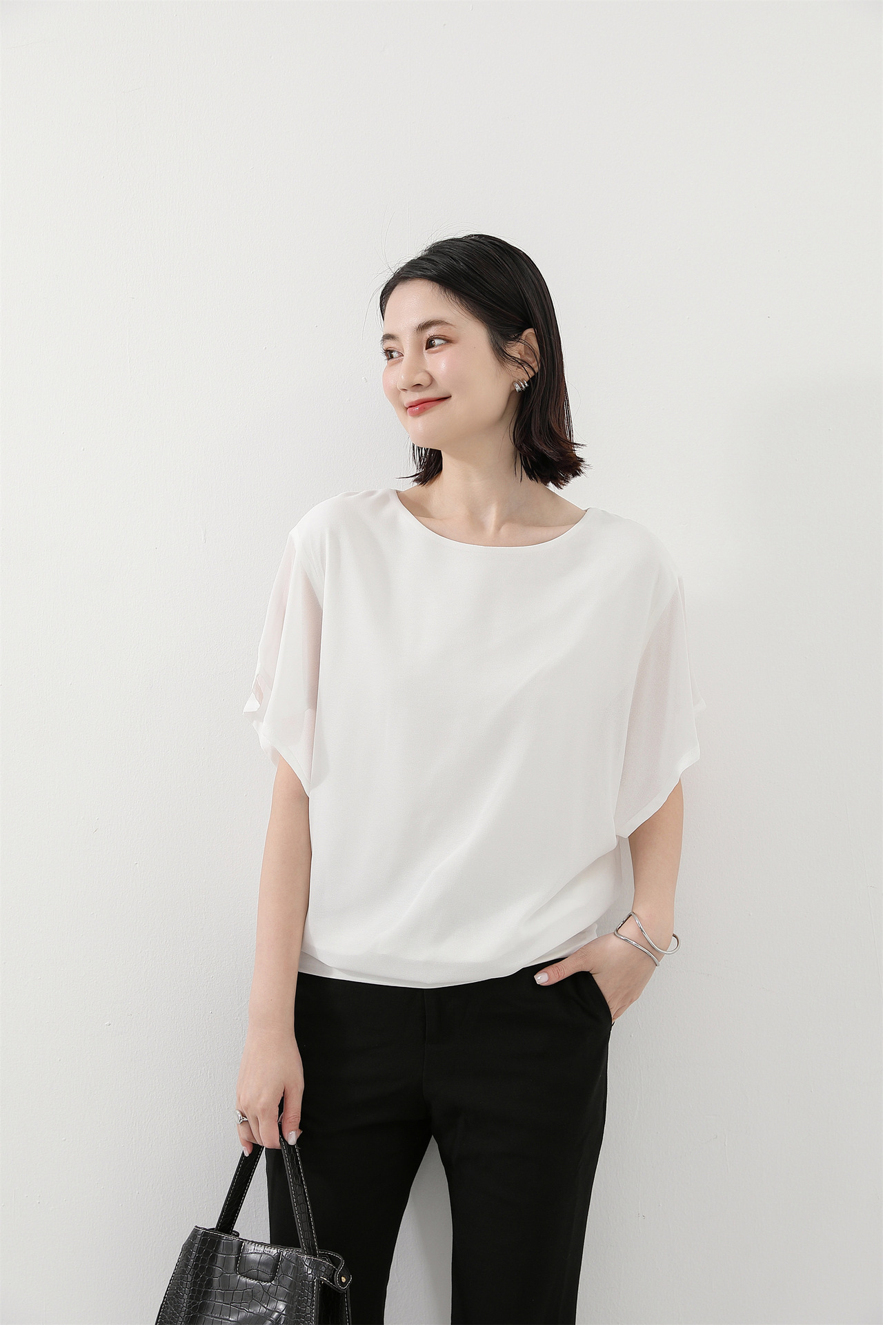 여름 새로운 느슨한 라운드 넥 배트윙 슬리브 스티칭 쉬폰 셔츠 여성의 일본과 한국 캐주얼 달콤한 모든 매치 티셔츠 탑스토어 가기