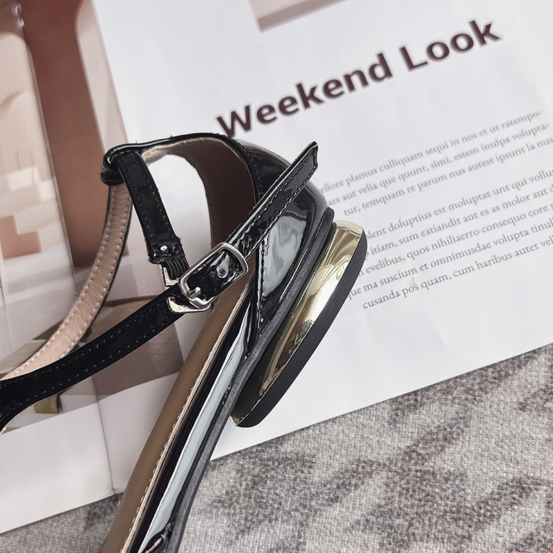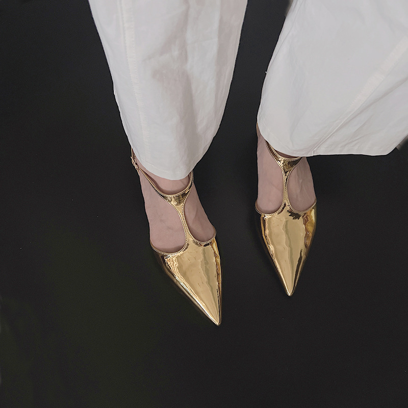 봄/가을 2023 새로운 유럽과 미국 패션 골드 뾰족한 중공 샌들 편안한 플랫 버클 밝은 가죽 여성 신발