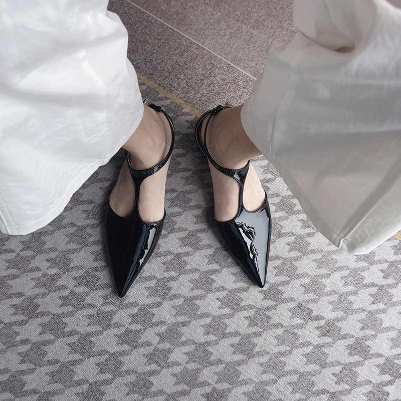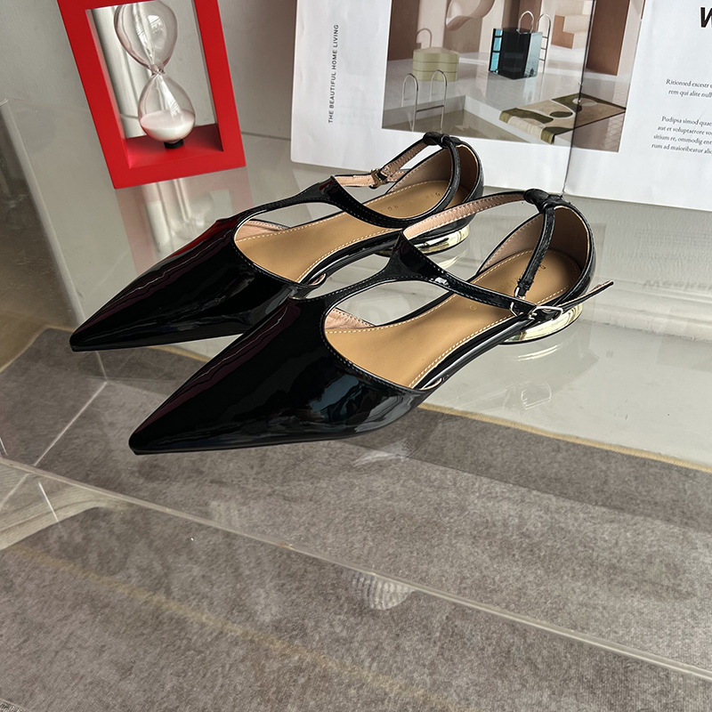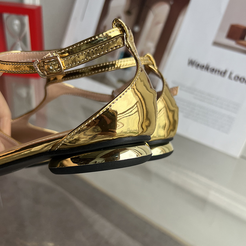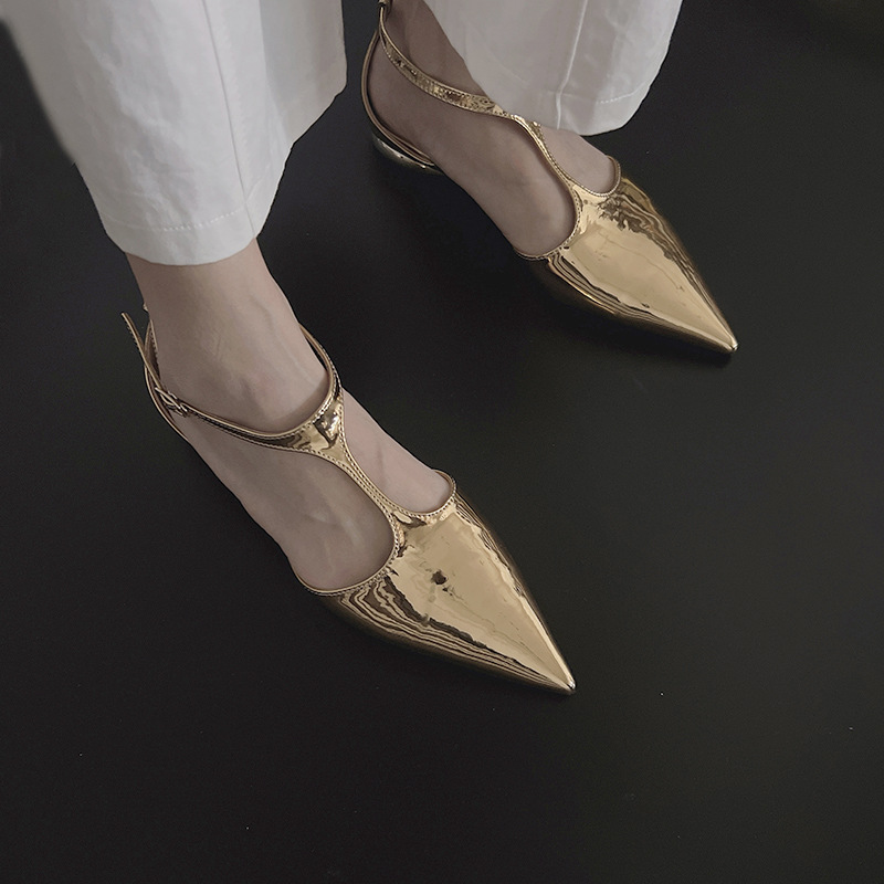 봄/가을 2023 새로운 유럽과 미국 패션 골드 뾰족한 중공 샌들 편안한 플랫 버클 밝은 가죽 여성 신발스토어 가기