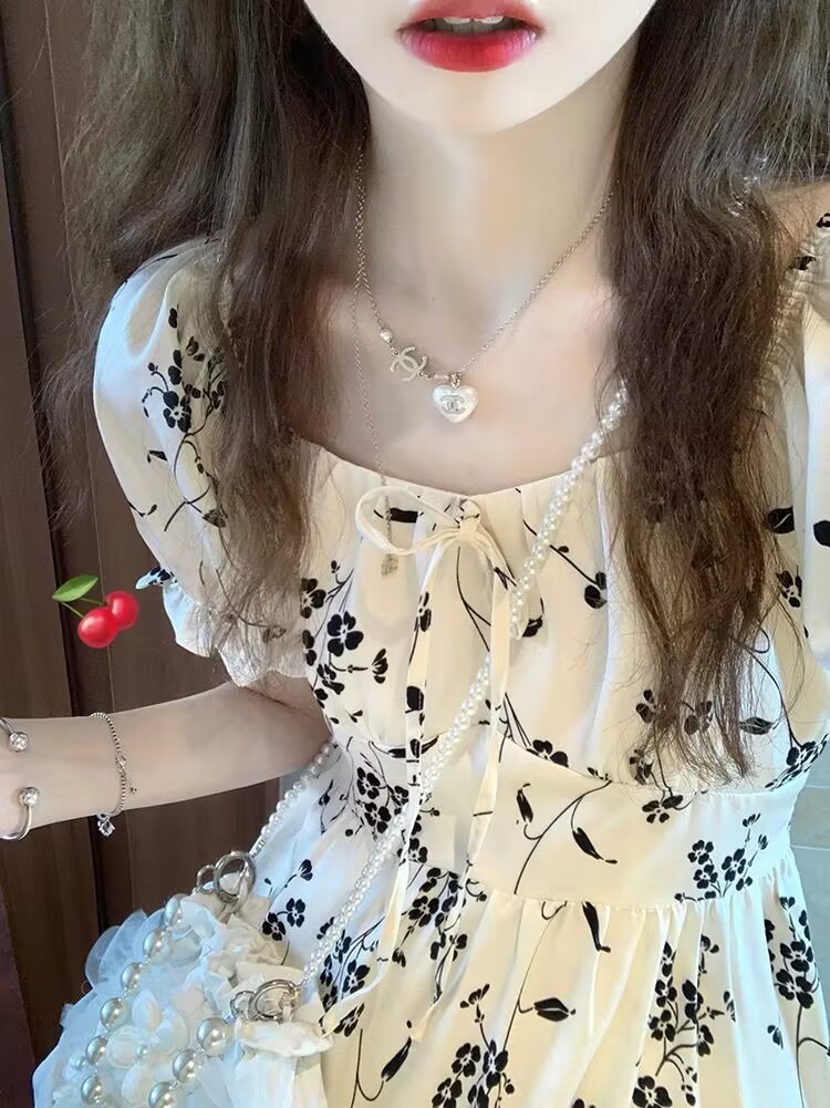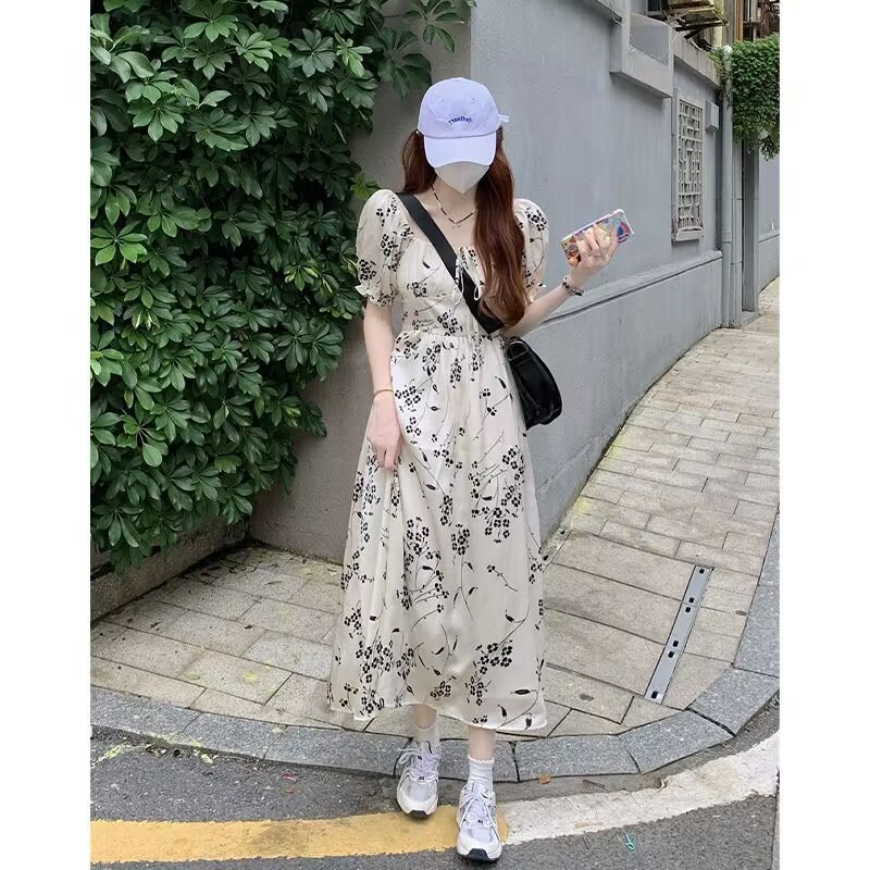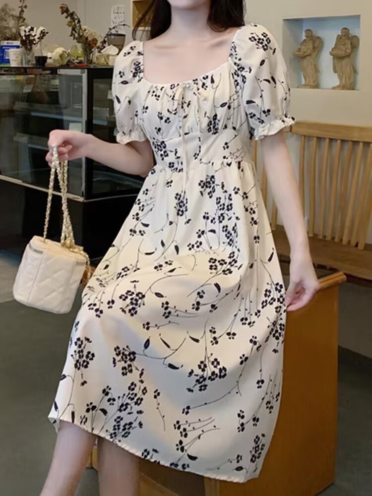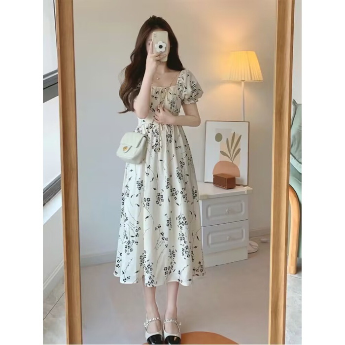 여성용 티 브레이크 프렌치 스퀘어 넥 퍼프 슬리브 꽃무늬 드레스, 2025년 여름 신상 허리 조이는 고급스러운 작은 사이즈 롱 드레스스토어 가기