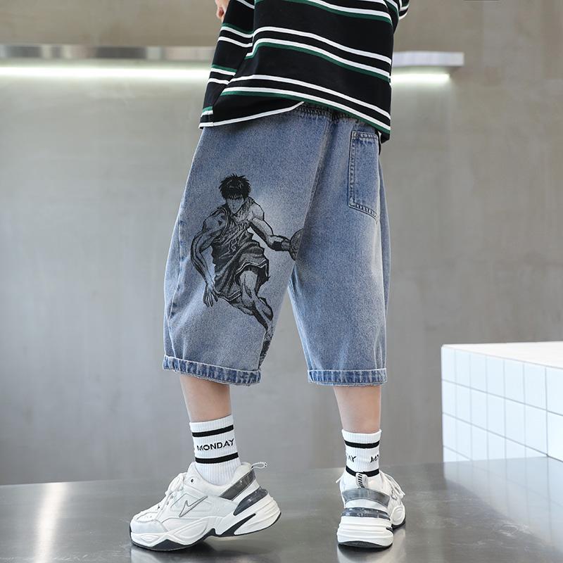 남아 바지 여름 어린이 데님 바지 2023 새로운 스타일 튀김 거리 중간 및 큰 어린이 캐주얼 바지 잘 생긴 얇은