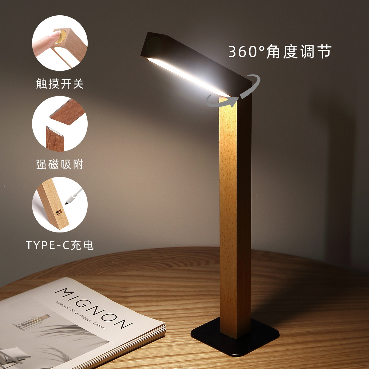 2023 새로운 비 배선 나무 DIY 접이식 보관 LED 무단 디밍 독서 USB 자기 충전 데스크 램프