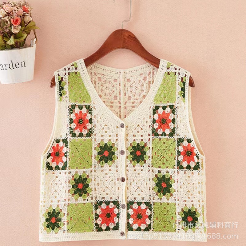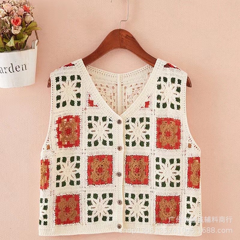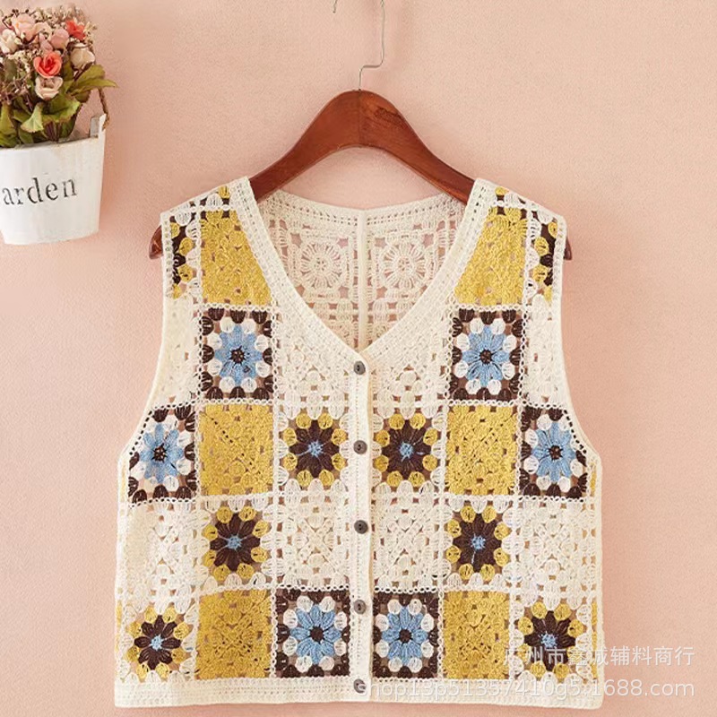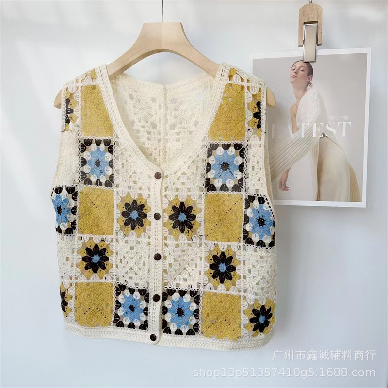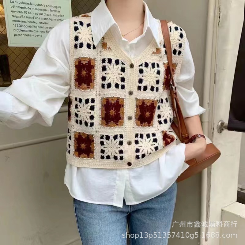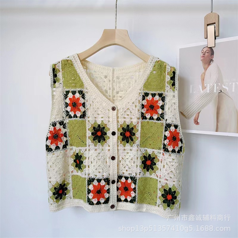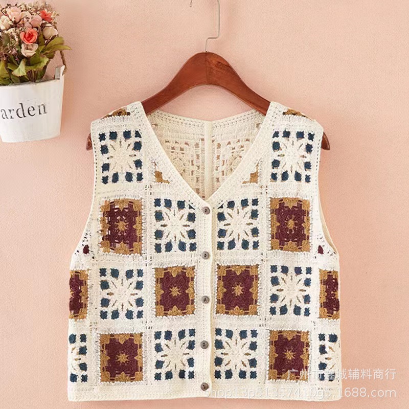빈티지 컬러 매칭 격자 무늬 꽃 중공 니트 조끼 여성용 여름 V-넥 스택 카디건 탑 트렌디스토어 가기