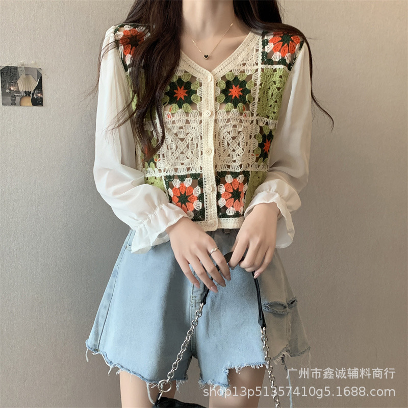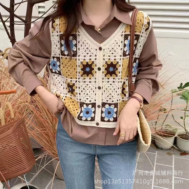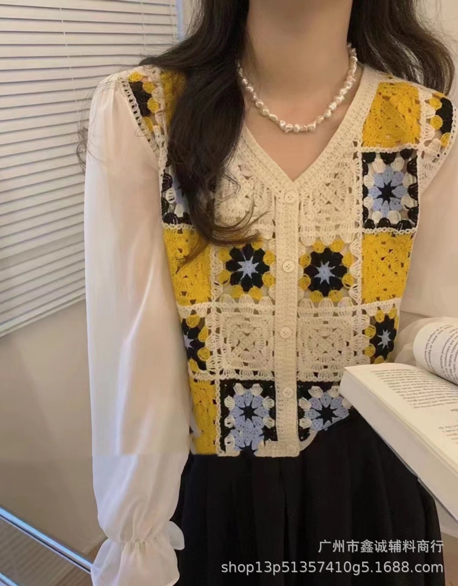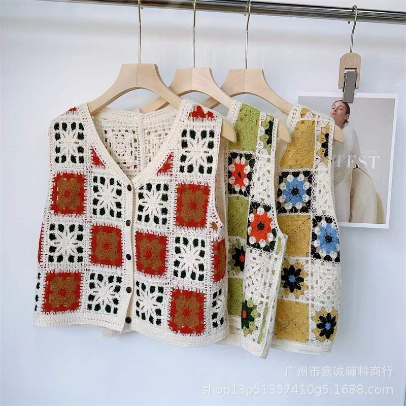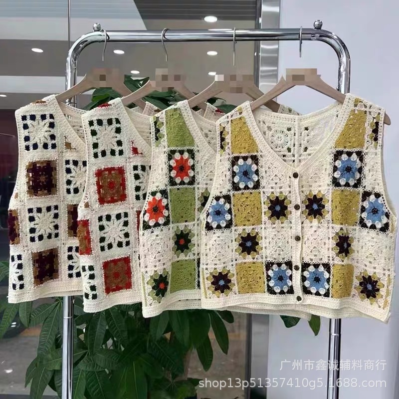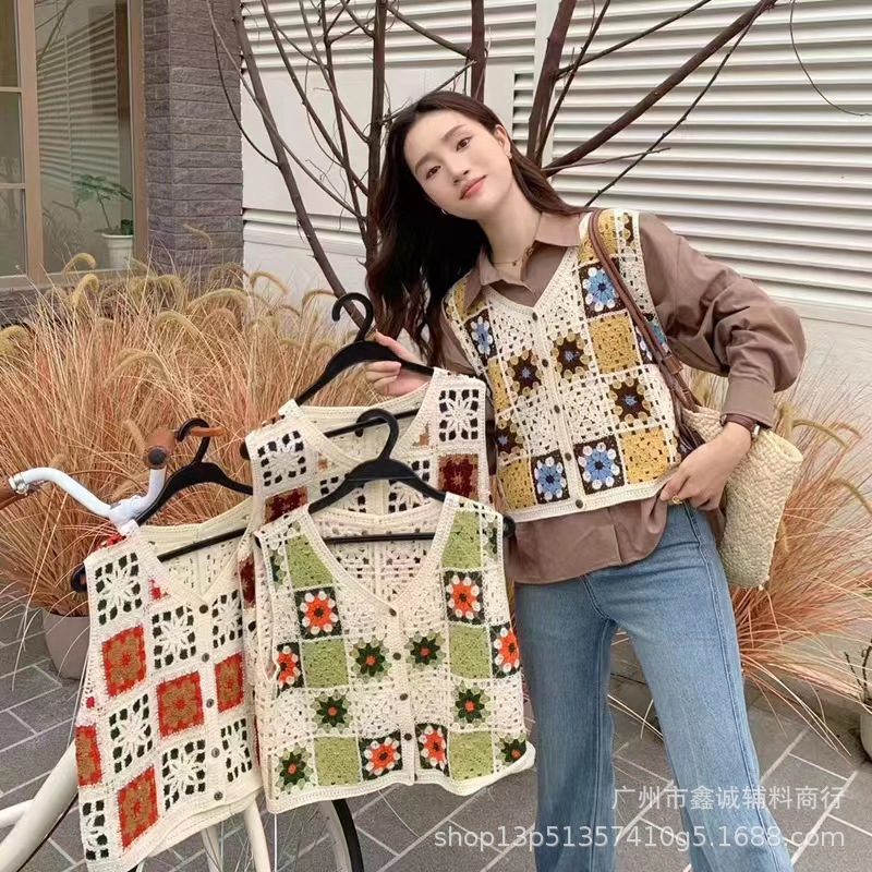 빈티지 컬러 매칭 격자 무늬 꽃 중공 니트 조끼 여성용 여름 V-넥 스택 카디건 탑 트렌디스토어 가기