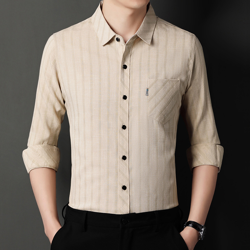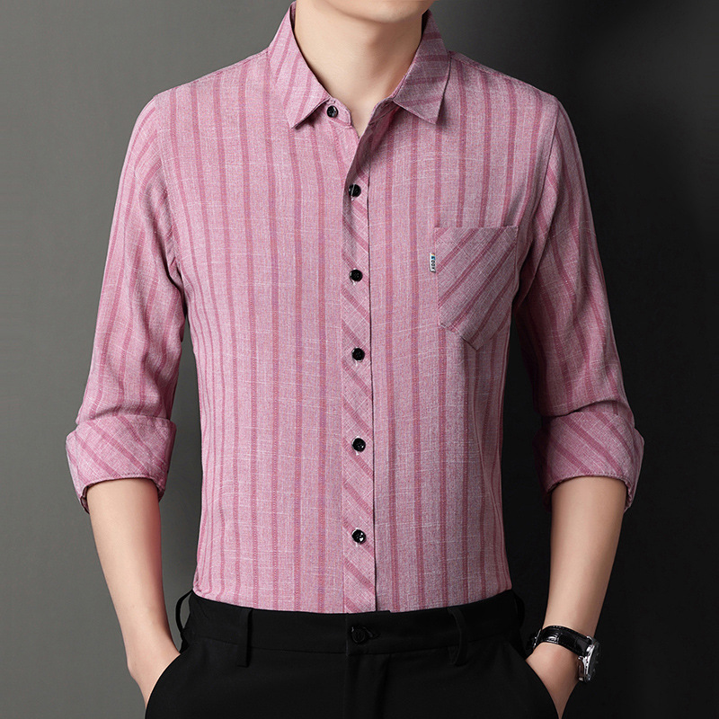 2022春秋季男士条纹真口袋薄款仿棉麻长袖衬衣中青年休闲男装衬衫