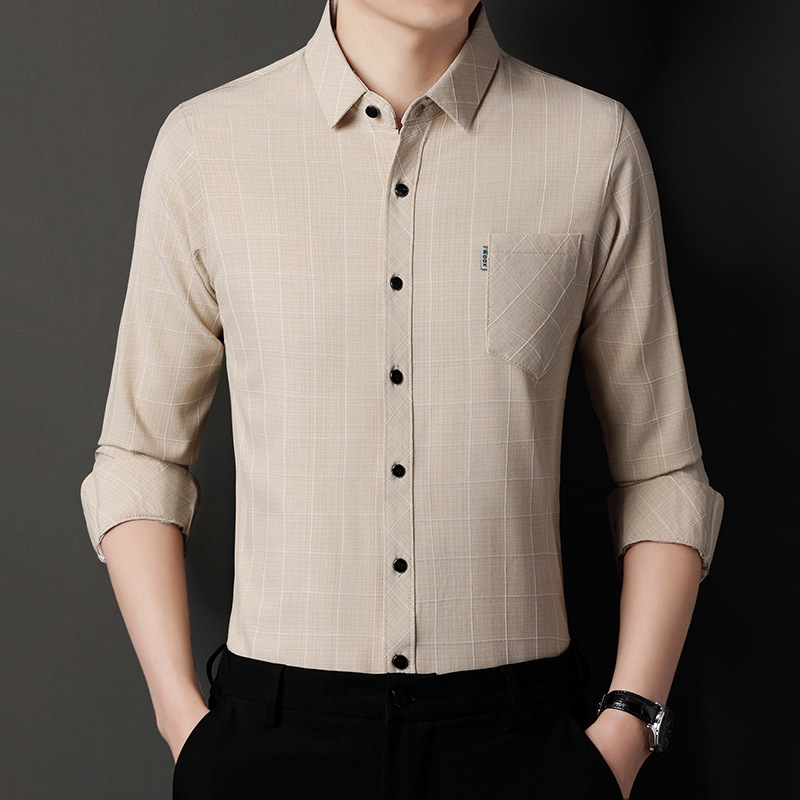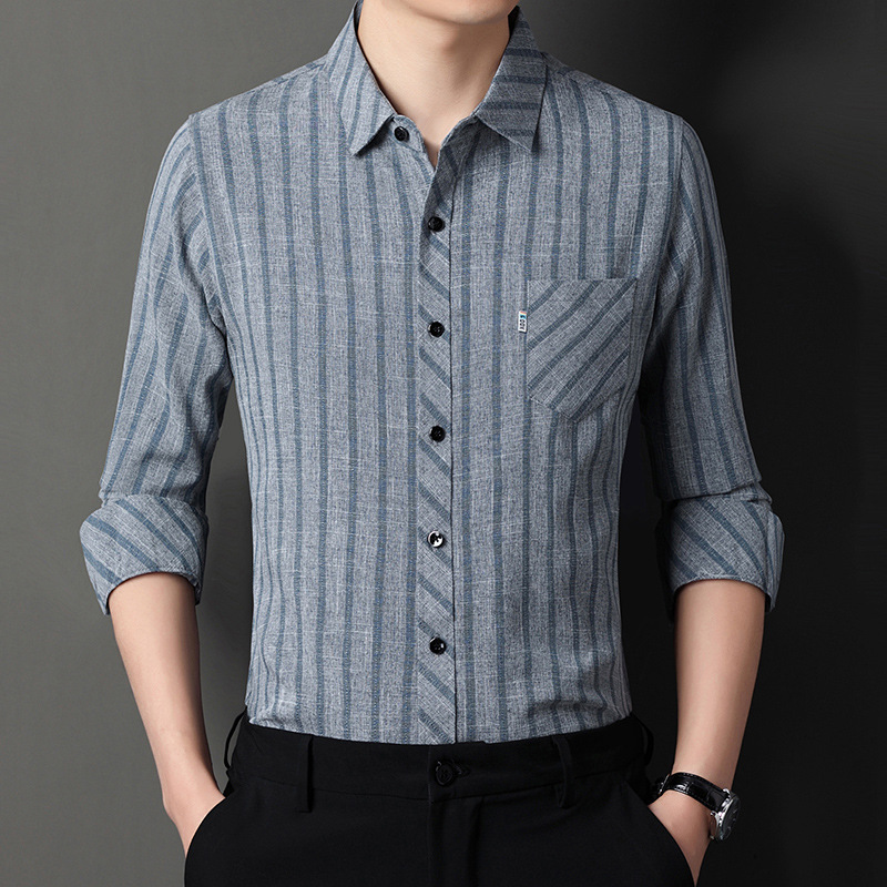 봄과 가을 2022 남성용 스트라이프 리얼 포켓 얇은 모조 면과 린넨 긴팔 셔츠 젊은 중년 캐주얼 남성 셔츠