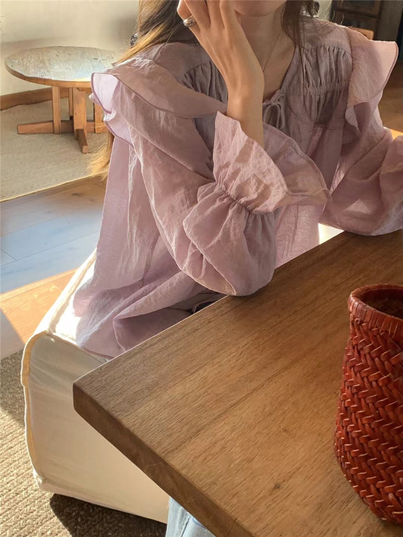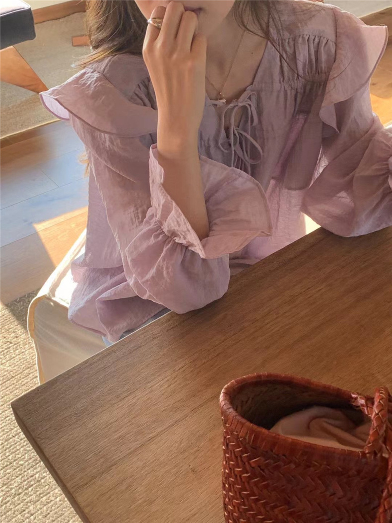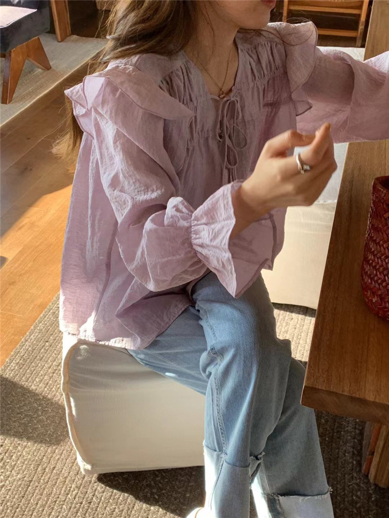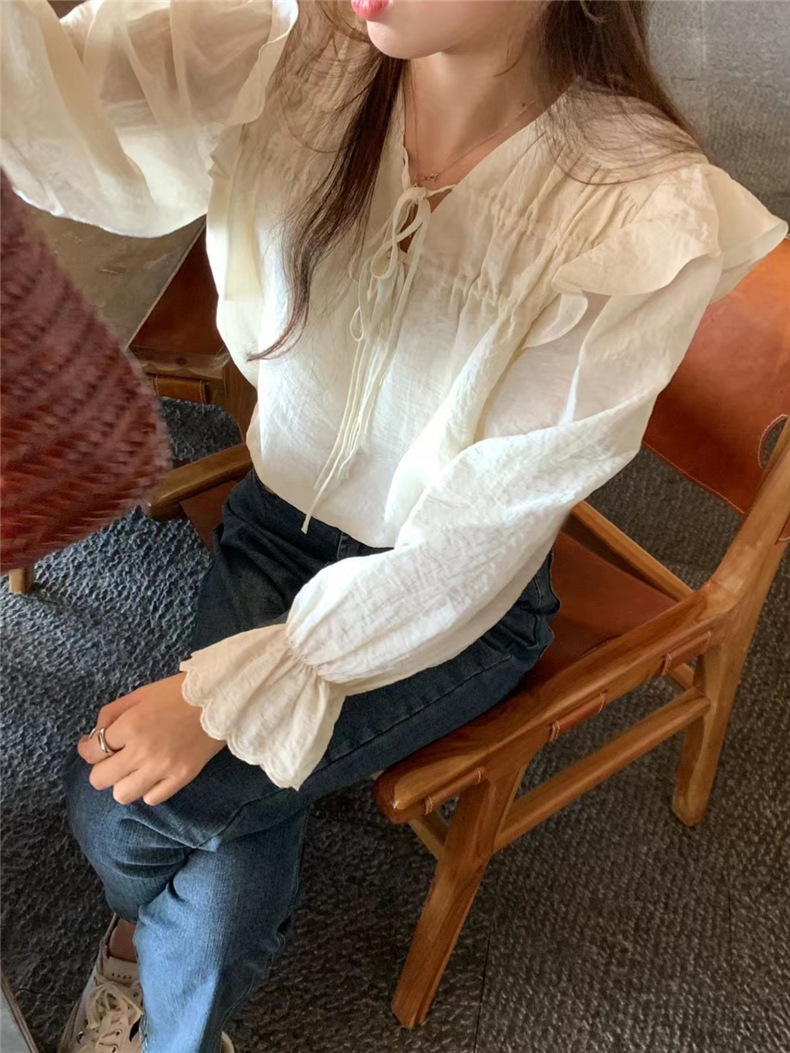 셔츠 1688 신상 한국 소형 디자인, 달콤한 벨 슬리브, 러플 레이스업 탑, 쉬폰 셔츠