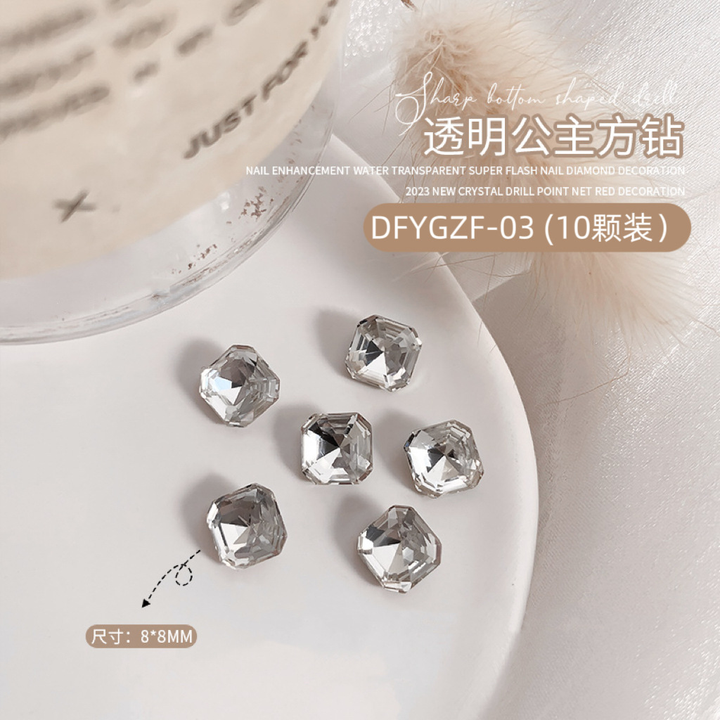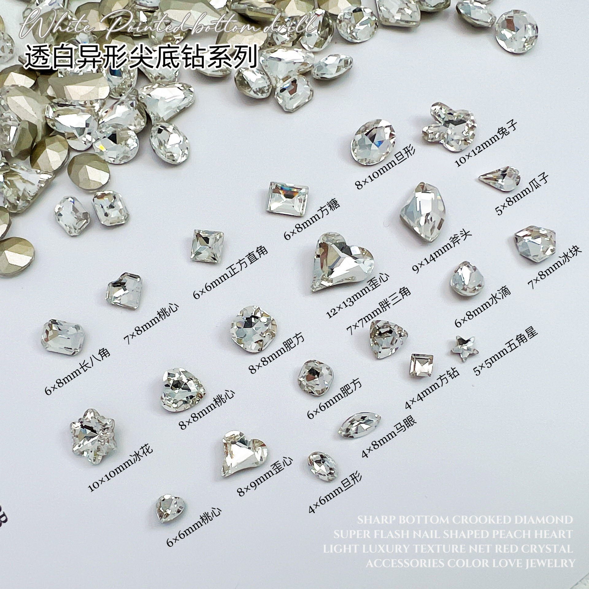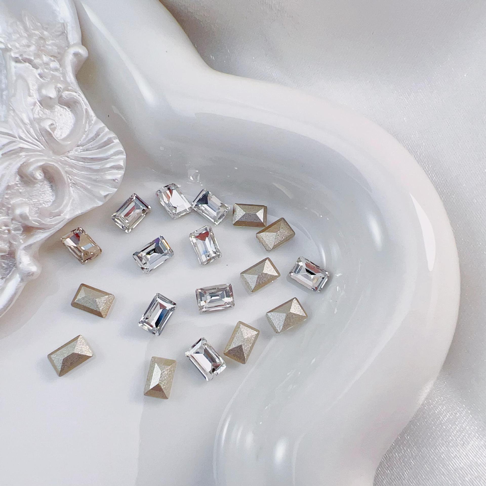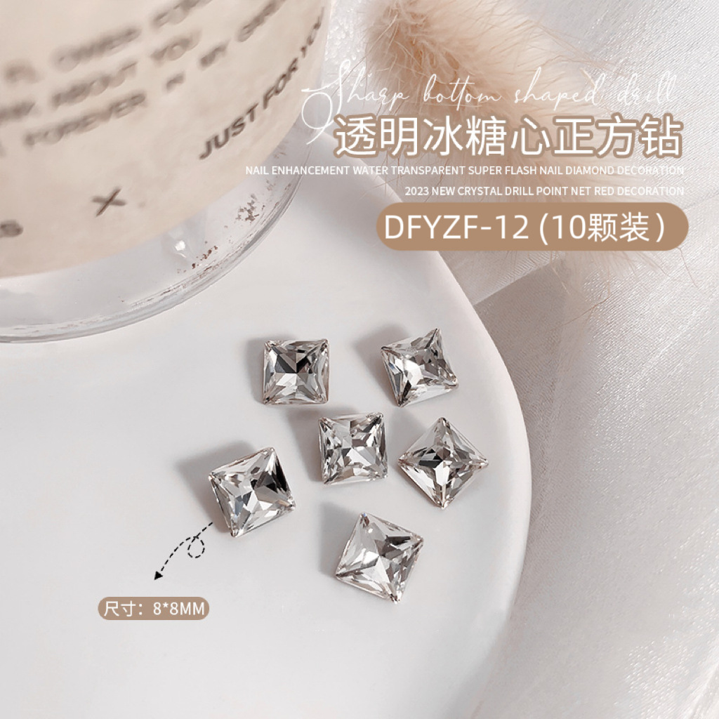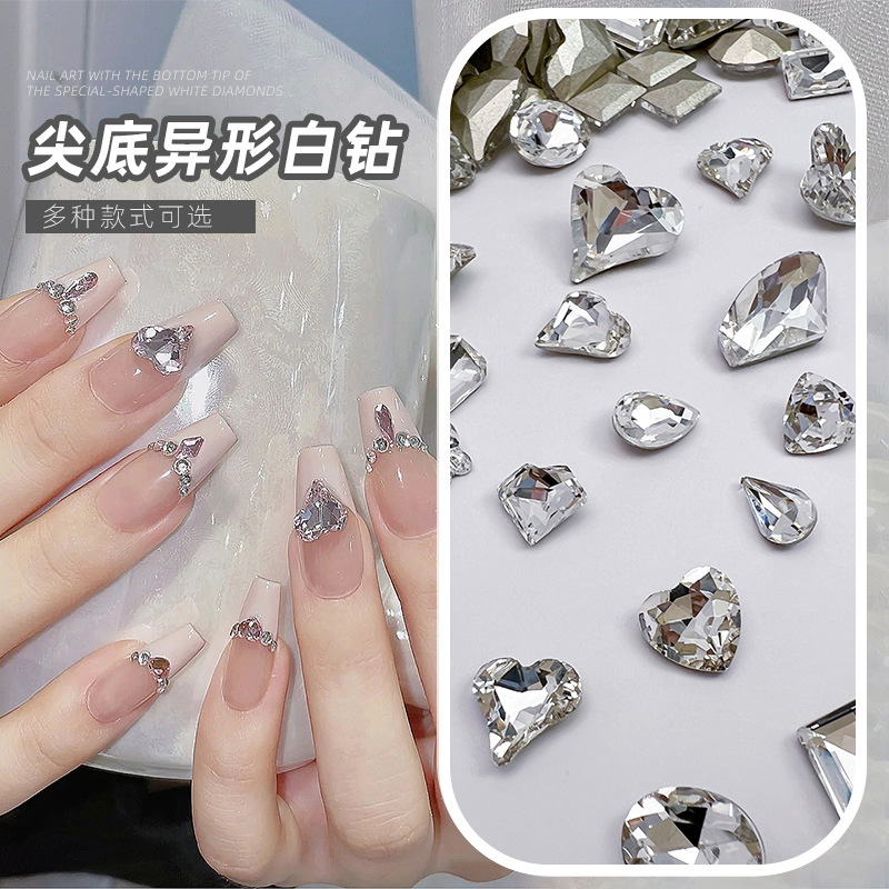 흰색 뾰족한 네일 드릴 울트라 플래시 흰색 직사각형 지방 사각형 비뚤어진 하트 록 캔디 유리 모양의 다이아몬드 네일 쥬얼리