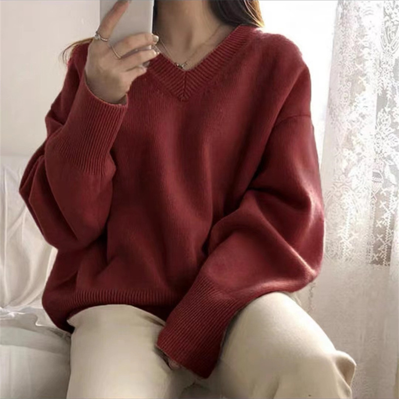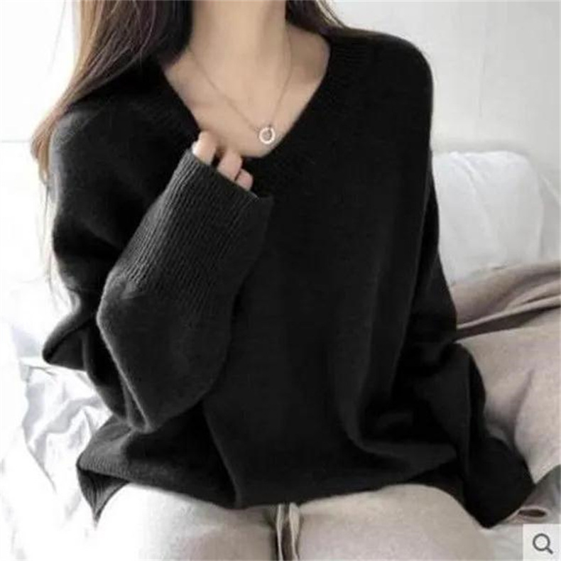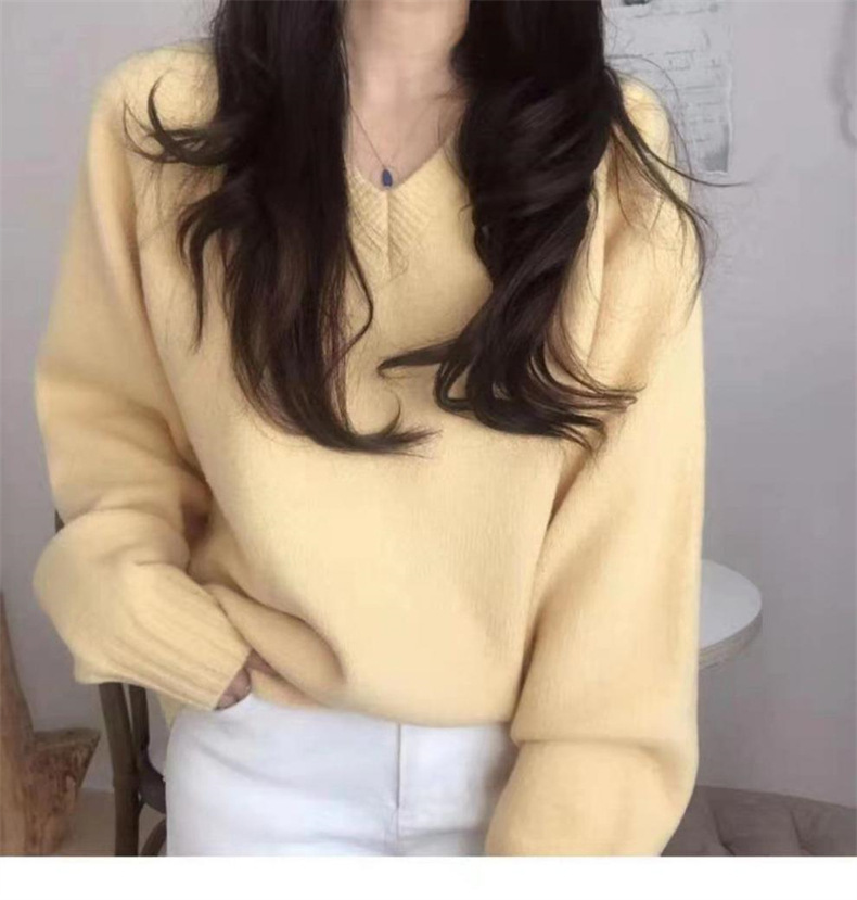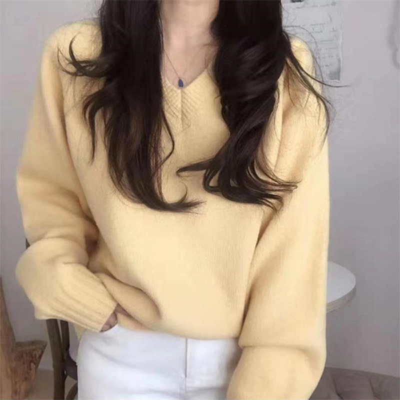 가을과 겨울 한국 스타일 게으른 스타일 V-넥 스웨터 겉옷 여성용 세련된 모든 매치 느슨한 풀오버 니트 베이스 탑