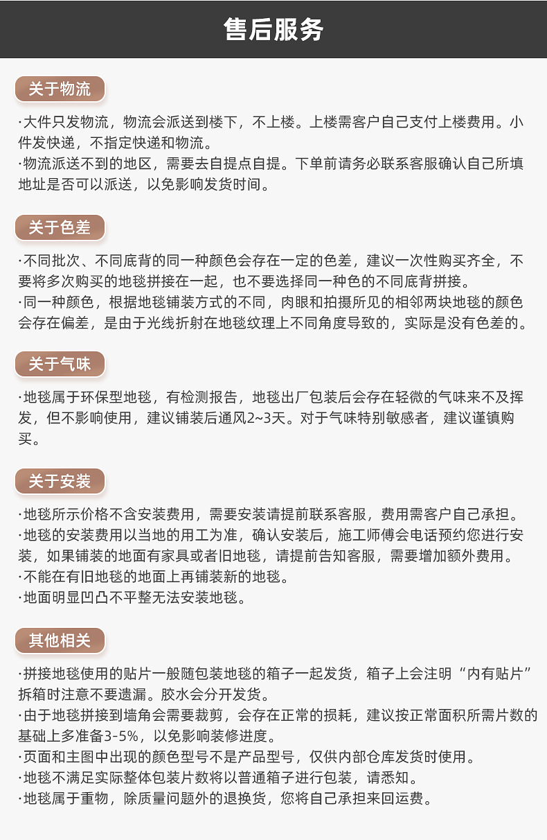 注明:地垫是定制产品,一经裁剪发货概不退换,需要购买的请确认好需要的平方数。