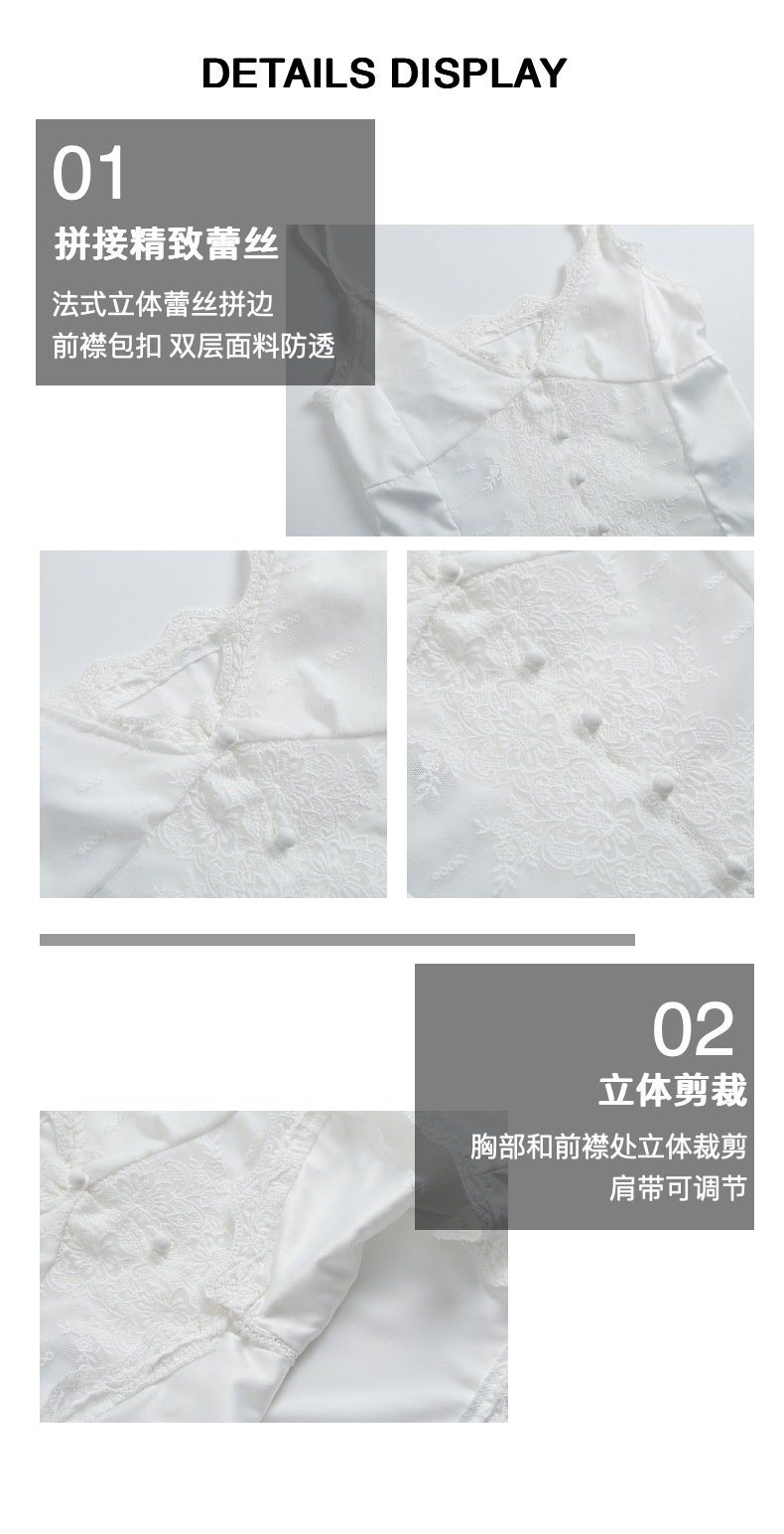 精致细肩带设计,手工缝制固定,肩带长度经过测试调整既不会走光也不会沉闷