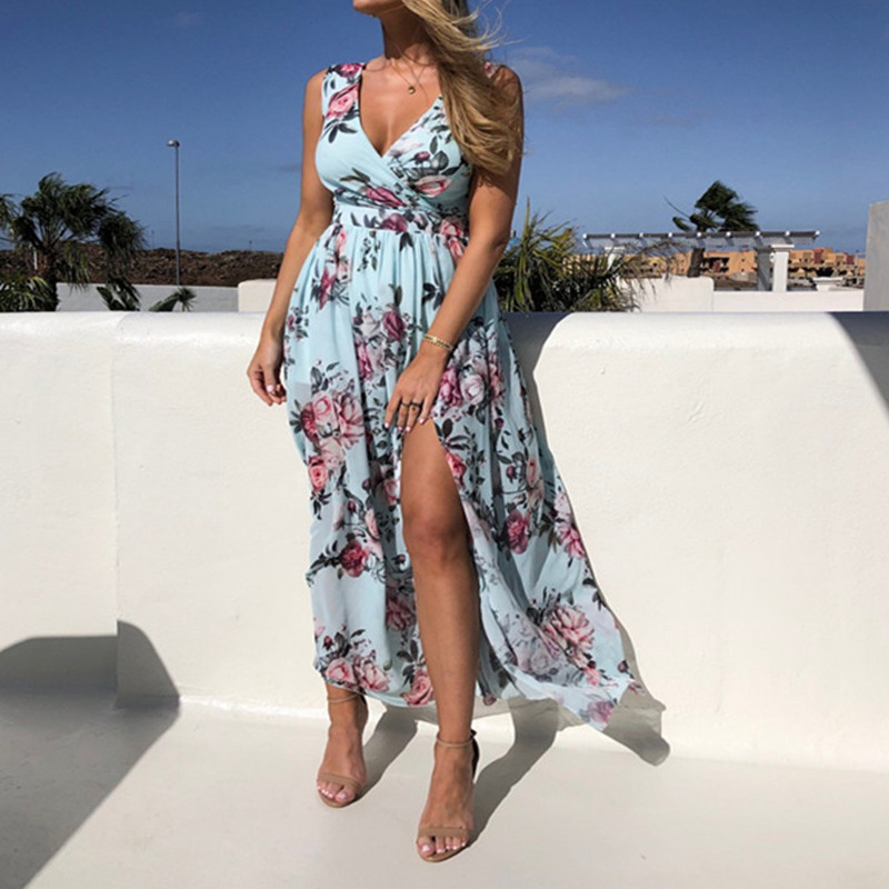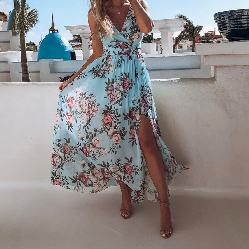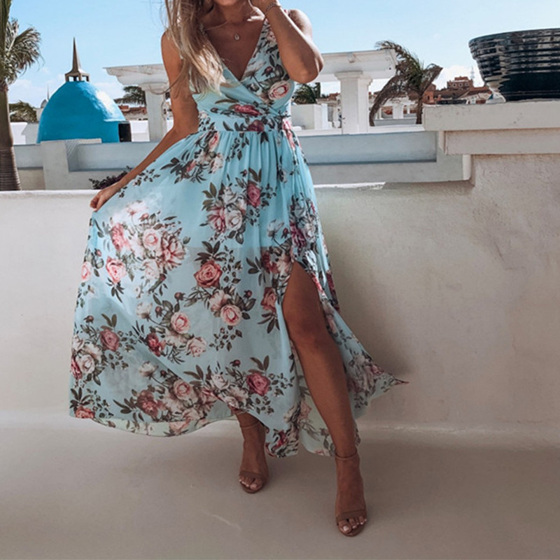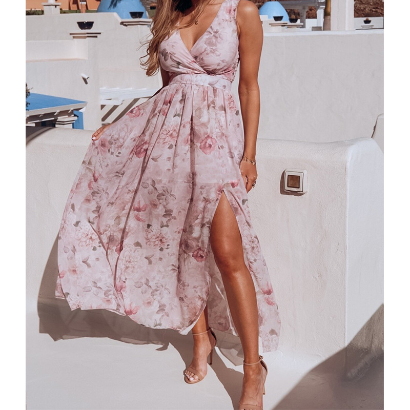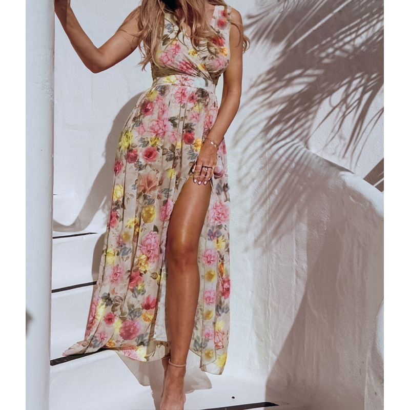 2023 새로운 봄과 여름 이베이 유럽과 미국 대외 무역 인쇄 쉬폰 원피스 민소매 휴가 해변 분할 원피스스토어 가기