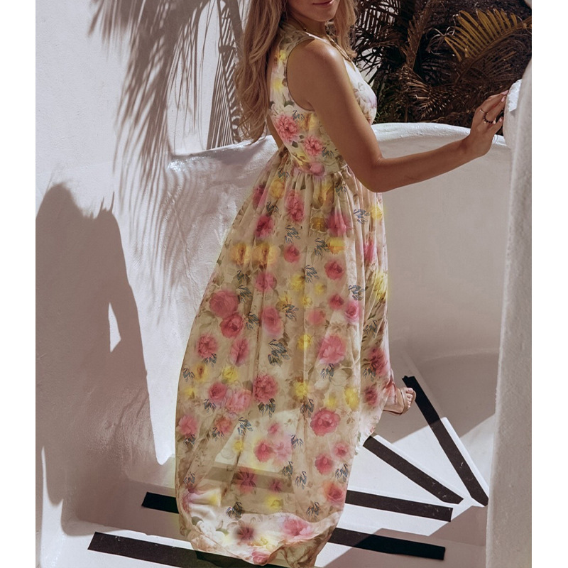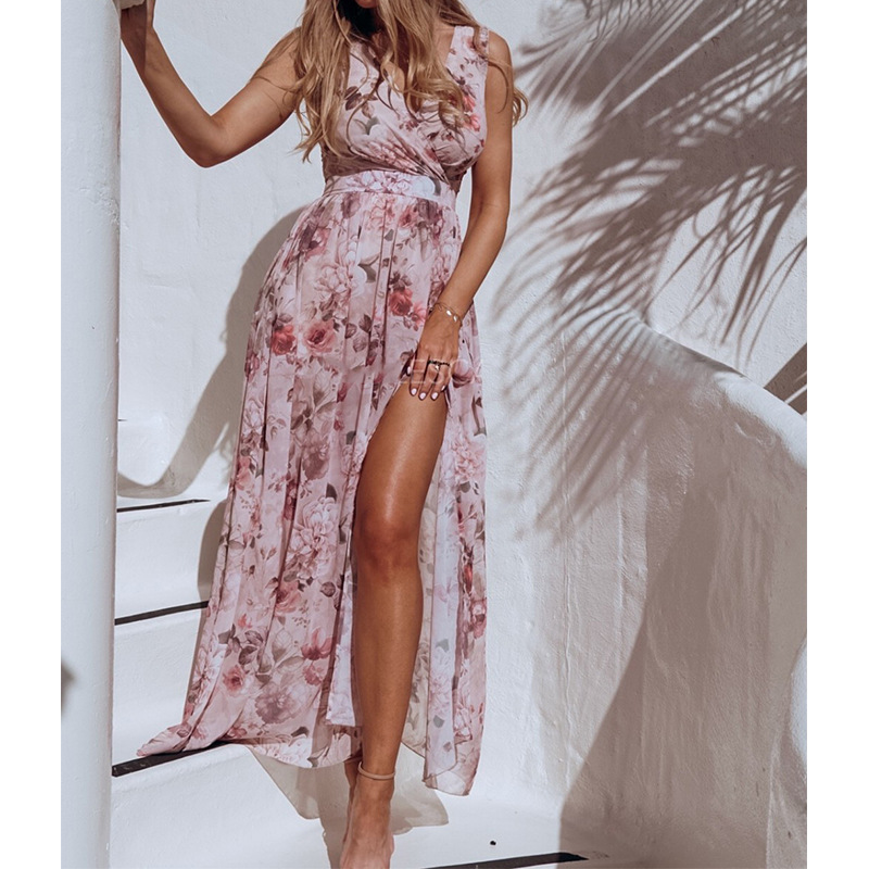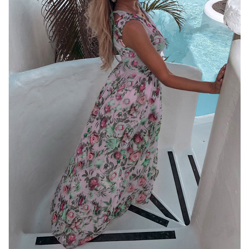 2023 새로운 봄과 여름 이베이 유럽과 미국 대외 무역 인쇄 쉬폰 원피스 민소매 휴가 해변 분할 원피스