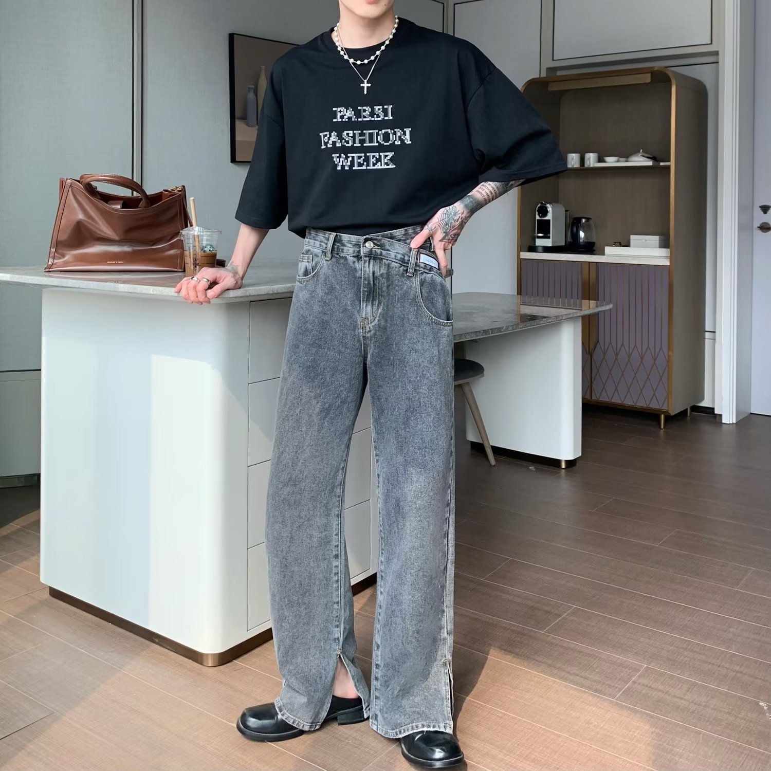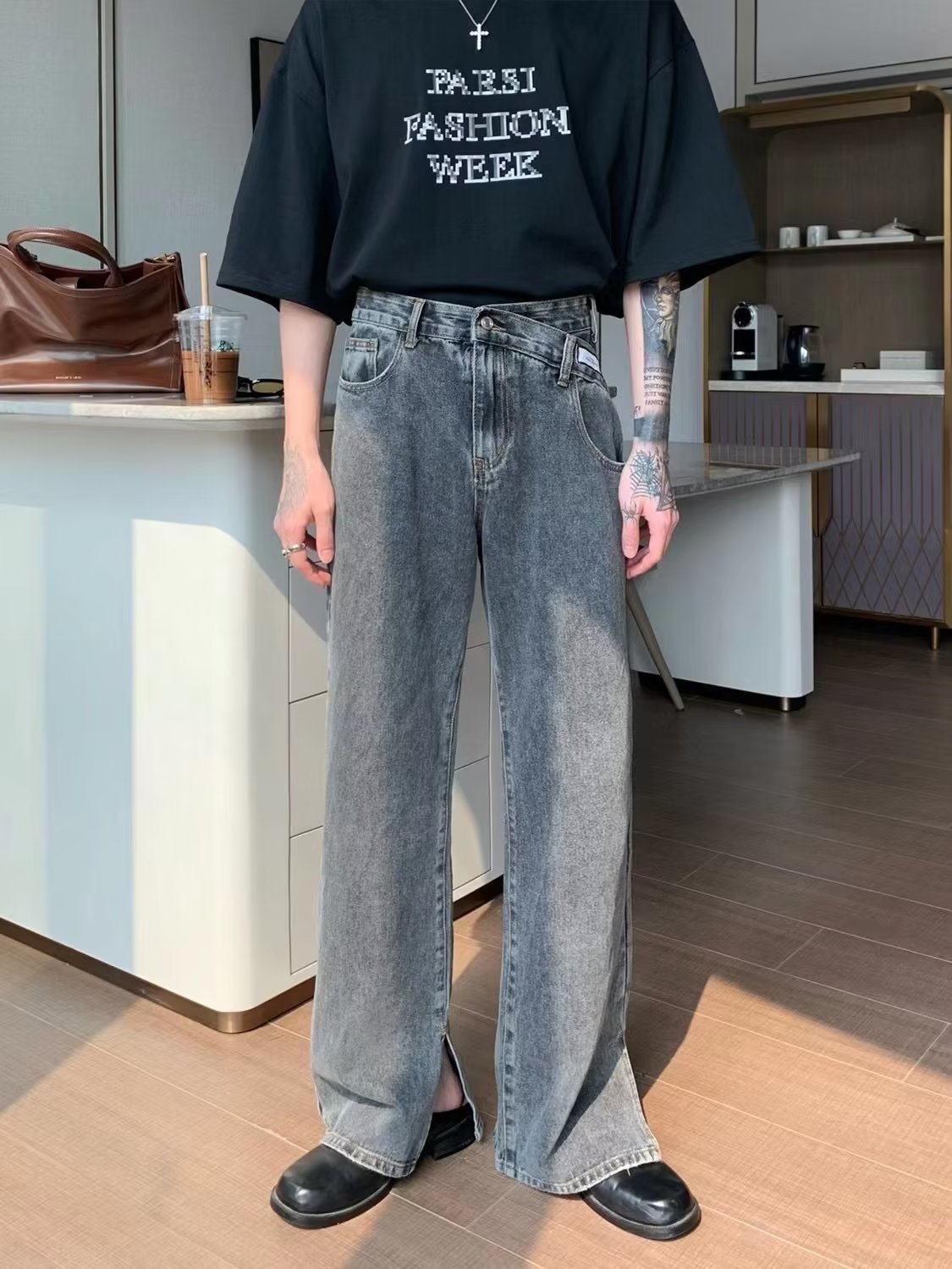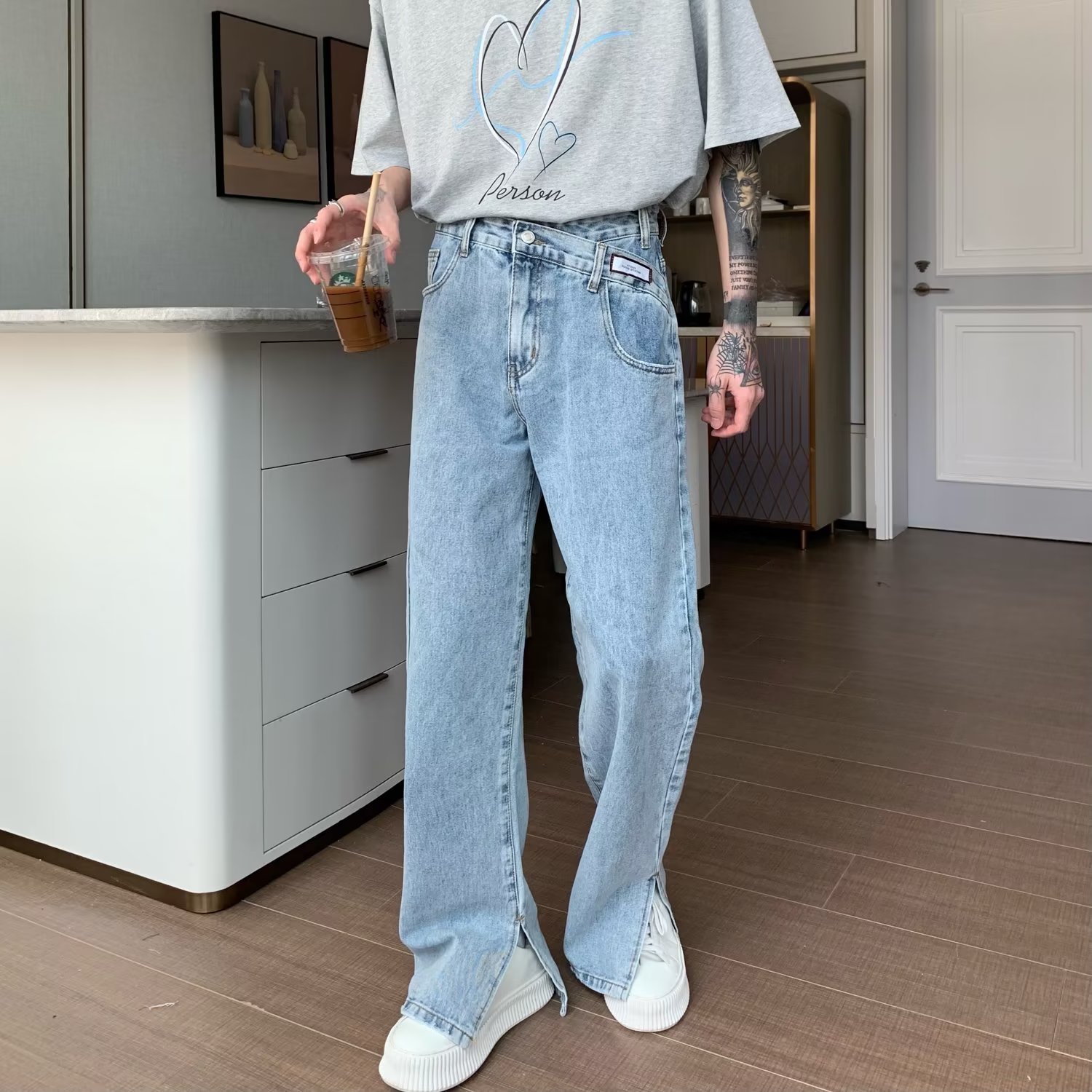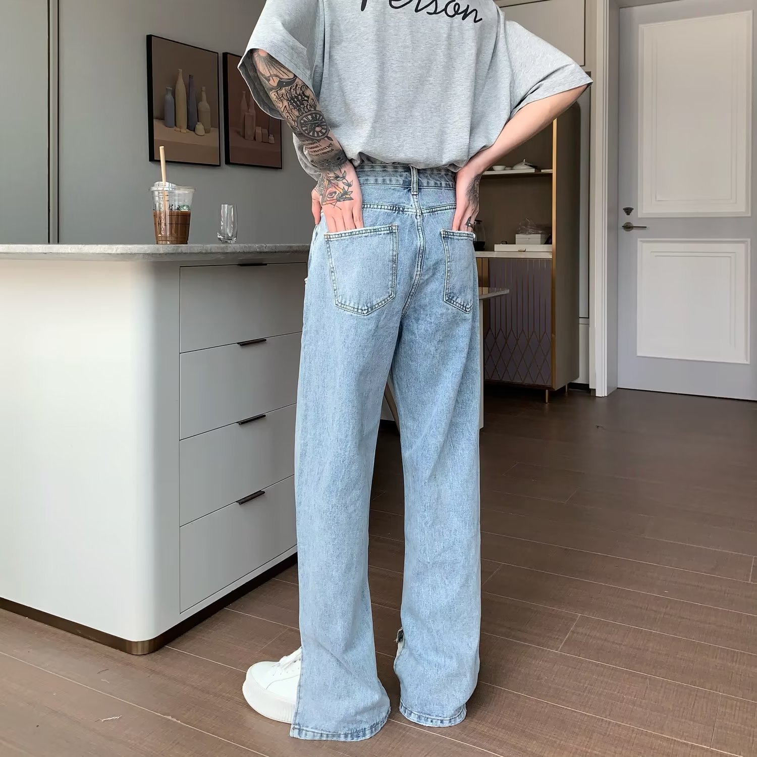 밝은 색상의 스트레이트 레그 진 남성용 한국식 유행 드레이프 와이드 팬츠 일본식 슬림핏 팬츠 스플릿 플레어 팬츠스토어 가기