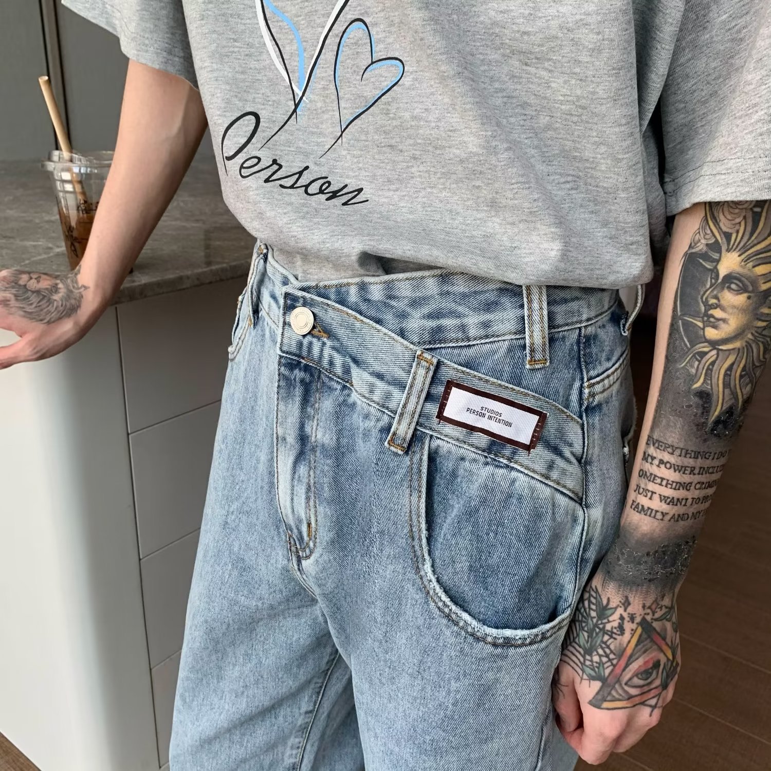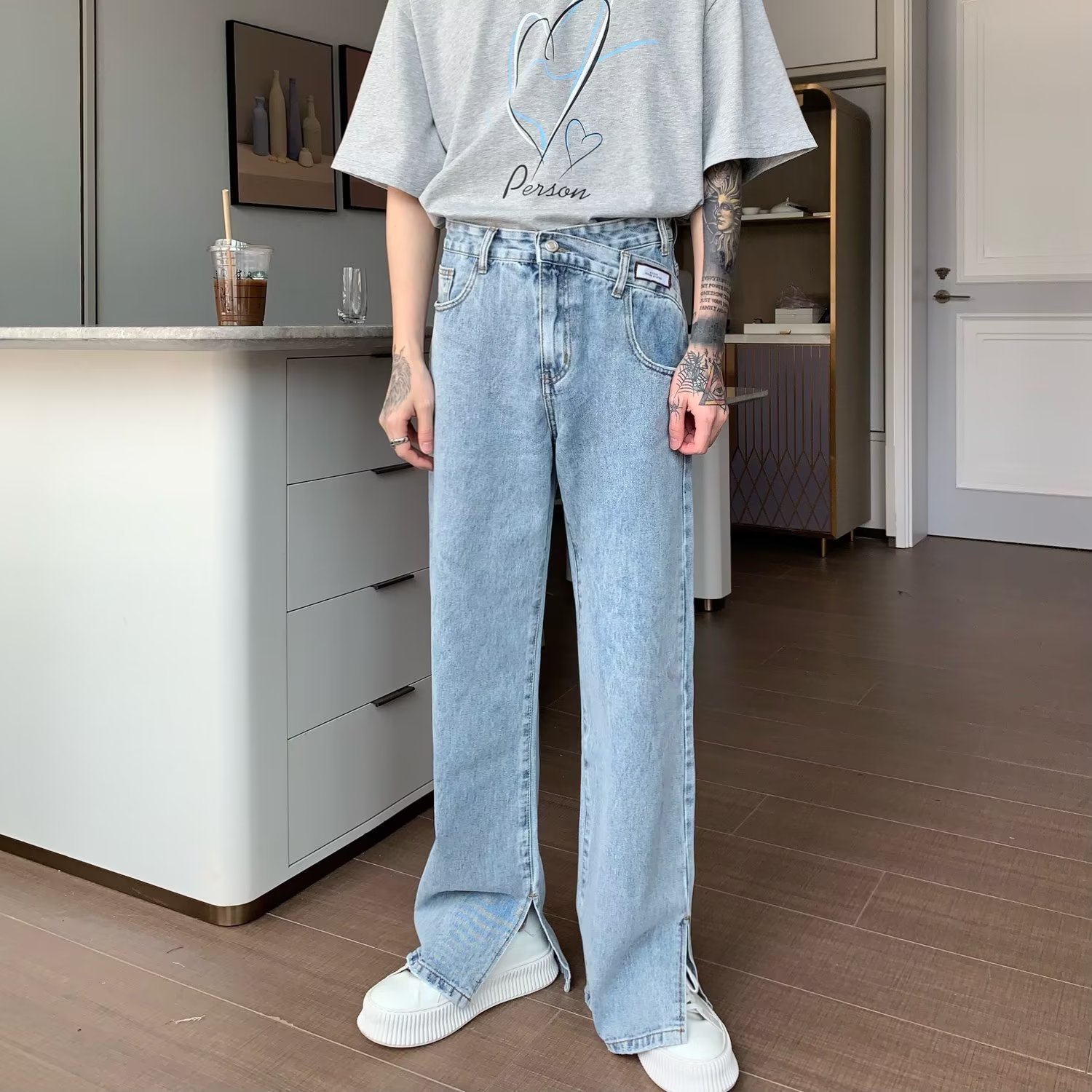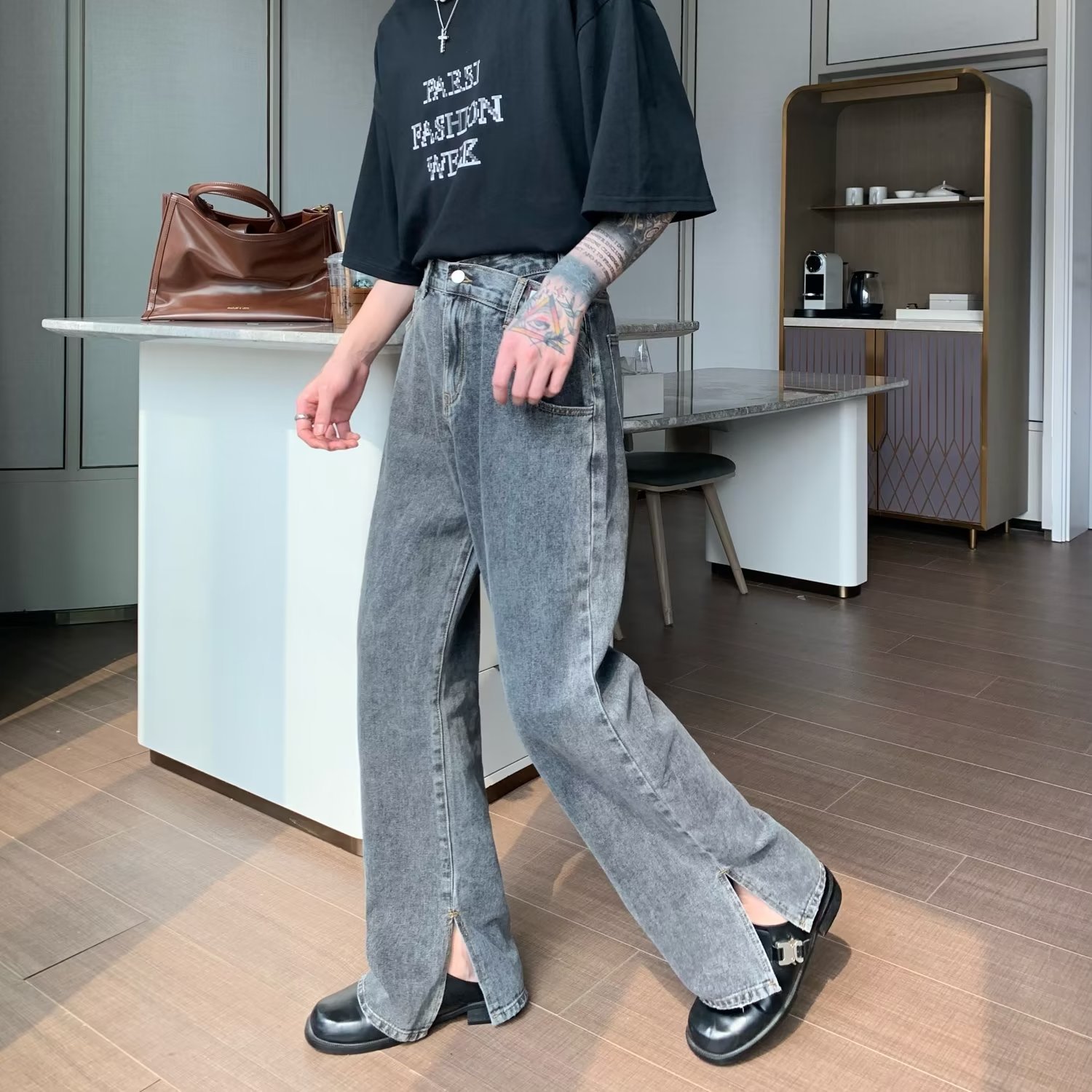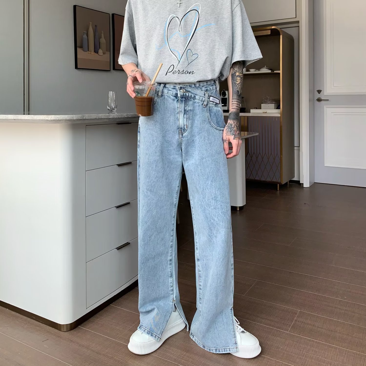밝은 색상의 스트레이트 레그 진 남성용 한국식 유행 드레이프 와이드 팬츠 일본식 슬림핏 팬츠 스플릿 플레어 팬츠스토어 가기