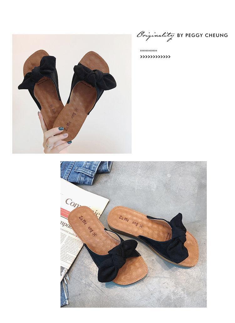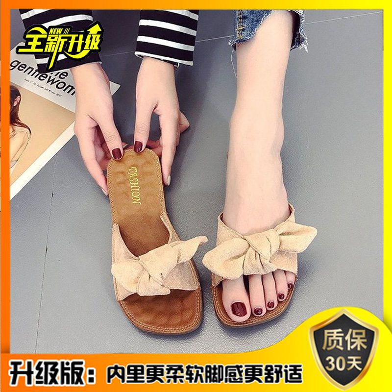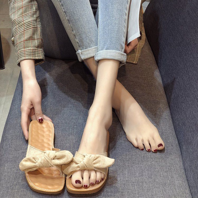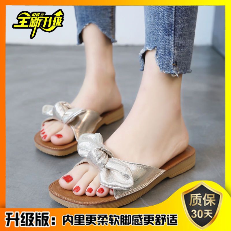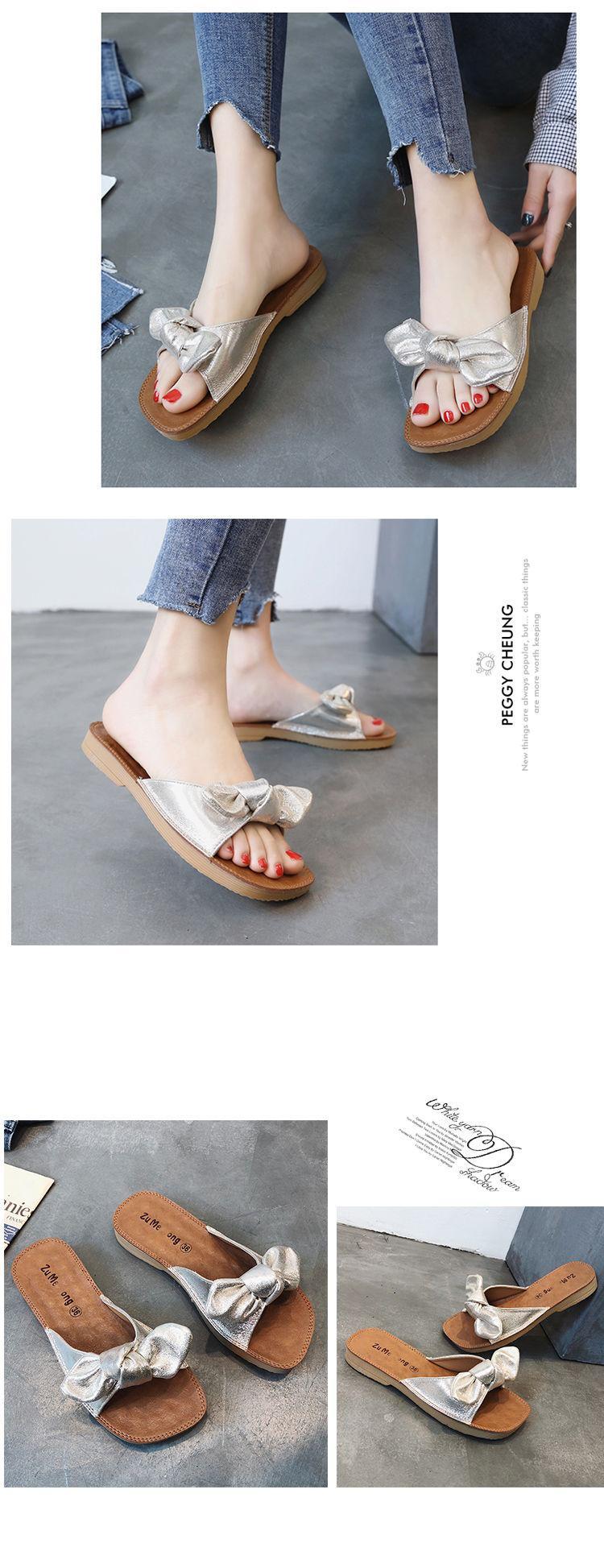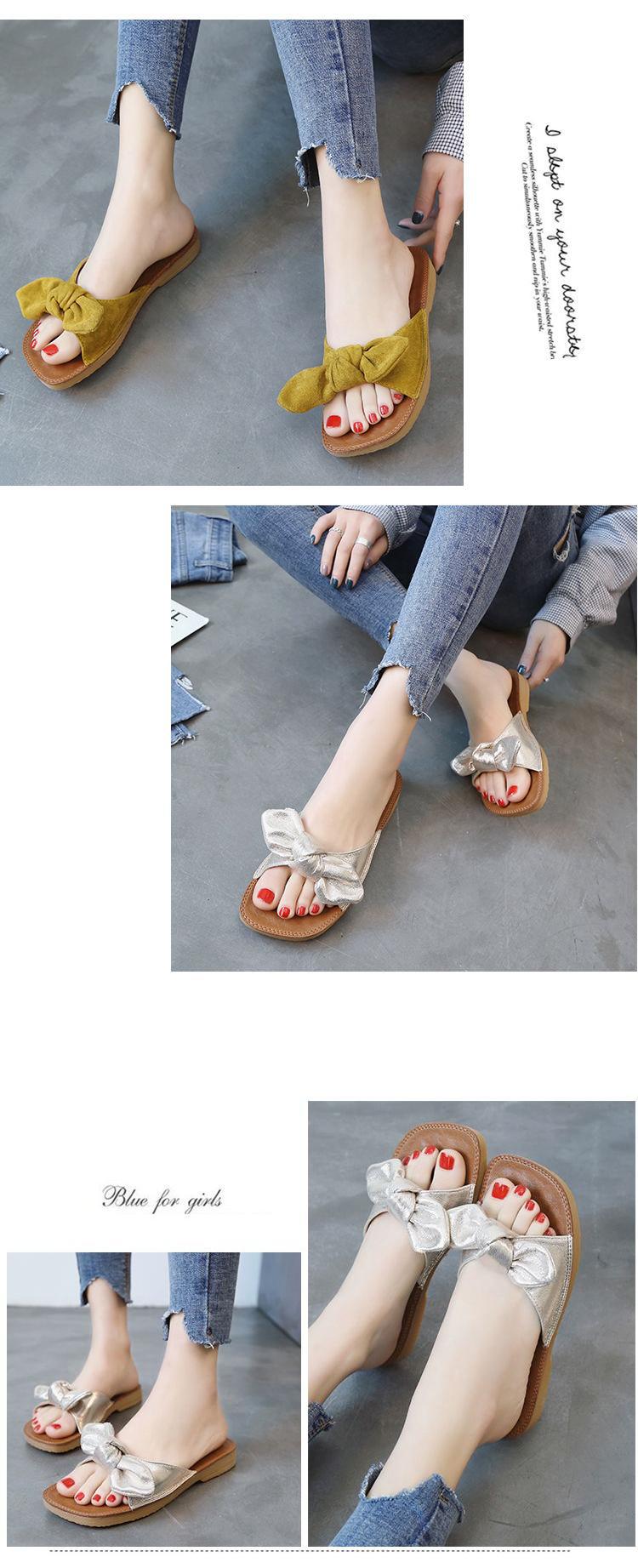 여름 2023 새로운 두꺼운 슬리퍼 플랫 보우 슬라이드 달콤한 모든 매치 편안한 비치 슈즈 여성 신발스토어 가기