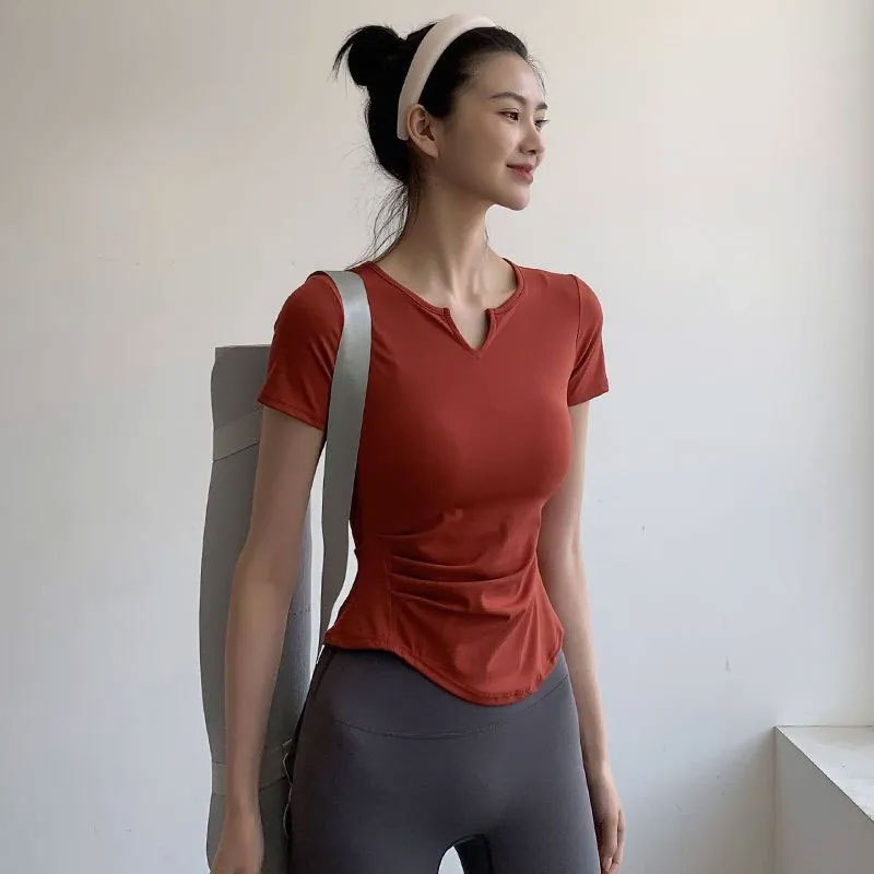 모닝 런 요가 의류 봄과 가을 의류 전문 트레이닝 러닝 피트니스 티셔츠 스포츠 여성용 속건 V-넥 허리 탑