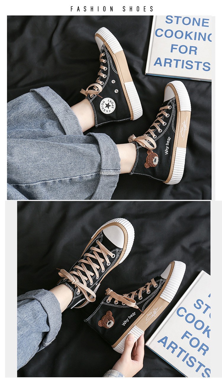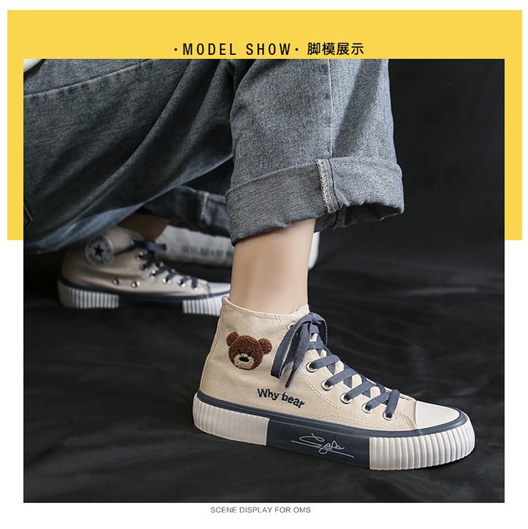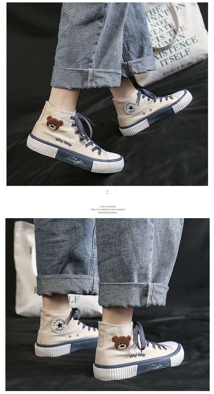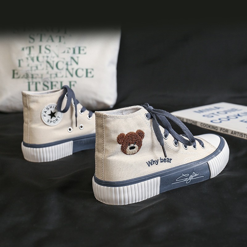 봄 2023 새로운 한국 스타일 베어 하이탑 캔버스 신발 여성 학생 캐주얼 신발 가황 신발 단층 신발 여성용 흰색 신발스토어 가기
