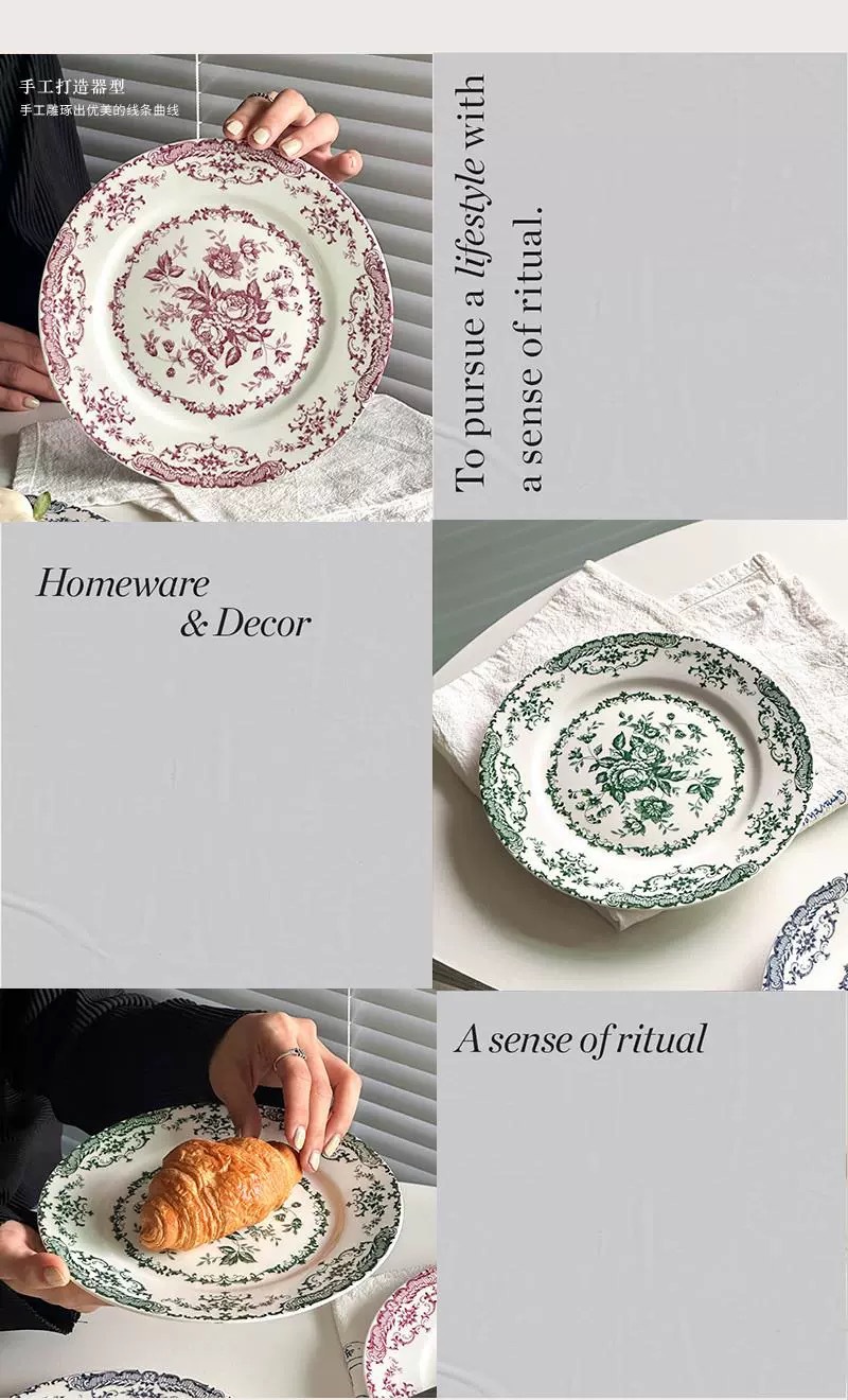 프랑스 스타일 장미 꽃 세라믹 디너 플레이트 가정용 접시 클래식 인쇄 유약 컬러 스파게티 샐러드 디저트 서양 접시