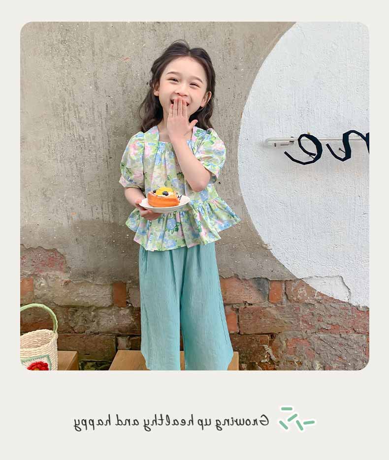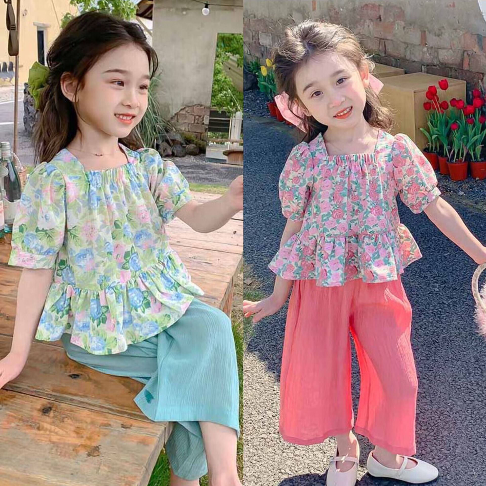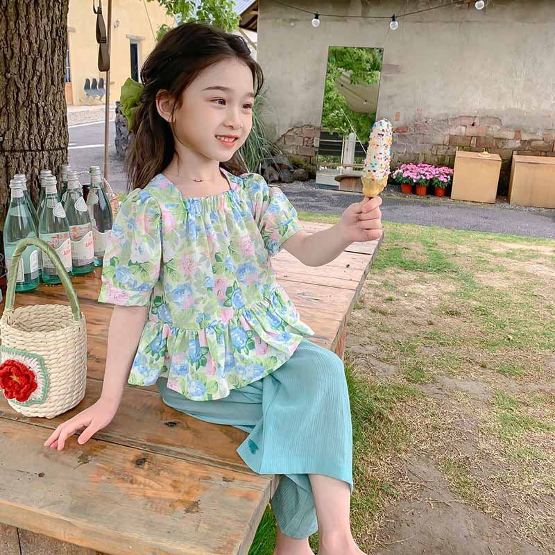 여자 세트 여름 새로운 작은 신선한 꽃 반팔 재킷 + 바지 2 종 세트 중소 어린이 머리 세대스토어 가기