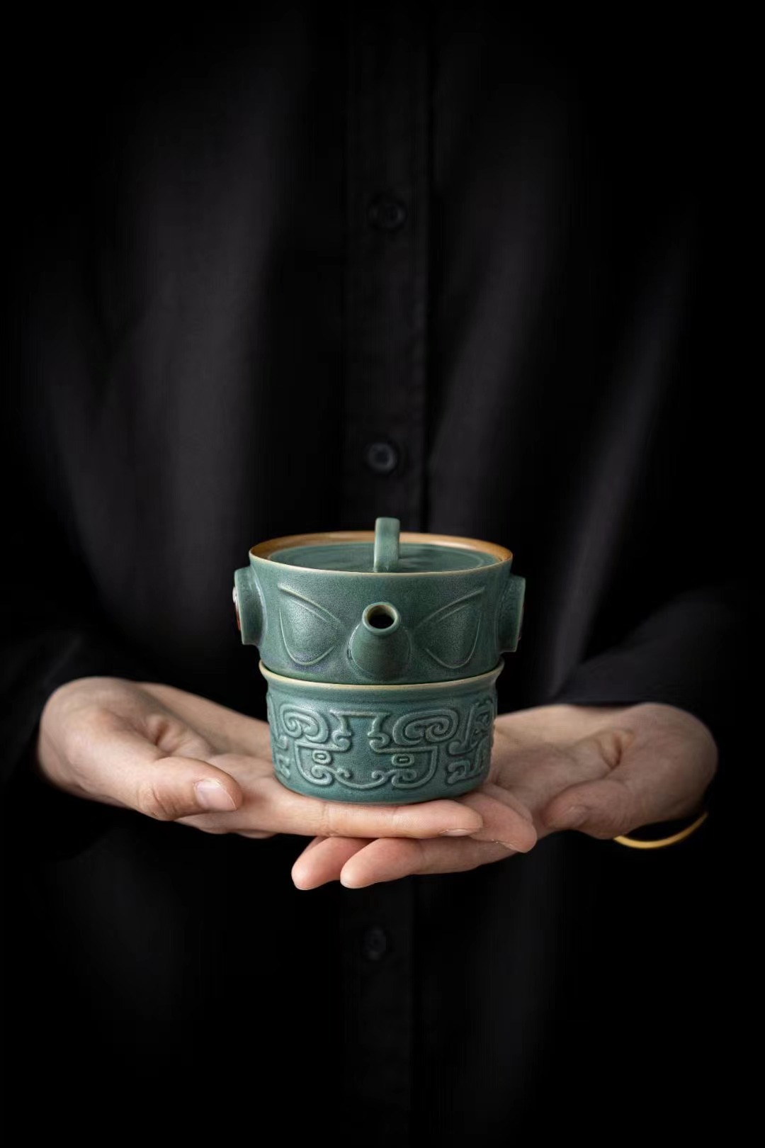 Wenchuang Sanxingdui 익스프레스 컵 한 냄비 두 컵 휴대용 여행 차 세트 세트 청동 마스크 가정용 야외 주전자스토어 가기