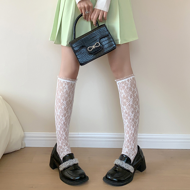 화이트 레이스 중공 양말 어린이 중간 길이 양말 봄과 여름 얇은 일본 귀여운 로리타 JK 송아지 더미 스타킹