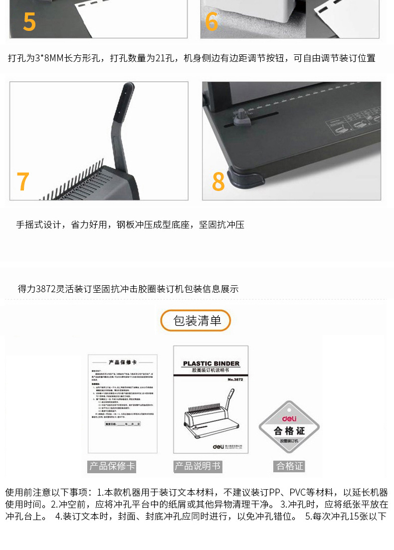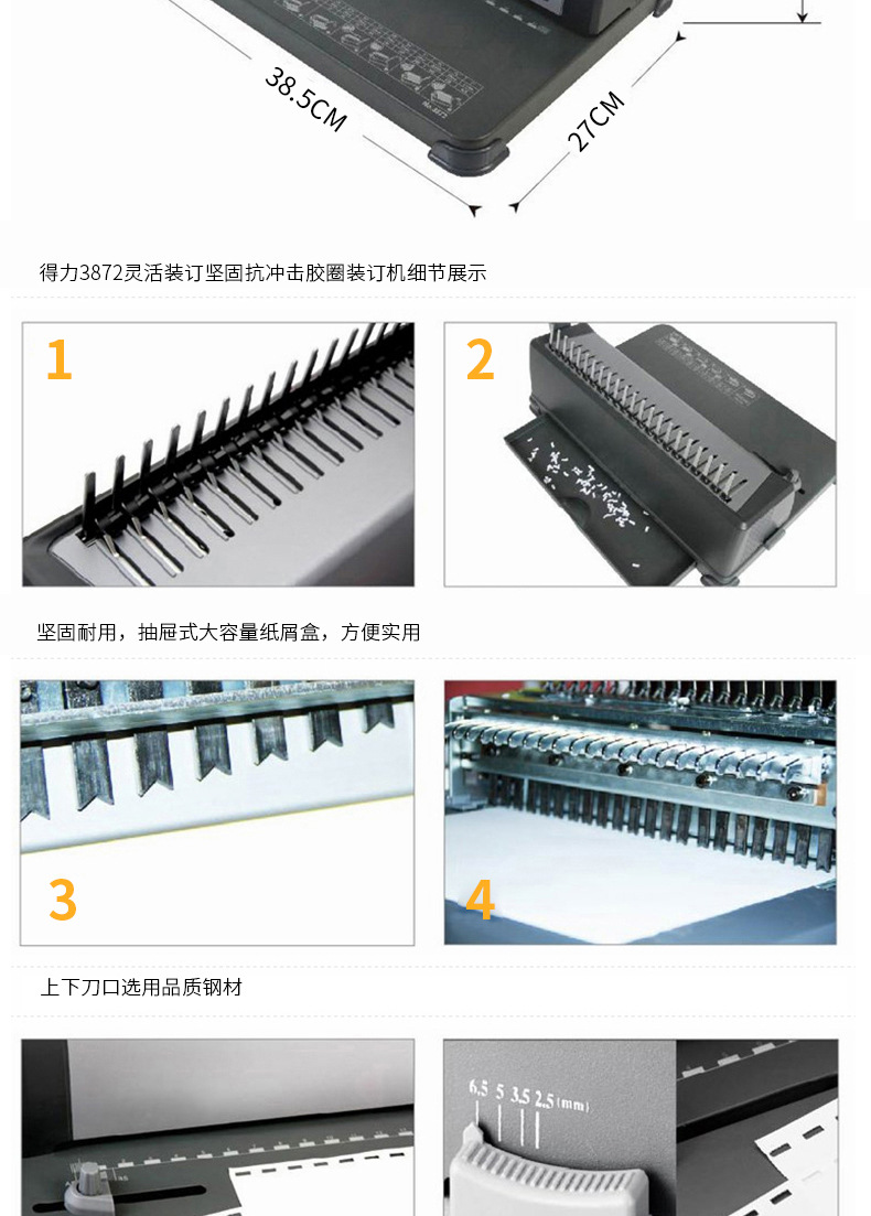 델리 빗 제본기 3870/3871/3872 파일 계약 텐더 A4 파일 클립 스트립 고무 링 펀칭기
