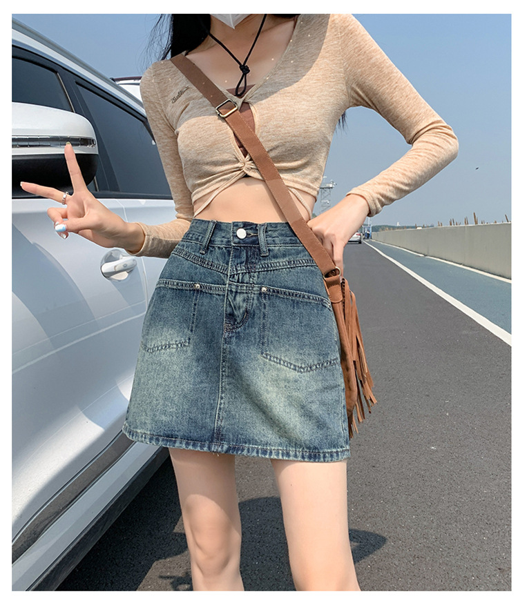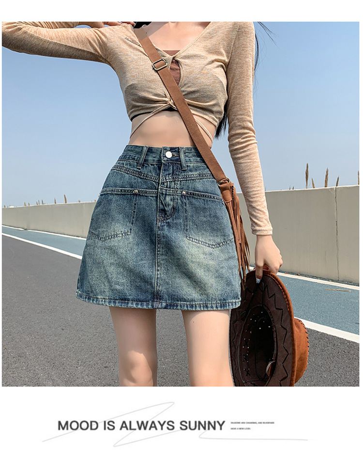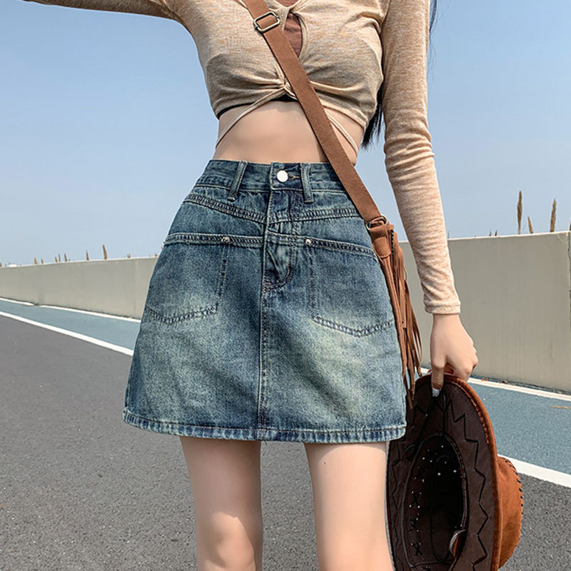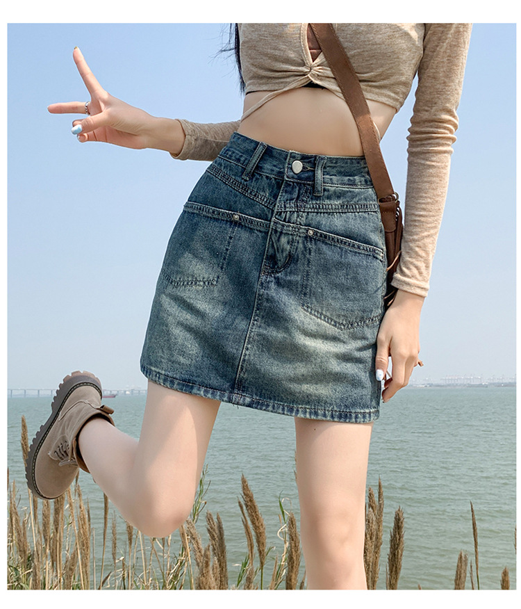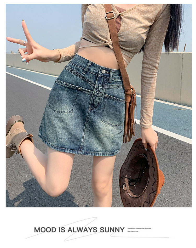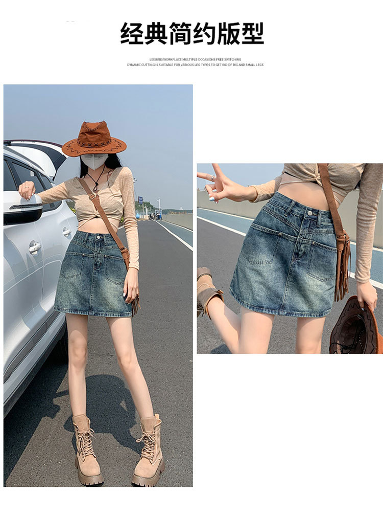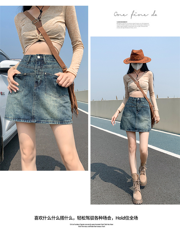 포켓 디자인 스플릿 데님 스커트 여성의 트렌디 한 빈티지 하이 웨이스트 틈새 살 커버 A 라인 엉덩이 반 길이 스커트스토어 가기
