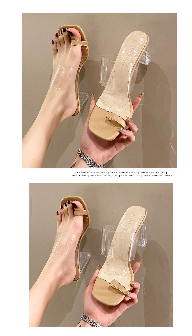 여성용 투명 청키 힐 슬리퍼 여름 야외 착용 2023 여름 새로운 사각형 발가락 요정 하이힐 패션 우아한 샌들