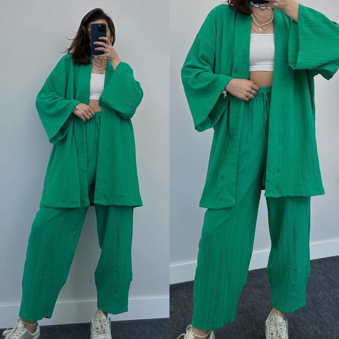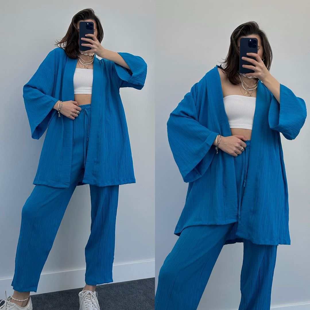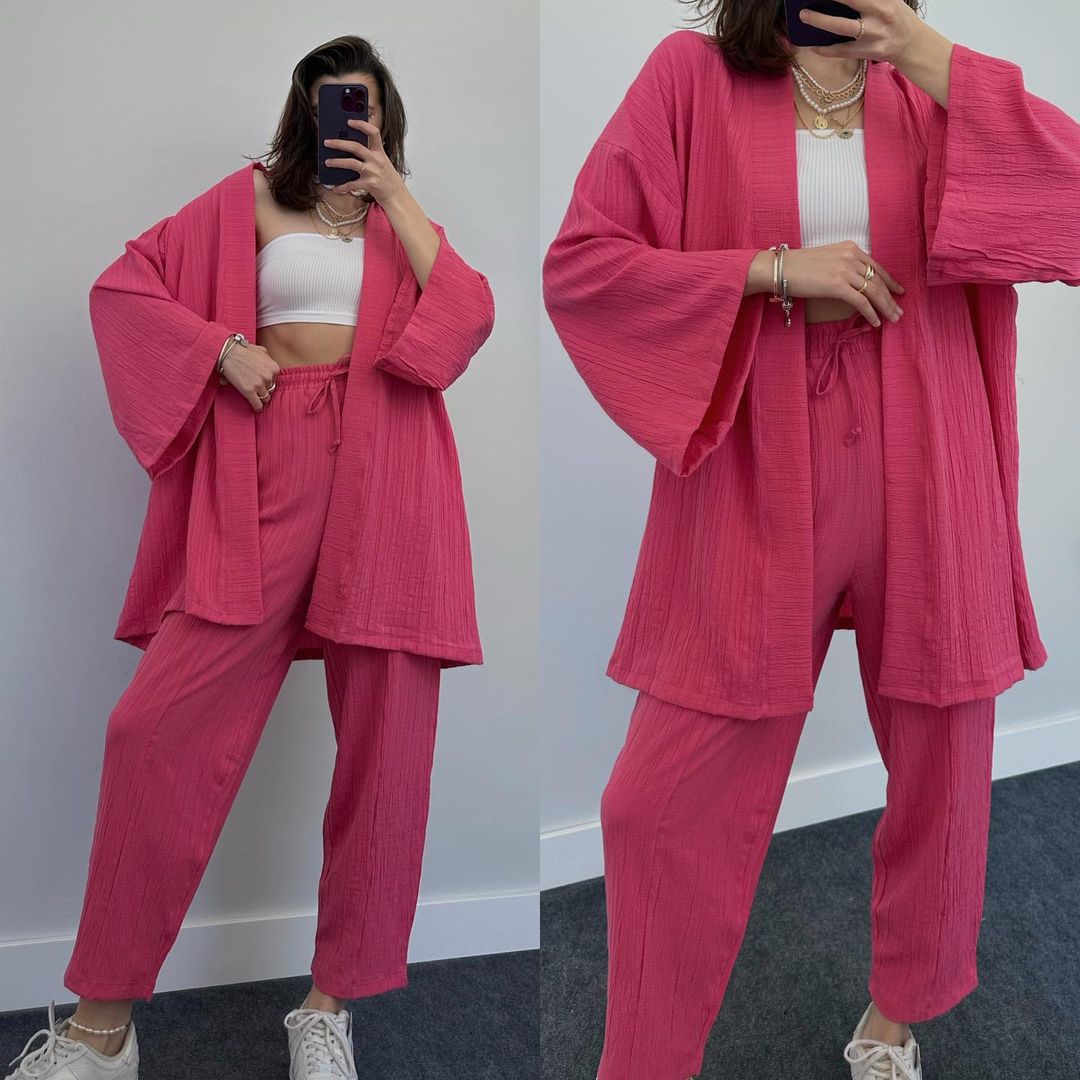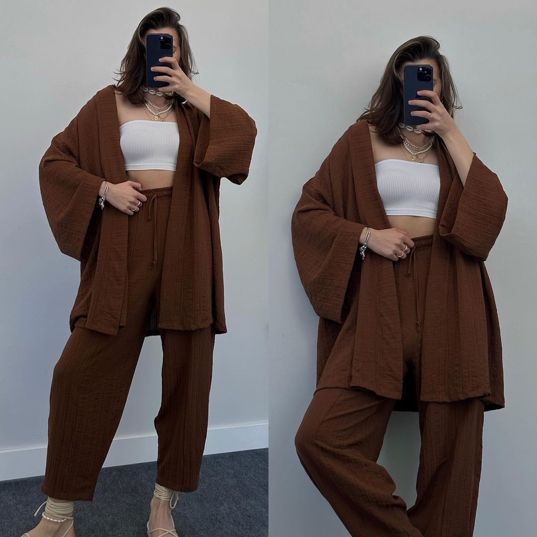 2023 국경 유럽 및 미국 아마존 여성 단색면 및 린넨 느슨한 긴팔 카디건 와이드 레그 크롭 팬츠 캐주얼 세트스토어 가기