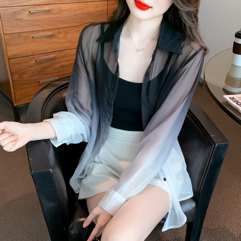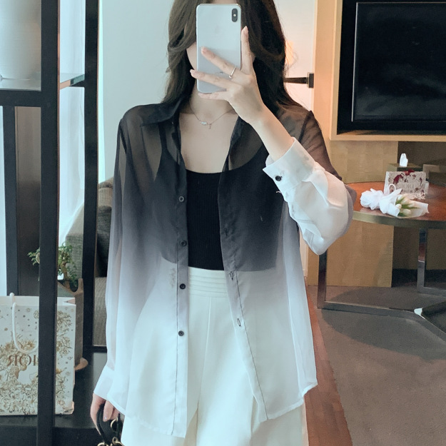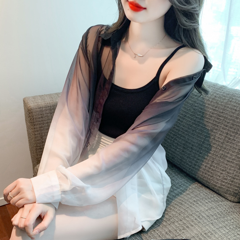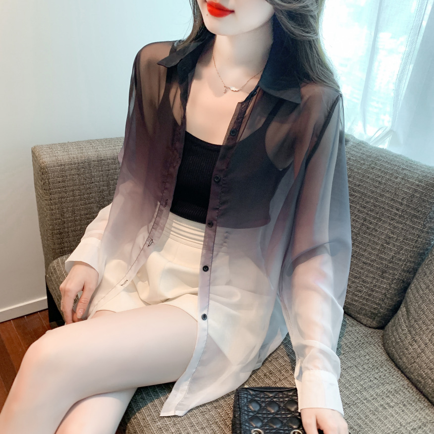 한국 스타일 느슨한 태양 보호 의류 여성 2023 여름 새로운 그라디언트 셔츠 안티 UV 가디건 얇은 코트 여성 탑