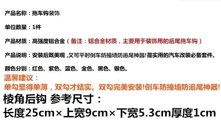 配件清单:1*拖车钩 2*螺丝 4*垫片 2*螺帽