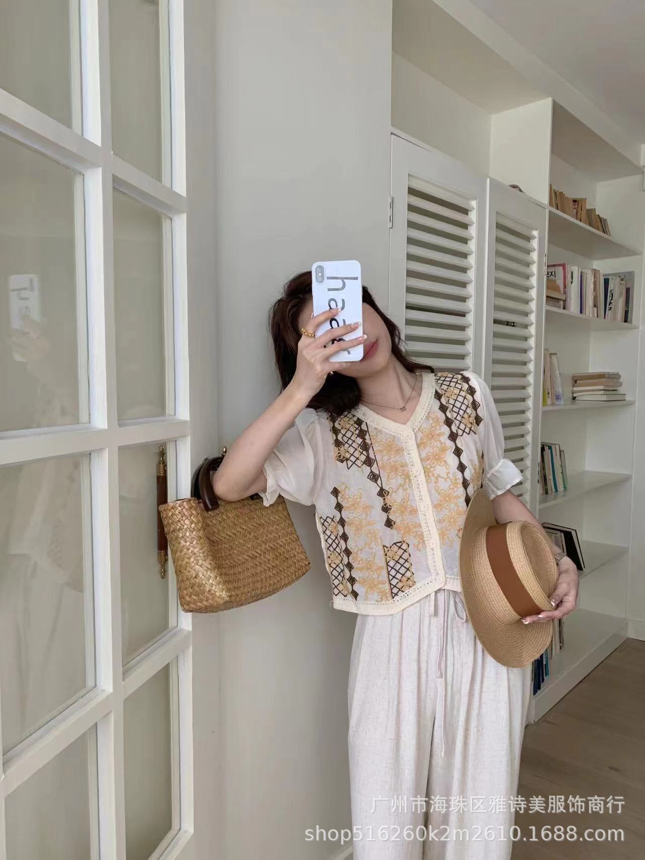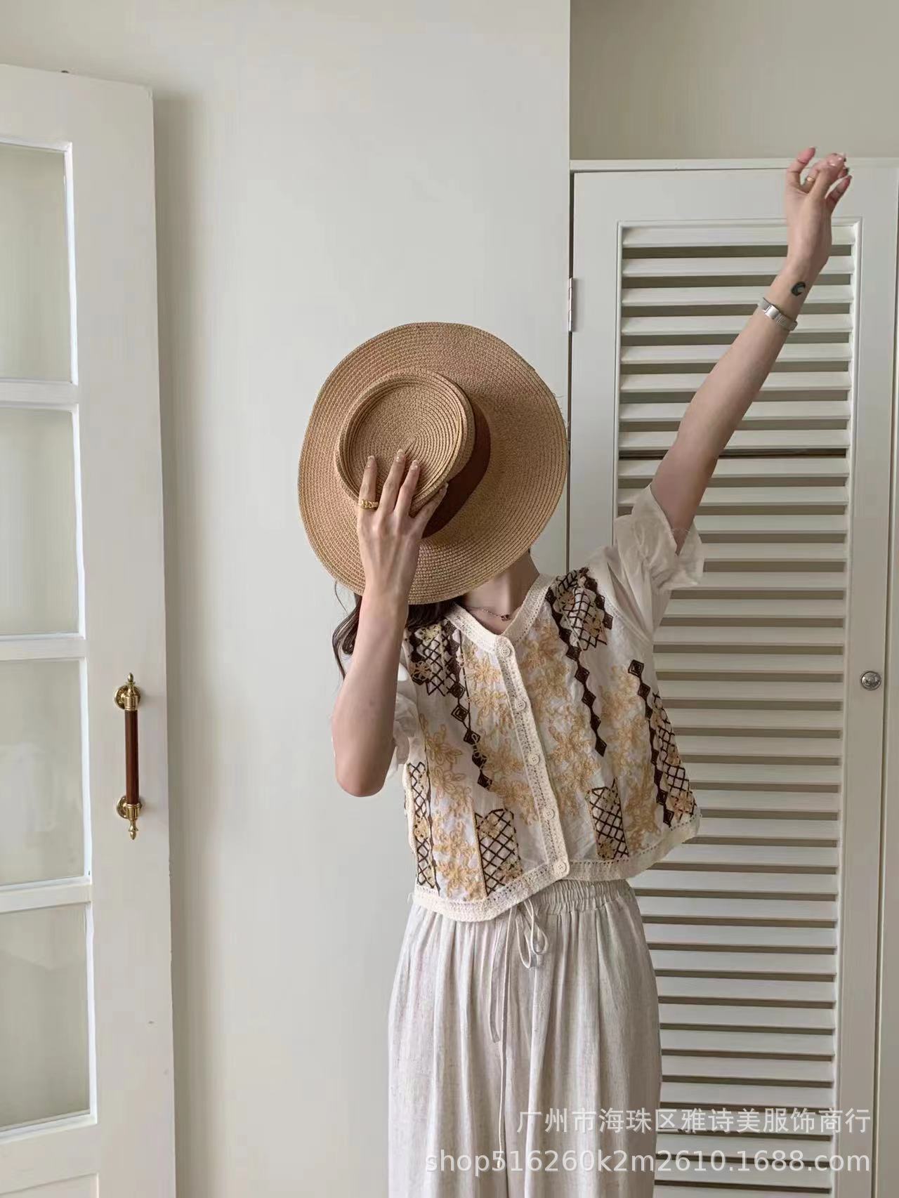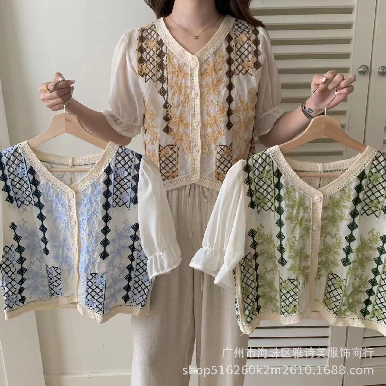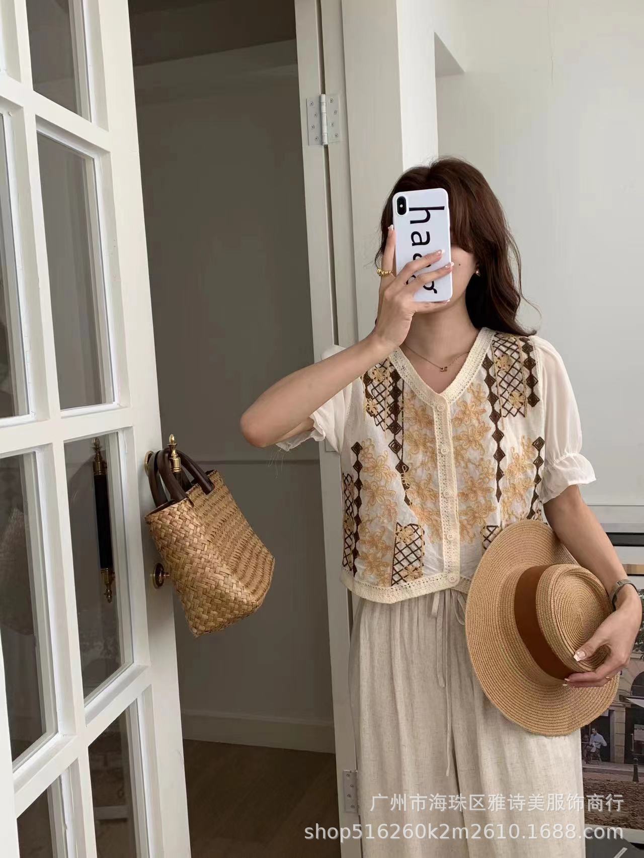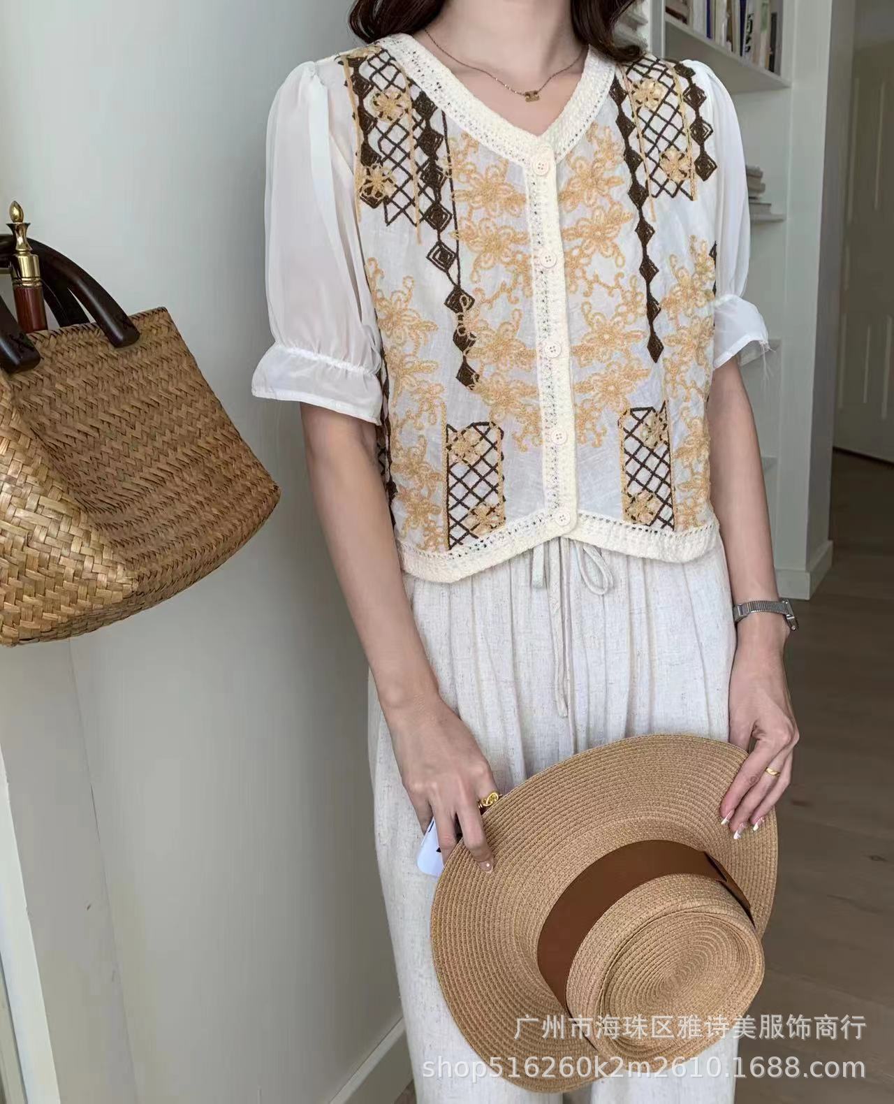 달콤하고 매운 빈티지 꽃 중공 크로 셰 뜨개질 니트 쉬폰 셔츠 여자의 여름 디자인 감각 틈새 느슨한 짧은 탑 유행스토어 가기