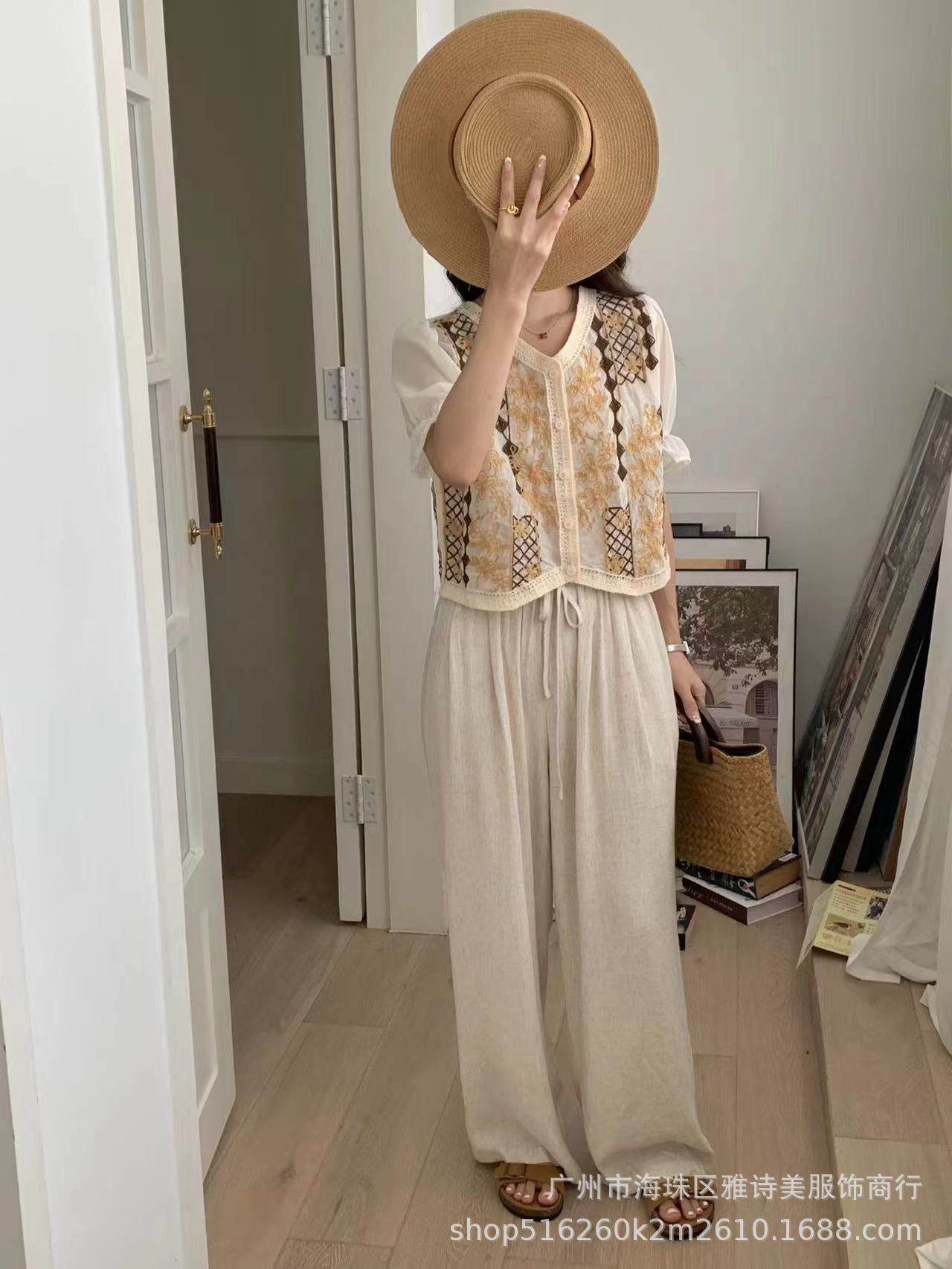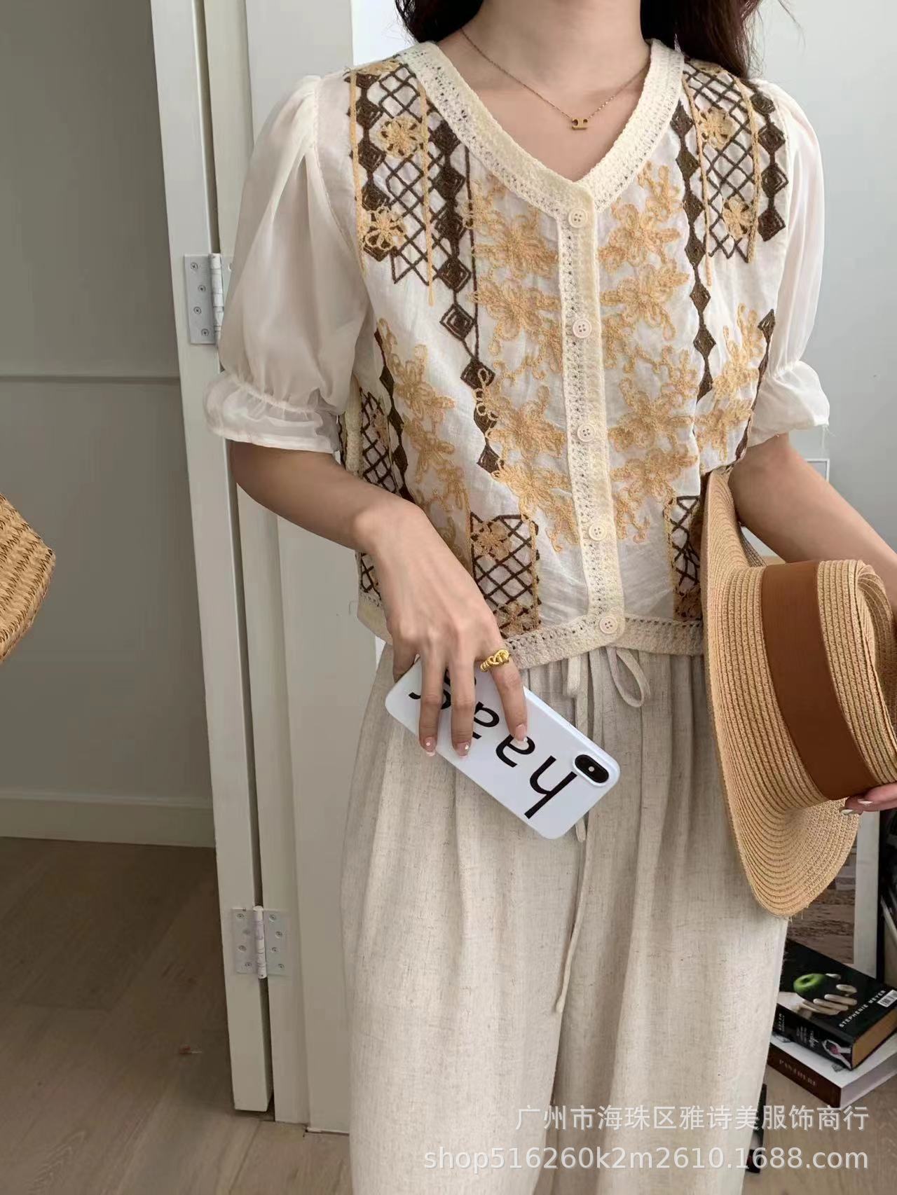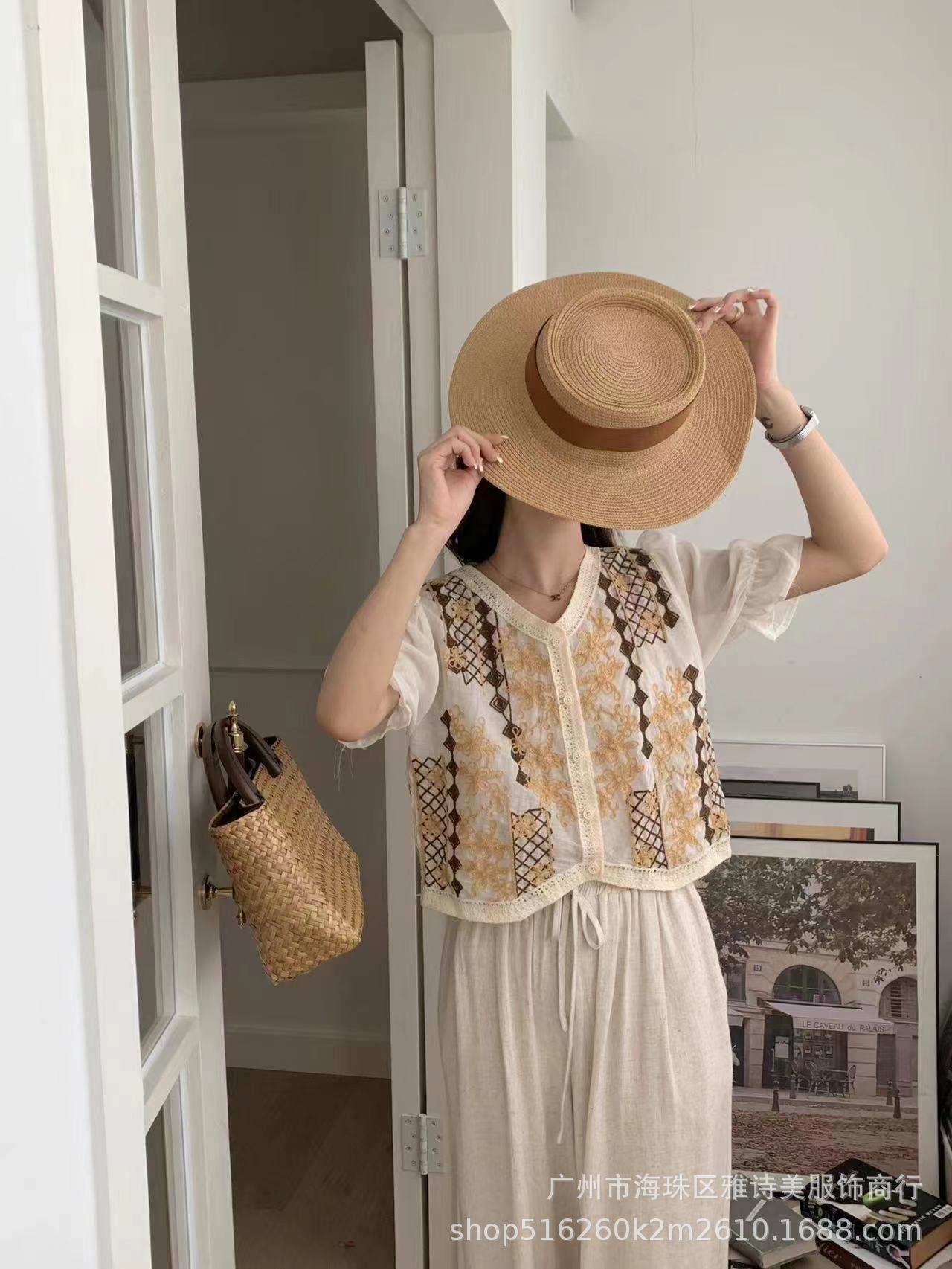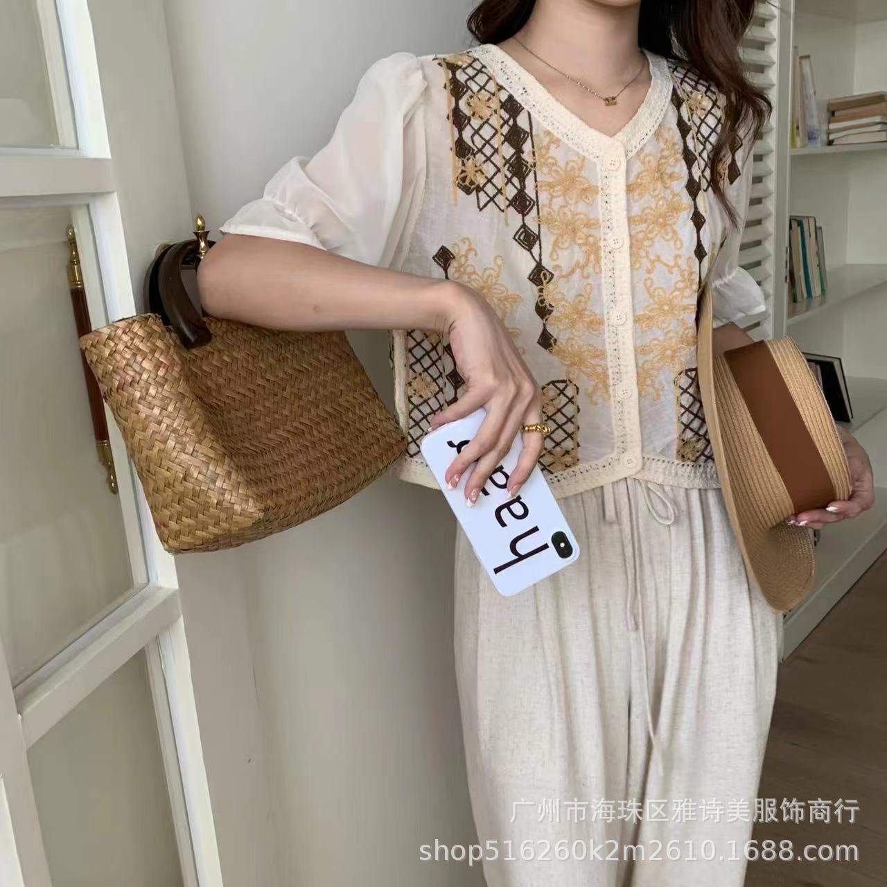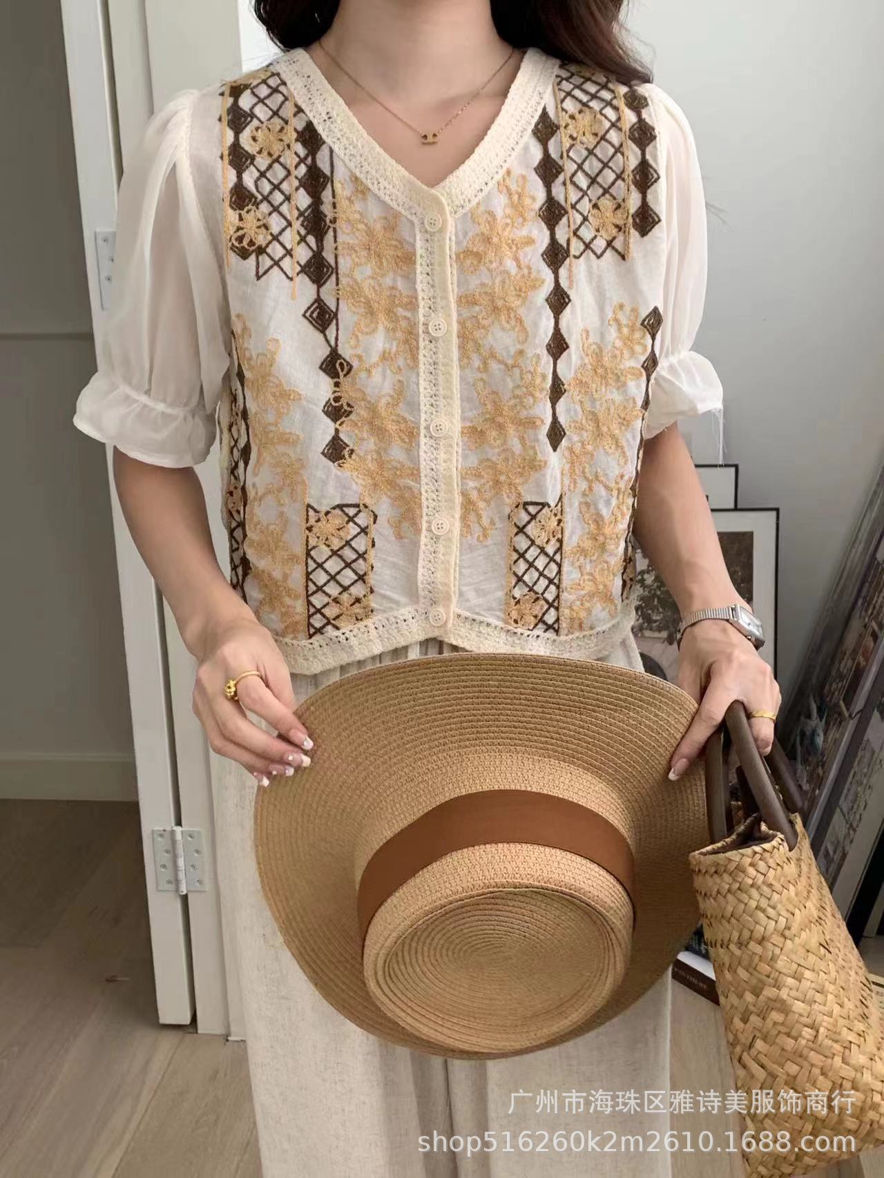 달콤하고 매운 빈티지 꽃 중공 크로 셰 뜨개질 니트 쉬폰 셔츠 여자의 여름 디자인 감각 틈새 느슨한 짧은 탑 유행스토어 가기